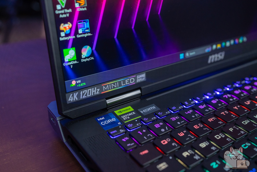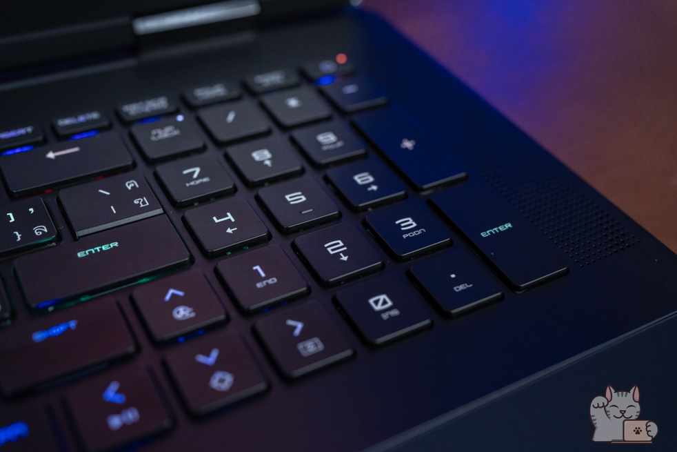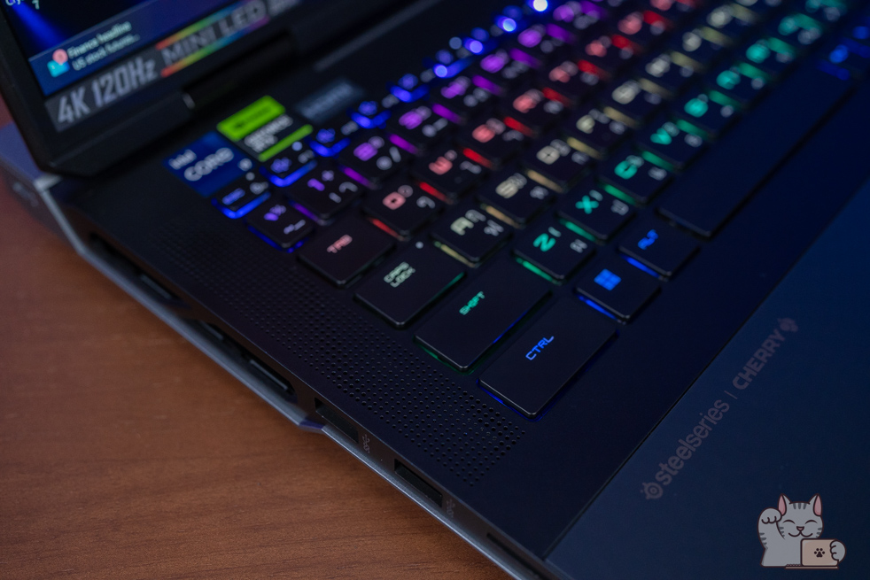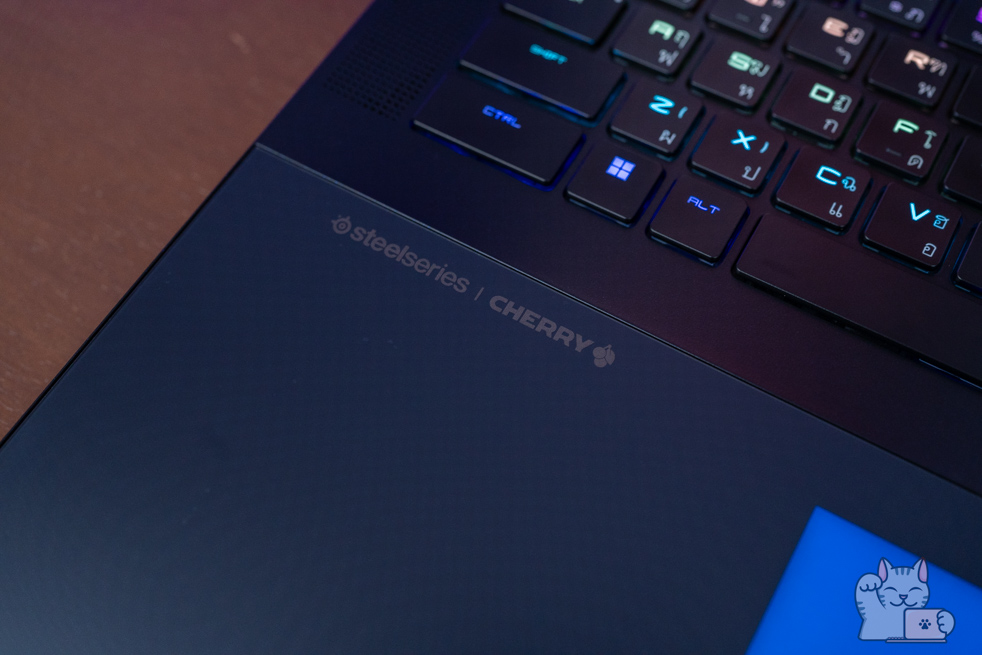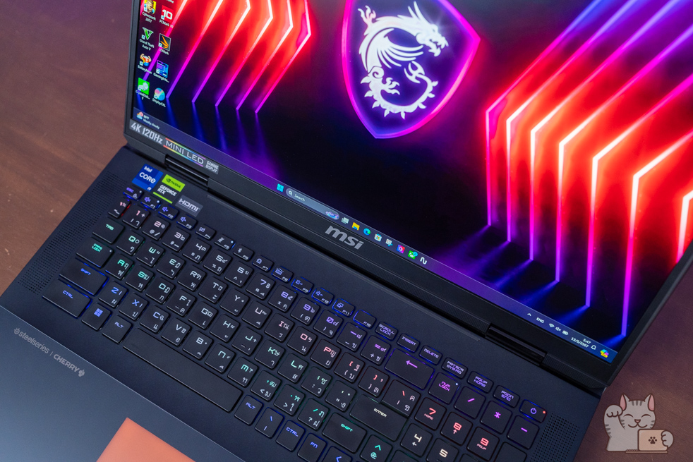 คีย์บอร์ดของ MSI Titan 18 HX โดดเด่นมากๆ และหาจากรุ่นอื่นไม่ได้ จากการที่ใช้ Cherry Mechanical Per-Key RGB Gaming Keyboard ที่ร่วมพัฒนากับแบรนด์ SteelSeries โดยพัฒนาและออกแบบมาสำหรับการเล่นเกมบน Gaming Notebook จาก MSI ระดับท็อปโดยเฉพาะ ทั้งอารมณ์การตอบสนองของแป้นพิมพ์ แรงกด และการใช้ปุ่มหลายๆ ปุ่มพร้อมๆ กัน นอกจากนี้ยังมี Hotkey ตรงปุ่ม F9 ของชุดแป้นคีย์บอร์ด เพื่อปรับเปลี่ยนโปรไฟล์สีของ Steelseries GG ที่เราตั้งค่าเอาไว้