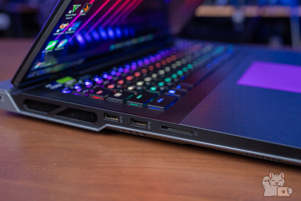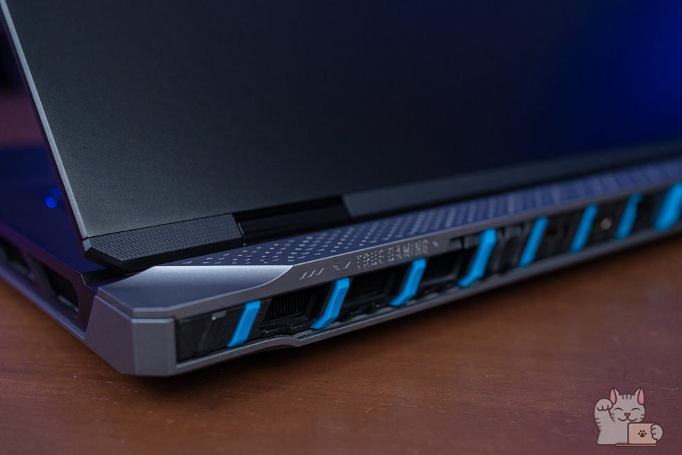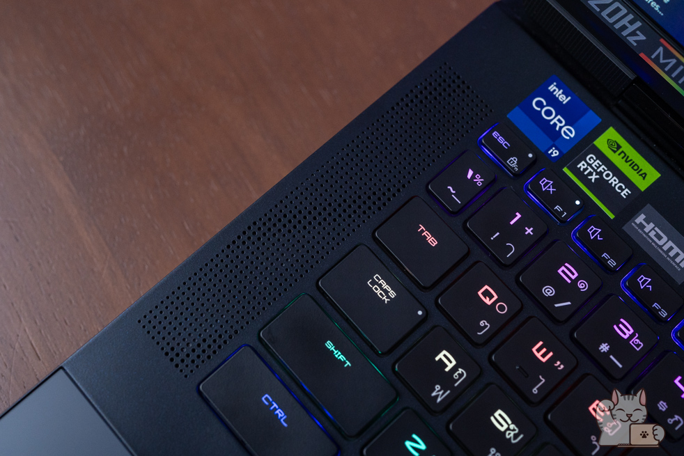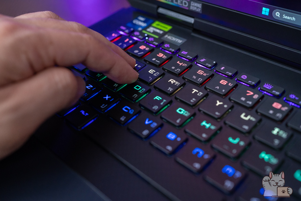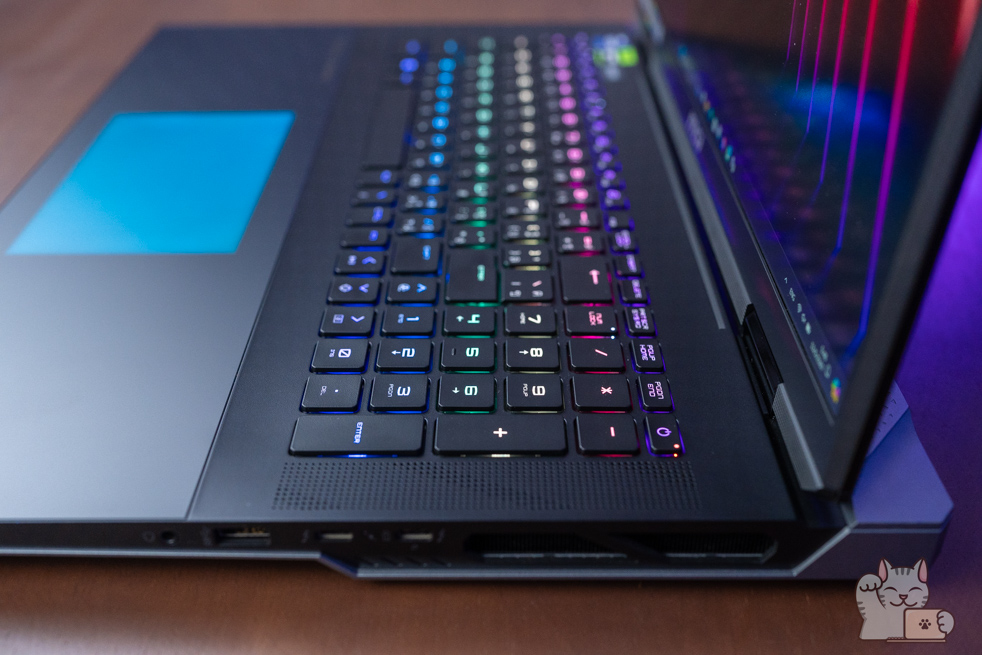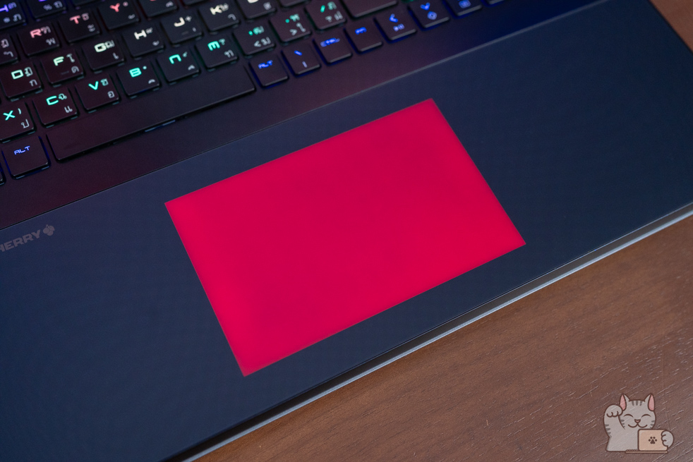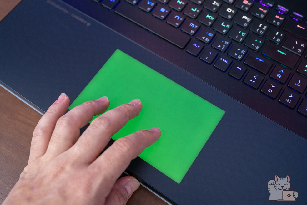 รวมไปถึงในการกดปุ่ม Fn แต่ละครั้ง ไฟทั้งหมดจะดับลง พร้อมไฮไลน์เป็นไฟสีแดงให้เด่นขึ้นมาชัดเจนว่าเราใช้าน Hot Key อะไรได้บ้าง นับได้ว่าเป็นในส่วนที่เจ๋งไม่ซ้ำ Gaming Notebook แบรนด์อื่นๆ เลย อีกทั้ง RGB Haptic Touchpad มีขนาดที่ค่อนข้างใหญ่ดูแล้วสมส่วนกับตัวเครื่อง ส่วนดีไซน์นั้นก็ใช้เป็นแบบซ่อนปุ่ม ซึ่งจะเป็นการใช้มอเตอร์สั่น เสมือนว่าเป็นเรากดจริงๆ โดยการควบคุมสามารถทำได้เป็นอย่างดี สัมผัสแบบผิวลื่นๆ ไม่เป็นรอยนิ้วมือได้ง่ายๆ พร้อมได้ความแม่นยำ