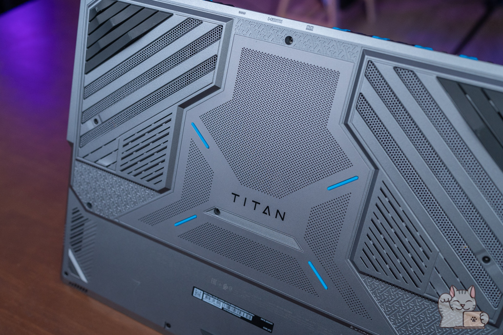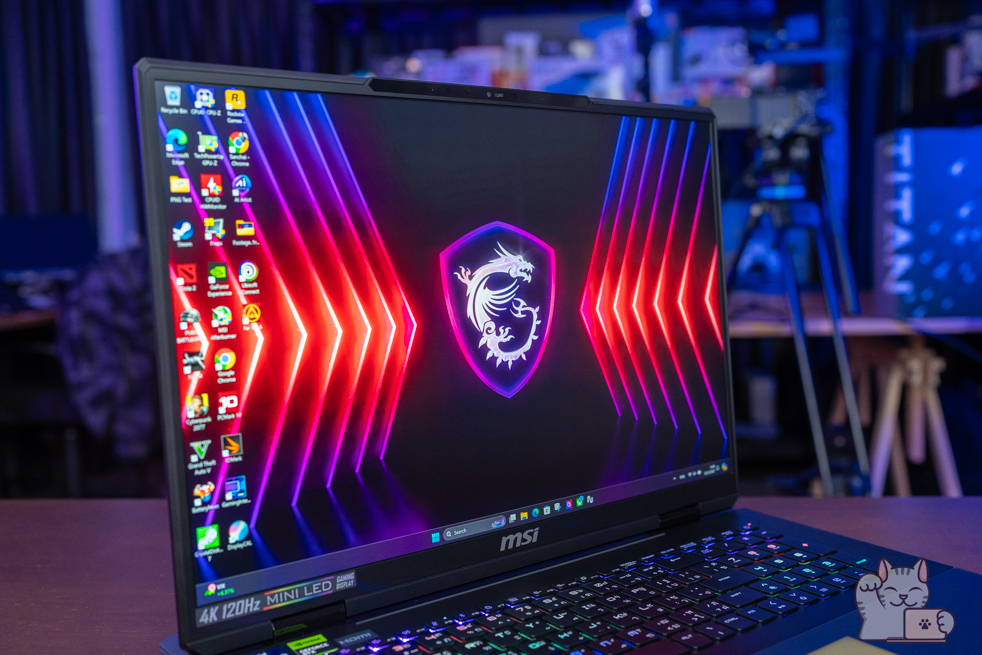 มีการอัปเกรด MSI Titan 18HX ต่อยอดมาจาก Titan GT77 HX ในส่วนของหน้าจอขนาด 18″ ด้วยพาเนล IPS เกรดสูง พร้อม Mini LED (powered by AmLED technology from AUO) รองรับ HDR ความว่าง 1000nit ที่ความละเอียด UHD+ (3840 x 2400px) ที่ Refresh Rate ลื่นไหลที่ 120Hz พร้อมขอบเขตสีระดับ P3 100% รองรับการเล่นเกมได้ความละเอียดสูง และลื่นไหลไปพร้อมกัน หรือในงานทำงาน Creator มืออาชีพก็นับว่ายอดเยี่ยม ลำโพง Dynaudio ทำงานแบบ 6 ตัว ตัวละ 2W โดยมี Woofer ช่วยให้สีมาครบทุกย่าน ระบบเสียง วัสดุตัวเครื่องเป็น Magnesium-Aluminum Alloy มาพร้อมกับน้ำหนัก 3.6 กิโลกรัม แต่มีความบางที่ 24 มิลลิเมตรเท่านั้น