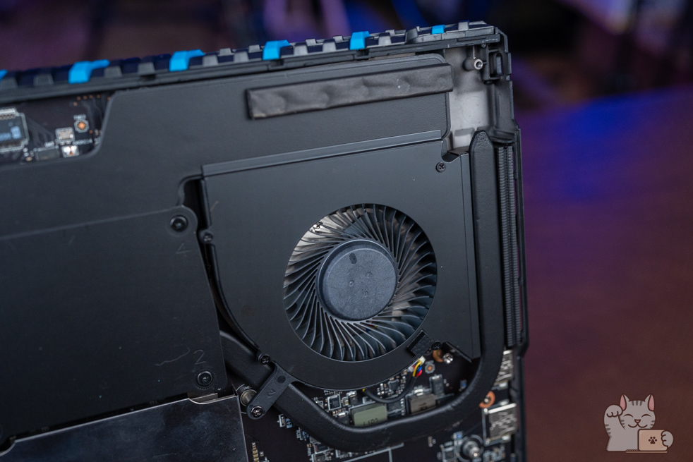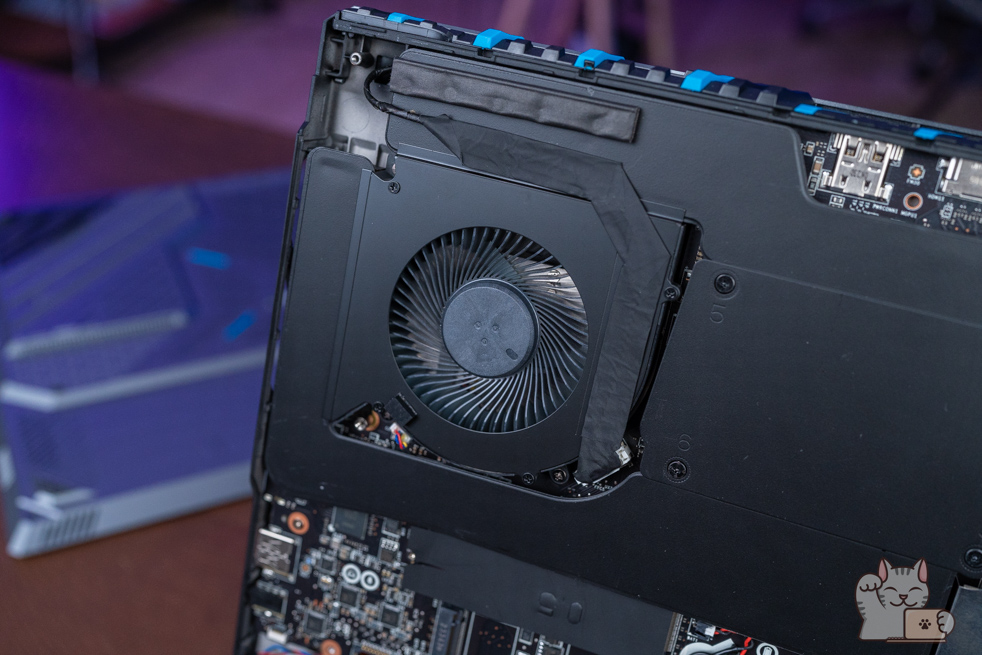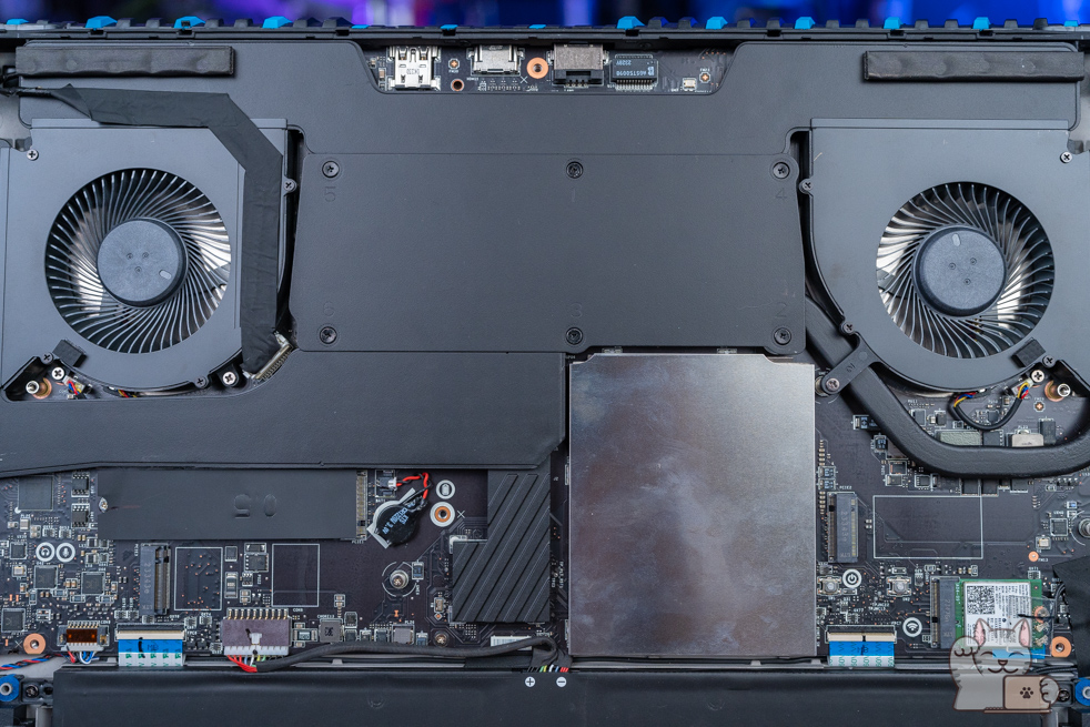 การแกะทั้งฝาล่างทั้งหมดของ MSI Titan 18 HX สามารถทำได้ง่ายๆ เพียงแค่ไขน็อตไม่กี่ตัว โดยฝาล่างนั้นเป็นพลาสติกที่แข็งแรงแต่ก็พอยืดหยุ่นได้ หลังจากนั้นก็ค่อยๆ แงะแกะทีละส่วนขึ้นอย่างช้าๆ ส่วนประกอบภายในอื่นๆ เห็นได้ชัดถึงระบบระบายความร้อน Vapor Chamber cooler ประกอบด้วยแผ่นนำความร้อนแบบใหม่ขนาดใหญ่ พร้อมพัดลมขนาดใหญ่ 2 ตัว เป่าออก 4 ทิศทาง สอดประสานรับกันตลอดทั้งระบบ ทำให้ความร้อนที่เกิดขึ้นนั้นมีทิศทางในการระบายความร้อนที่ยอดเยี่ยม
