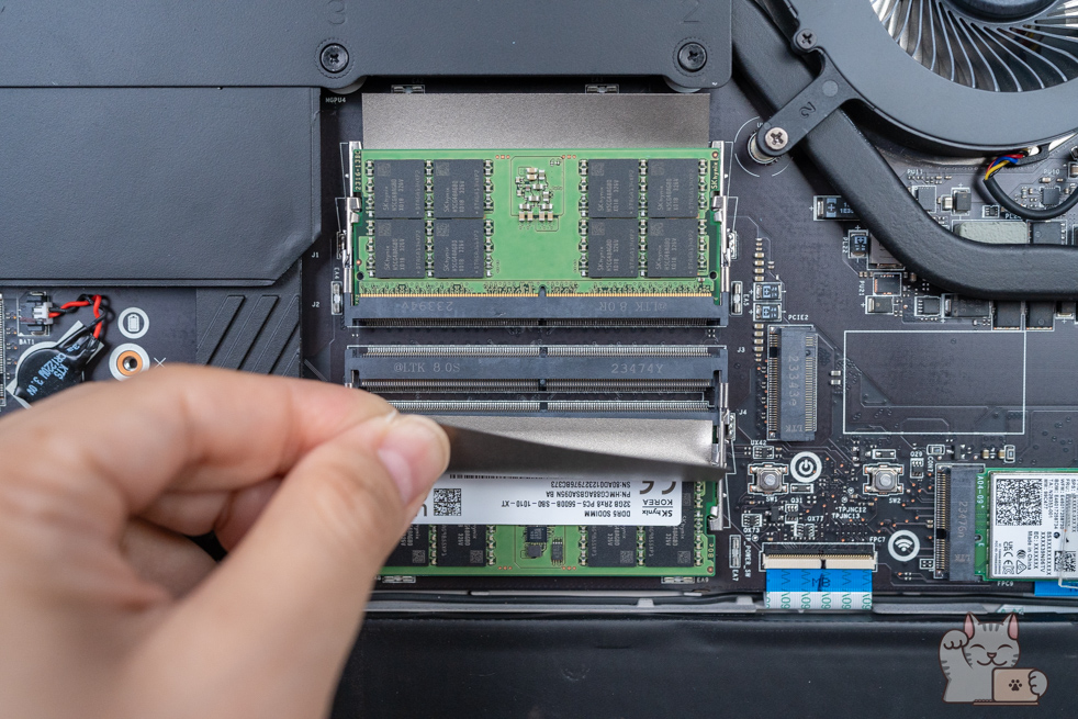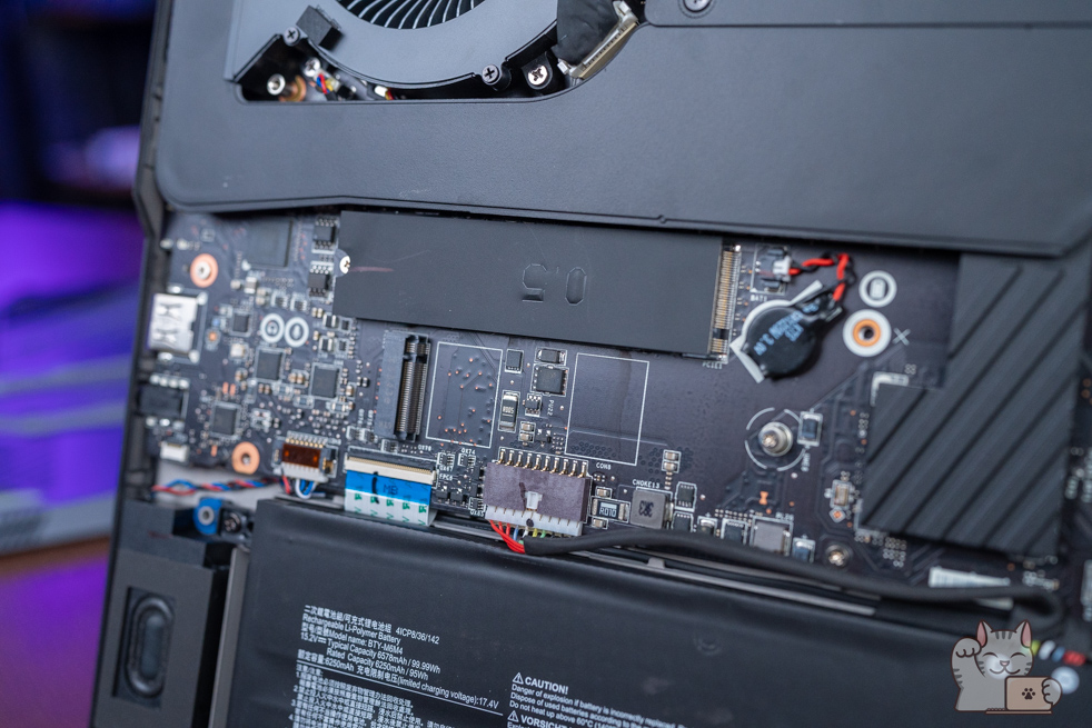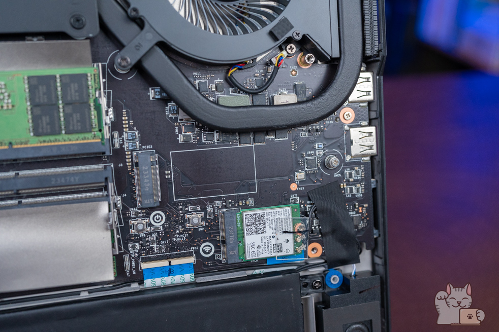 พร้อมเห็นว่าช่องติดตั้งหน่วยความจำแรมที่ใส่มาแล้วขนาด 32GB DDR5 x 2 แถว รวมเป็น 64GB แน่นอนว่าเป็นแบบ SO-DIM พร้อมมีฝาครอบ รองรับการอัปเกรดสูงสุดที่ 192GB รวมไปถึงยังมีที่เก็บข้อมูลแบบ SSD M.2 NVMe PCIe Gen 4 แบบ 2TB x 1 รองรับใส่ SSD Gen 4 อีก 1 และ Gen 5 อีก 1 เพิ่มได้ทันที ที่ต้องบอกว่าสำหรับการใช้งานทั่วไปเหลือเฟือมากๆ นับได้ว่าเป็น Gaming Notebook อีกรุ่นในตลาดที่ยัดสเปกฮาร์ดแวร์ภายในมาแบบจัดเต็มที่สุด อีกทั้งยังอีปได้อีกเยอะมาก