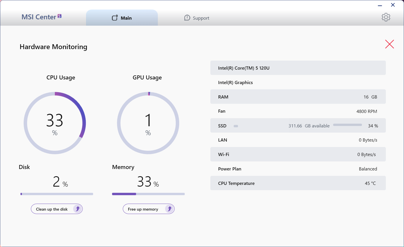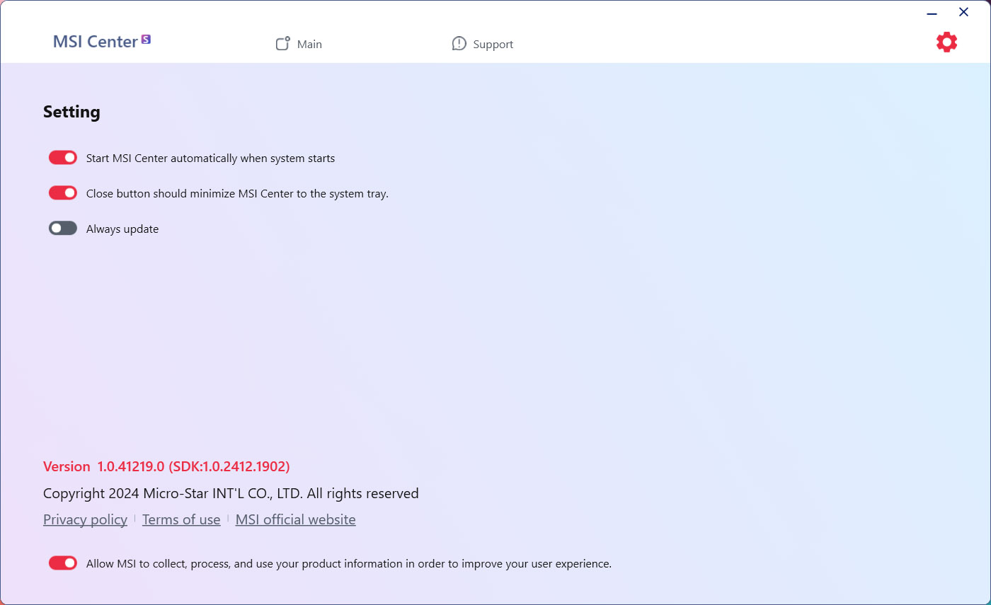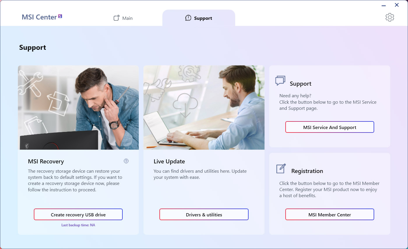 MSI Center S เป็นโปรแกรมสำเร็จรูปที่ออกแบบมาเป็นอย่างดี ซึ่งเป็นโปรแกรมที่ต่อยอดมาจากรุ่นก่อนๆ คือ ใช้งานสะดวก สามารถช่วยเหลือ จัดการการปรับแต่งตั้งค่า MSI Notebook ได้อย่างลงตัว พร้อมได้ธีมที่เข้ากับตัวเครื่อง ถือว่าเป็นอีกหนึ่งไฮไลน์ของทาง MSI ซึ่งแบ่งเป็นหมวดหมู่ต่างๆ เพื่อให้ง่ายต่อการใช้งาน โดยหน้าเมนูต่างๆ แบ่งตามลักษณะการใช้งานที่ชัดเจน รวมไปถึงการอัปเดทซอฟต์แวร์ต่างๆ และสามารถดูสภานะการทำงานได้ ซึ่งสามารถจัดการได้ง่ายยิ่งกว่าเดิมอีกด้วย เรียกได้ว่าโดยรวมแล้วเป็นเวอร์ชั่นที่ดีขึ้นใช้ได้ดีขึ้น