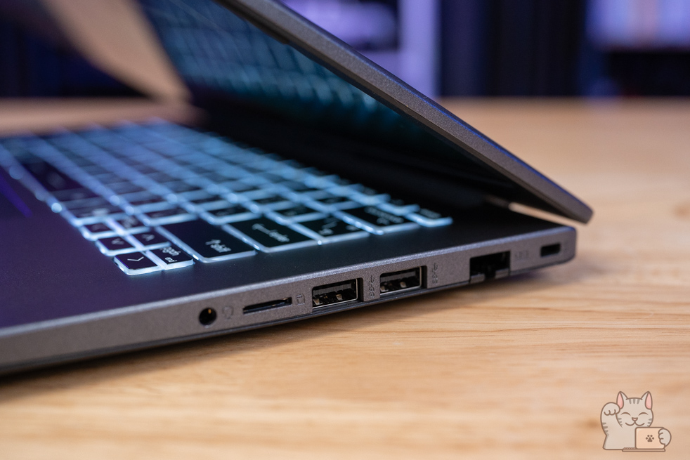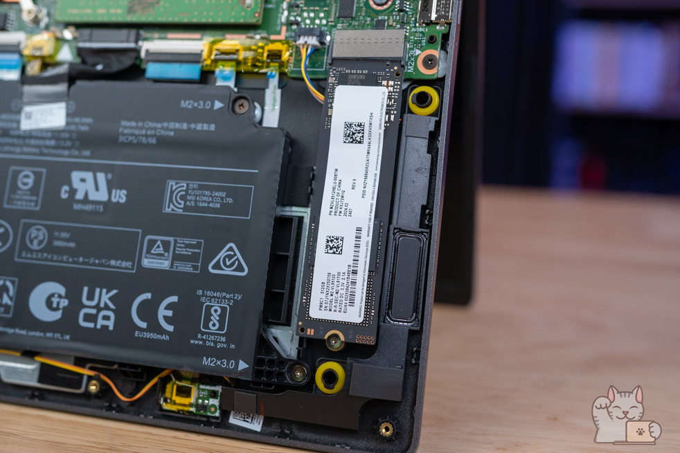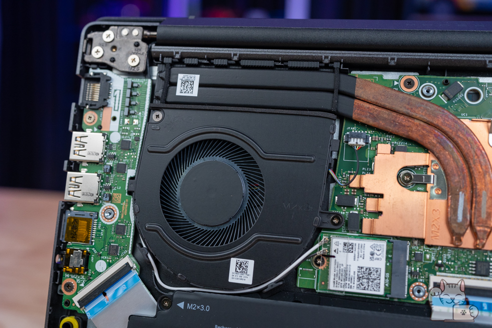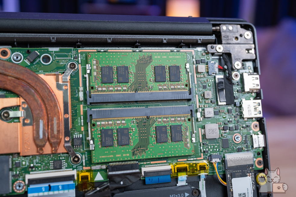 เมื่อแกะออกมาแล้วก็จะเห็นเม็ดแรมโดยเป็นการติดตั้งแรม SO-DIMM มาแล้วขนาด 16GB ที่มาตรฐาน DDR4 (แบบ 8GB x 2) พร้อมรองรับขนาดสูงสุดที่ 64GB (32GB x 2) และจะเห็นถึง SSD แบบ M.2 NVMe PCIe Gen 4 ความจุ 512GB แน่นอนว่าอัปเกรดได้ด้วย แต่จะถอดของเดิมออกด้วย ให้การใช้งานเป็นไปอย่างลื่นไหลไร้คอขวด ที่ต้องบอกว่าสำหรับการใช้งานทั่วไปจนไปถึงทำงานตัดต่อวีดีโอที่ไม่ซับซ้อนมาก สำหรับสเปกฮาร์ดแวร์ภายในถือว่าพอใช้งานได้เลยล่ะ อีกทั้งโครงสร้างภายในมีกสารเสริมโลหะเพื่อเพิ่มความแข็งอีกด้วย