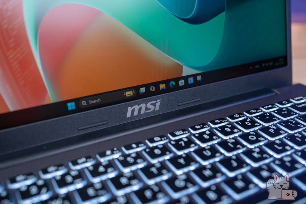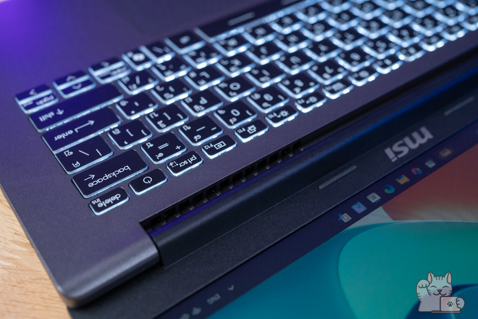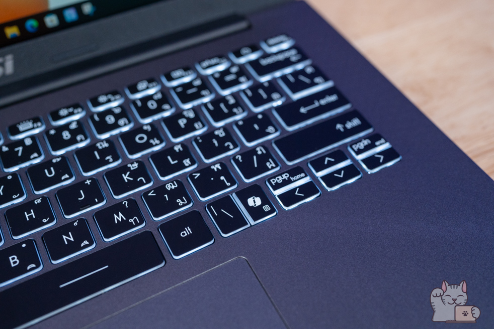 คีย์บอร์ดของ MSI Modern 14 มีระยะยุบของปุ่มอยู่ที่ 1.5 มิลลิเมตร แน่นอนว่าตอบสนองของแป้นพิมพ์ต่อแรงกดได้ดีเยี่ยม เด้งรับกับนิ้วดีมากๆ ด้วยการที่รูปแบบปุ่มมีขนาดที่ใหญ่เหมาะสม ที่สำคัญด้วยไฟ LED สีขาวสวยงาม เข้ากับตัวปุ่มสีดำขอบโปร่งแสงเป็นอย่างดี พรีเมียมสุดๆ และไม่มีชุด Numpad อยู่แล้ว จากการที่ตัวเครื่องมีมิติที่ลงนั่นเอง โดยมี Hotkey แถวบน และสำหรับปุ่ม Power ของตัวเครื่องจะติดตั้งอยู่มุมขวาบนของชุคคีย์บอร์ด ดูแล้วสวยงามลงตัวเป็นอย่างดี และจากการที่เป็นโน๊ตบุ๊คยุคใหม่ ก็จะมีปุ่ม Copilot มาให้ด้วย