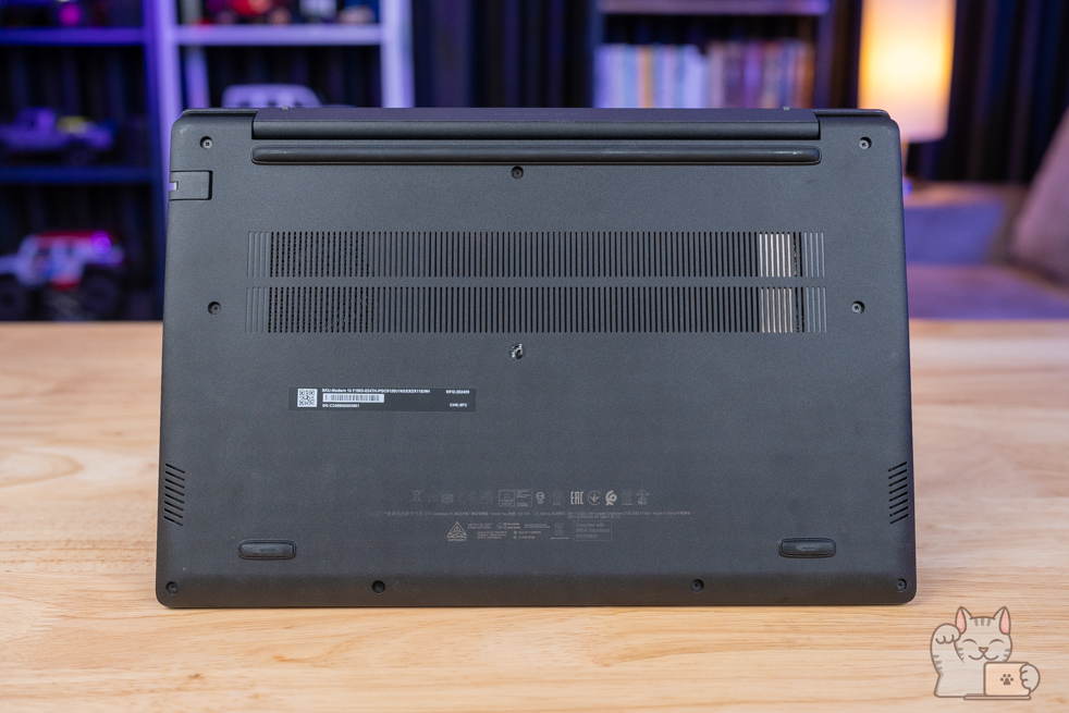 ถ้าใครต้องการจะแกะทั้งฝาล่างทั้งหมดของ MSI Modern 14 เพื่ออัพเกรดหรือทำความสะอาดก็สามารถทำได้ง่ายๆ เพียงแค่ไขน็อตทั้งหมด หลังจากนั้นก็ค่อยๆ แงะแกะทีละส่วนขึ้นอย่างช้าๆ เพียงเท่านี้ก็จะแกะฝาล่างได้ไม่ยากเย็น ส่วนประกอบภายในอื่นๆ ที่มีงานประกอบเรียบร้อยดี ได้ระบบระบายความร้อนเป็นพัดลม 1 ตัว ฮีตไปป์ 2 เส้น พร้อมช่องระบายความร้อน 1 ช่อง ซึ่งการทดสอบบอกได้เลยว่าน่าประทับใจ แม้อาจจะดูไม่จัดเต็มเท่า Gaming Notebook แต่อุณหภูมิก็เย็นพอตัวแล้ว เมื่อเราใช้งานแบบ Full Load ต่อเนื่องเป็นเวลานาน