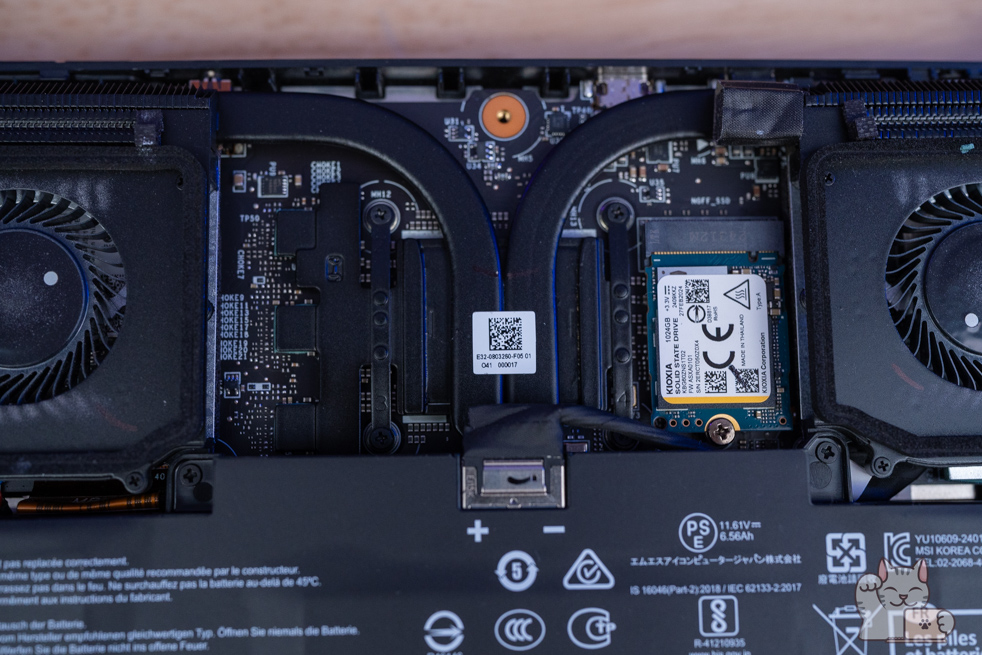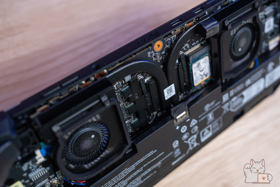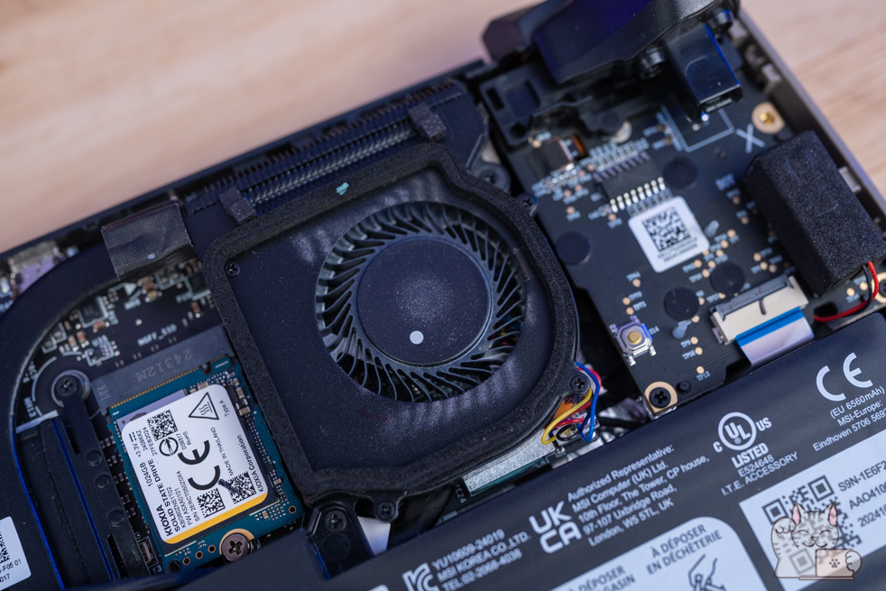 ในส่วนของระบบระบายความร้อนก็จะเป็นระบบ Cooler Boost HyperFlow ซึ่งเน้นในเรื่องของทิศทางการไหลเวียนเข้าออกของลมที่ดีขึ้นกว่าปกติทั่วไป โดยจะมีช่องระบายความร้อนทั้งหมด 2 ช่องเป่าขึ้นด้านบน และสองช่องด้านหลังดูดจากฝาหลัง พร้อม Heat Pipe แบบใหม่ที่บางพิเศษ จำนวน 2 เส้นขนาดใหญ่ที่มีการเชื่อมต่อกัน ทำงานร่วมกับพัดลม 2 ตัว ขนาดกำลังพอดี ส่งผลในการใช้งานแบบ Full Load ทำได้อย่างเสถียรภาพสูง และควรจะมั่นทำความสะอาด ซึ่งการแกะฝาล่างของ MSI Claw 8 AI+ ต้องทำด้วยความระวัง