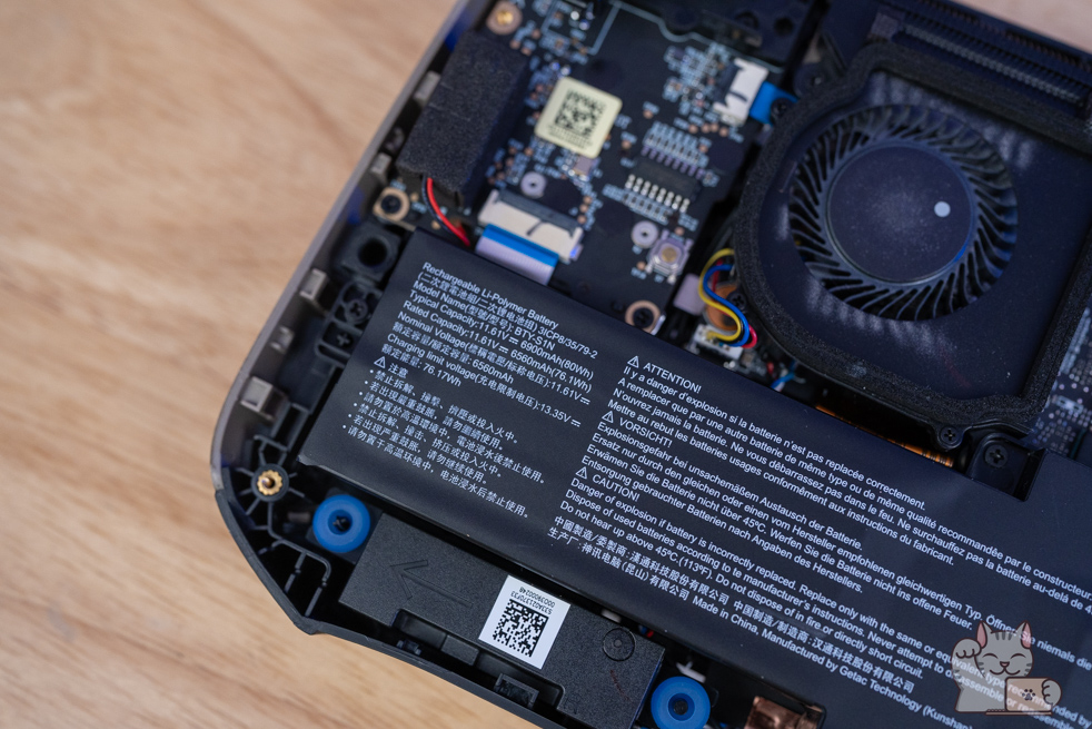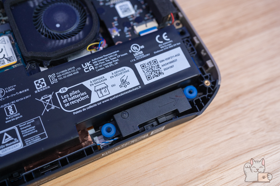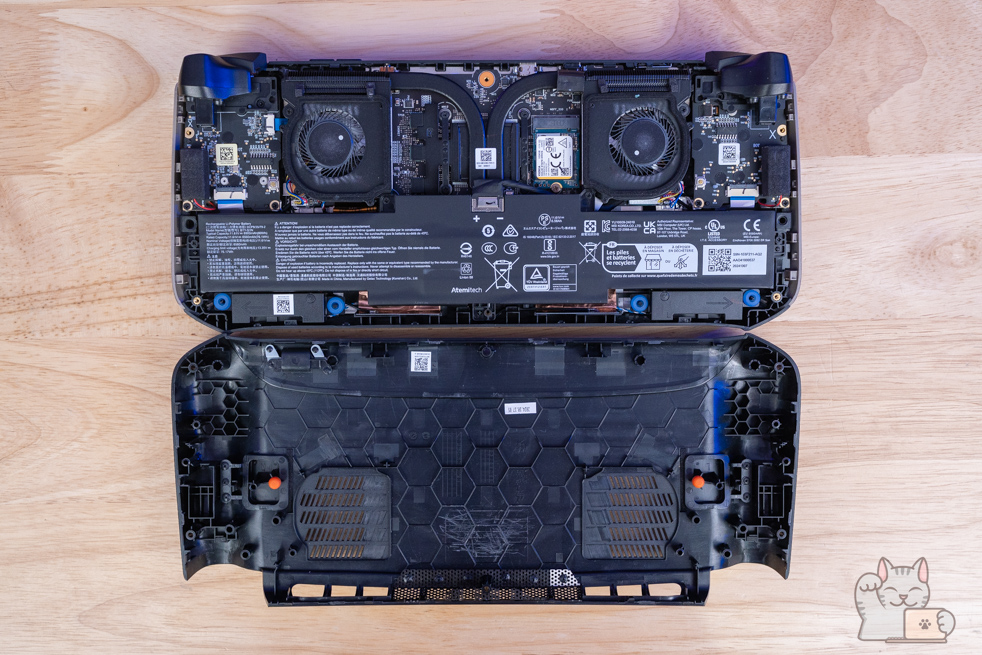 การแกะอัปเกรดต้องแกะฝาล่าง MSI Claw 8 AI+ ซึ่งการแกะฝาล่างนั้นไม่ยุ่งยาก เพียงไขน๊อตประมาณ 6 ตัว โดยเมื่อแกะออกมาแล้ว ก็จะเป็นอุปกรณ์ฮาร์ดแวร์ภายในทั้งหมด ติดตั้งแรมมาแล้วขนาด 32GB LPDDR5x 8533MHz เป็นแบบออนชิป ซึ่งสุดได้ที่ 32GB โดยรองรับการใช้งานได้แบบสบายชัวร์ๆ โดยเป็นส่วนหนึ่งของชิปประมวลผล ส่วน SSD M.2 NVMe PCIe Gen 4 (2230) ความจุ 1TB จำนวน 1 ตัว 1 Slot ซึ่งถ้าจะอัปเกรดความจุ ก็ต้องถอดของเดิมออกก่อน และแบตเตอรี่ความจุสูงที่สุดที่ 90 Wh เท่าที่จะให้ได้แล้ว