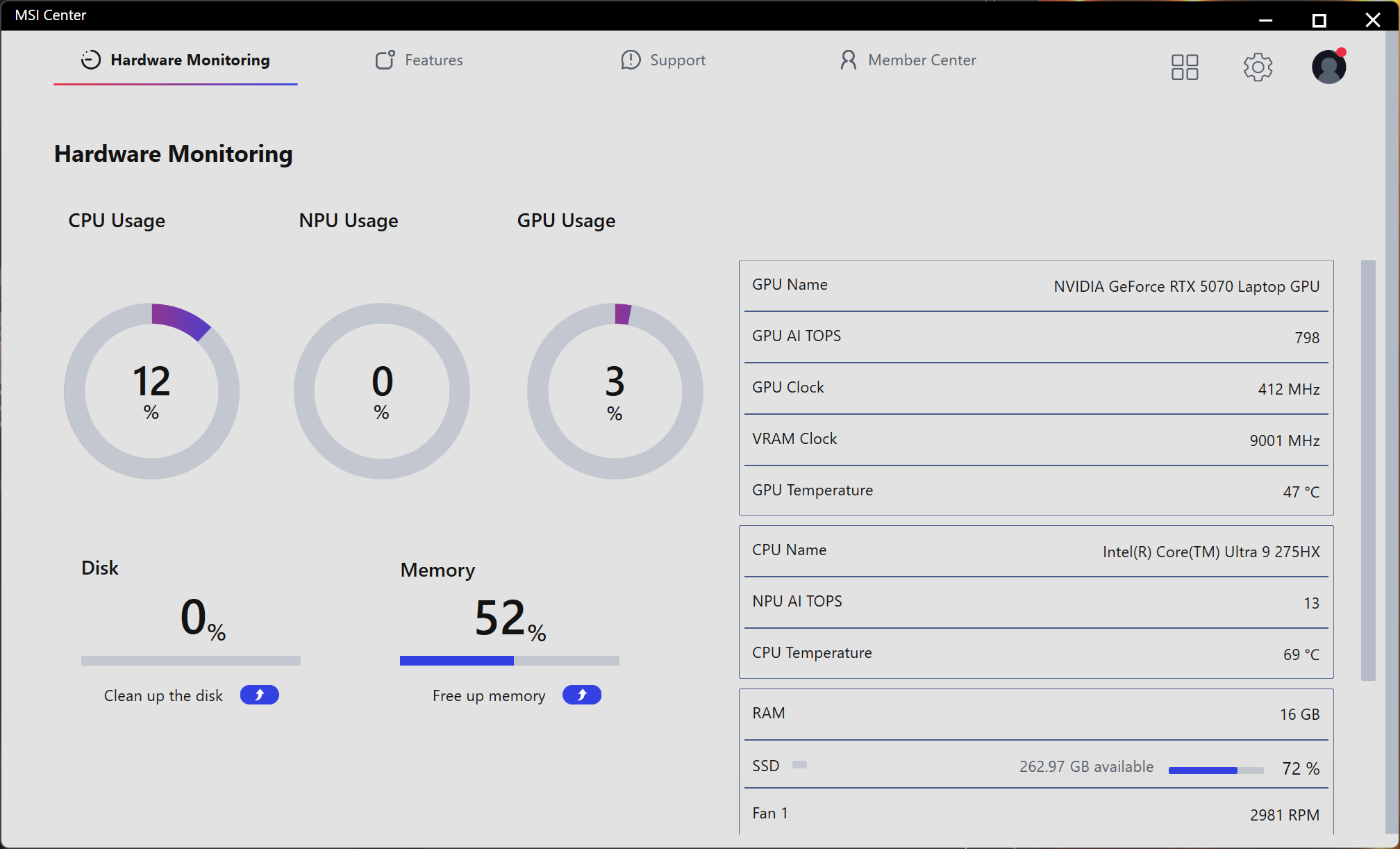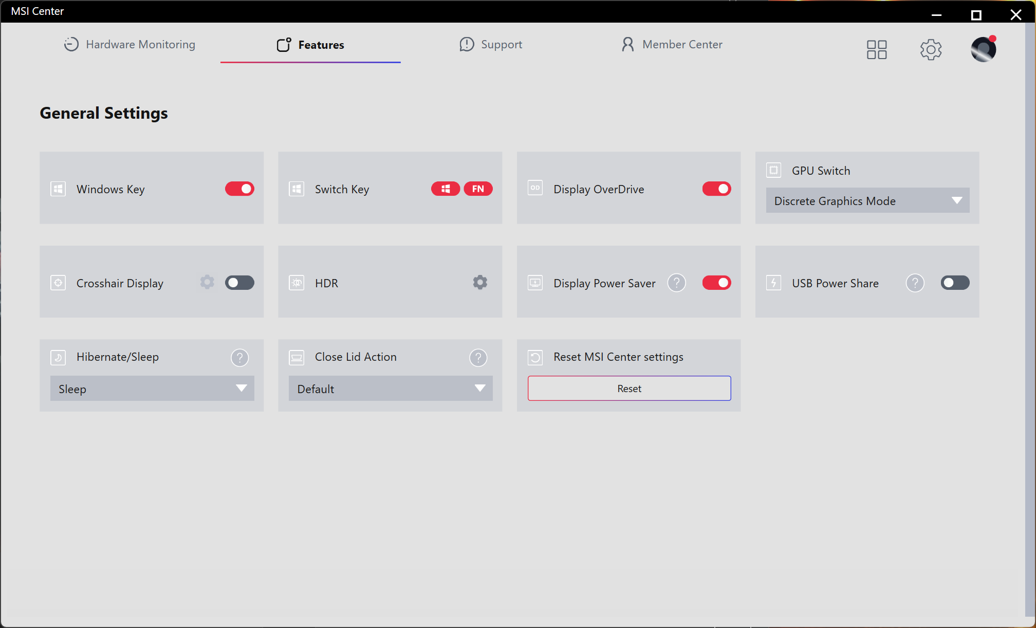 MSI Center เป็นโปรแกรมที่ออกแบบและพัฒนาโดย MSI ซึ่งเป็นโปรแกรมที่ต่อยอดมาจากรุ่นก่อน คือ ใช้งานสะดวกและสามารถช่วยเหลือ และ จัดการการปรับแต่งตั้งค่า MSI Gaming Notebook ได้อย่างลงตัว ถือว่าเป็นอีกหนึ่งไฮไลท์ของทาง MSI ก็ว่าได้ ซึ่งแบ่งเป็นหมวดหมู่ต่างๆ เพื่อให้ง่ายต่อการใช้งาน โดยหน้าเมนูต่างๆ แบ่งตามลักษณะการใช้งานที่ชัดเจน รวมไปถึงการอัพเดทซอฟต์แวร์ต่างๆ และสามารถดูสภานะการทำงานได้ ซึ่งสามารถจัดการได้ง่ายยิ่งกว่าเดิมอีกด้วย ที่สำคัญคือการปรับโหมดการใช้งานต่างๆ