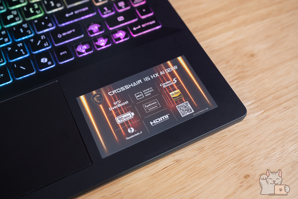 ตัวเครื่อง MSI Crosshair 16 HX AI มาพร้อมกับหน้าจอใหญ่ถึง 16″ ซึ่งมีการติดตั้งคีย์บอร์ด Full Size โดยมีการติดตั้ง Numpad แป้นตัวเลขด้วย ให้ประสบการณ์ใช้งานที่ดี ทั้งฟีลแรงกด การตอบสนองของแป้นพิมพ์ และการใช้ปุ่มหลายๆ ปุ่มพร้อมกัน ซึ่งทำได้แม่นยำ มาพร้อมไฟ RGB แบบ 24 โซน บนเทคโนโลยี Silver Lining Print ที่สวยเสริมความสวยงามให้ไฟสี RGB สว่างน่าใช้มากยิ่งขึ้น ซึ่งจะเห็นถึง WASD / ปุ่มทิศทาง / ปุ่ม Power และขอบปุ่ม Spacebar เป็นแบบโปร่งแสงเข้ากับตัวเครื่อง เรียกได้ว่าดีกว่ารุ่นก่อนหน้า