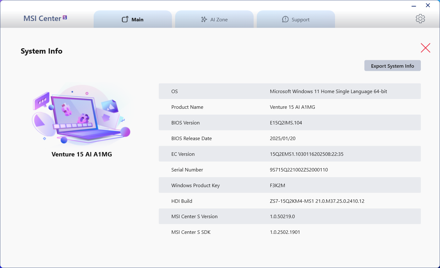 MSI Venture 15 AI สนับสนุนทั้งงานมืออาชีพ มีการติดตั้ง Windows 11 Home พร้อมใช้งาน อีกทั้งมีการติดตั้ง Office Home 2024 (Word / Excel / Power Point) มาให้ และ MSI Center S เวอร์ชั่นใหม่ที่ช่วยจัดการต่างๆ ที่ในตอนนี้ยังมี MSI AI Engine มาช่วยเสริม อีกทั้งได้ฟีเจอร์อื่นๆ ที่ครบครันตามสไตล์ของ MSI อย่างคีย์บอร์ดที่กดได้ดีมีไฟส่องสว่าง มีปุ่ม Copilot เหมาะกับคนที่ต้องการโน๊ตบุ๊คทำงาน รองรับ AI และสีสันเที่ยงตรง พกพาสะดวก พอร์ตครบ ถือว่าเป็นการต่อยอดมาจากรุ่นอื่นๆ โดยจัดว่าเป็นซีรีส์ที่อยู่ระหว่าง Modern และ Prestige กับราคาล่าสุด 27,990 – 29,990 บาท ได้ประกันแบบ 2 ปี (1 Year Global + 1 Year Thailand)