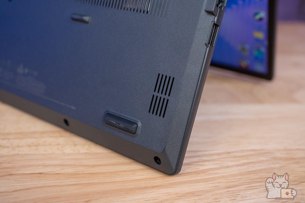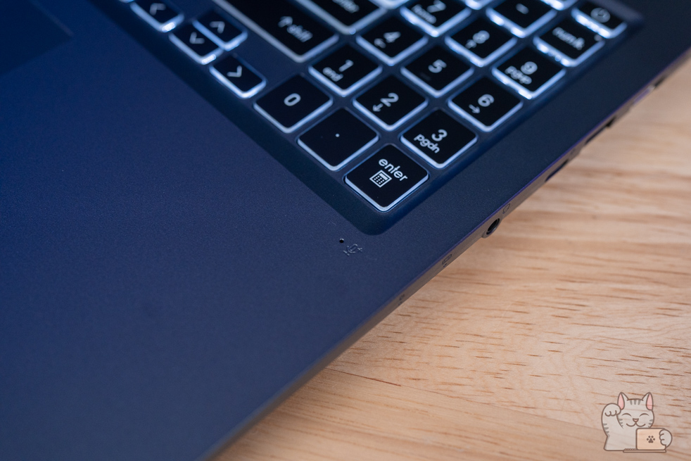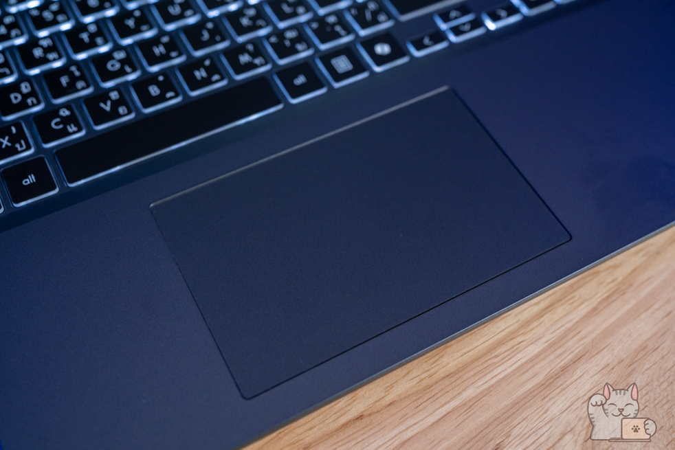 ทัชแพดมีขนาดใหญ่ ถ้าเทียบกับรุ่นปีก่อนๆ โดยดูเป็นเนื้อเดียวกับตัวเครื่อง แต่สัมผัสจะให้ความลื่นไหลมากกว่า ตัวปุ่มคลิกเป็นแบบชิ้นเดียวกับทัชแพด เข้ากับตัวเครื่องโดยรวม โดยการควบคุมสามารถทำได้เป็นอย่างดี ส่วนปุ่มคลิกทั้งซ้ายขวาก็อาจจะมีความแข็งพอดีๆ การใช้งานโดยจัดได้ว่าอยู่ในระดับลงตัว ใช้งานได้สะดวกสำหรับการวางบนตัก หรือเล่นในร้านกาแฟ โดยการควบคุมมีการตอบสนองได้ดี พร้อมรองรับ Multi Gesture ลื่นไหล ทำงานร่วมกับ Windows 11 Home ได้เป็นอย่างดี โดยปุ่ม Power มีการติดตั้งไว้ที่มุมขวาบน แต่ไม่มีระบบสแกนลายนิ