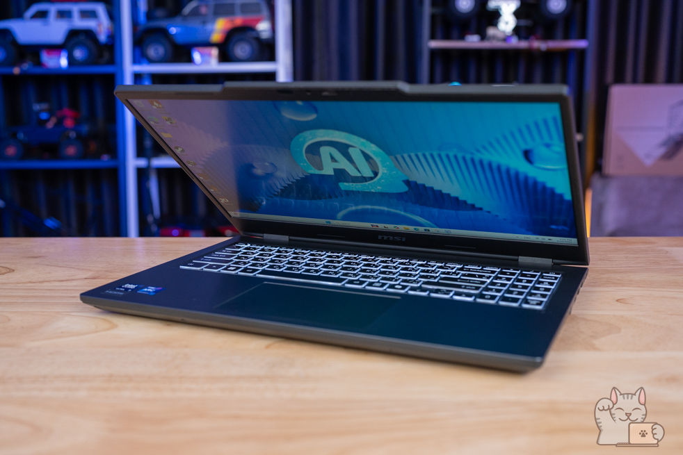 คีย์บอร์ด MSI Venture 15 AI ต้องบอกว่าแตกต่างจาก Notebook ทั่วไป กับการตอบสนองได้ดี โดยพัฒนาและออกแบบมาให้ MSI โดยเฉพาะ ทั้งอารมณ์การตอบสนองของแป้นพิมพ์ แรงกด โดยมีระยะกดที่ 1.7 มิลลิเมตร ที่ไฟส่องสว่างสีขาว ให้ความพรีเมียมและใช้งานง่ายในที่แสงน้อย รวมไปถึงมีปุ่ม Hot-key ต่างๆ ที่ปุ่ม Fn แถวบน พร้อมปรับแต่งซอฟแวร์ต่างๆ ผ่าน MSI Centerได้ด้วยเช่นกัน แน่นอนมีแป้น Numpad ด้วย แต่ก็อาจจะแคบหน่อย จากการที่ตัวเครื่องมีมิติที่เล็ก เป็น Notebook ที่ดีไซน์บานพับกางหน้าจอได้ 180 องศา มีปุ่ม Flip&Share ที่ปุ่ม F12