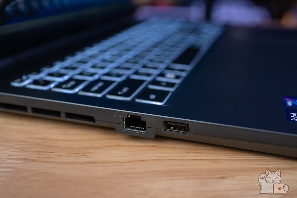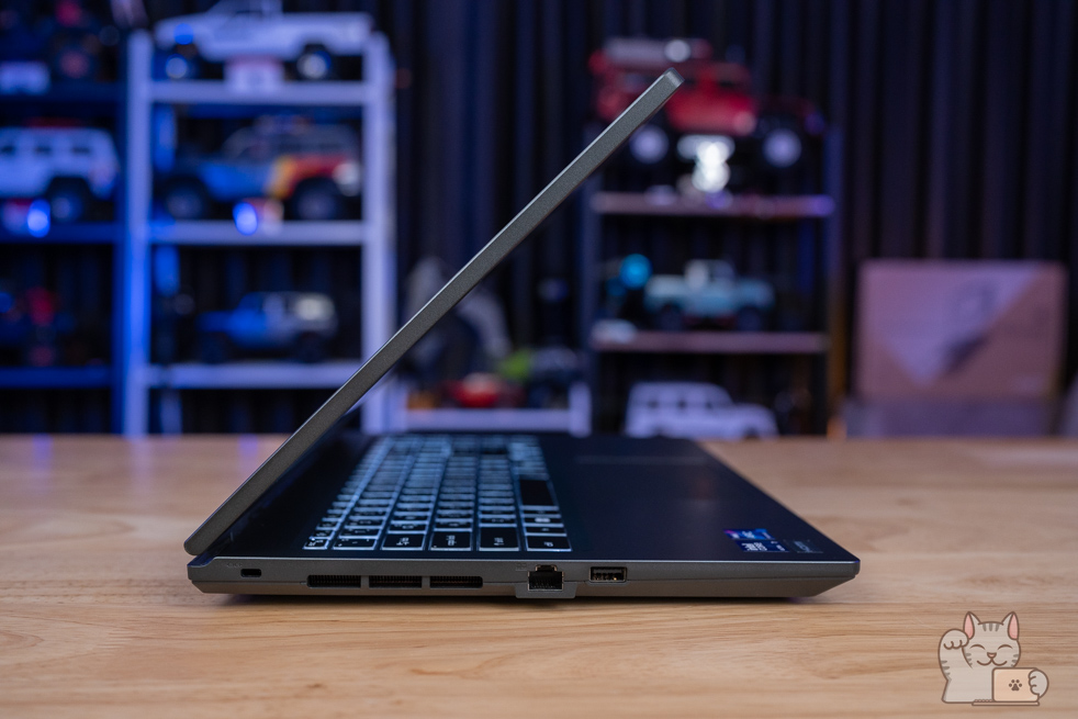 MSI Venture 15 AI เป็น Notebook จอกระทัดรัดที่มีพอร์ตเชื่อมต่อที่ครบครัน ติดตั้งไว้ที่มุมขวาและขอบตัวเครื่องด้านหลัง ไม่ว่าจะเป็น USB 3.2 Type-A จำนวน 2 ช่อง, USB 3.2 Type-C จำนวน 1 ช่อง แบบ Full Function รองรับการโอนถ่ายข้อมูล พร้อมเชื่อมต่อ DP 1.4 ต่อจอแยกได้ รวมถึง PD 3.0 ซึ่งรองรับการชาร์จไฟ PD 100W พร้อม HDMI 2.1 เพื่อเชื่อมต่อหน้าจอภายนอก อีกทั้งมี LAN RJ45 เพื่อการใช้งานเครือข่ายแบบมีสาย แต่ก็น่าเสียดายไม่มี SD Card Reader ทำให้ถ้าใครจะใช้ SD Card ต้องหา Hub ต่อเพิ่ม ส่วนพอร์ตเชื่อมต่อกับอแดปเตอร์ชาร์จไฟยังเป็นหัวกลมปกติ