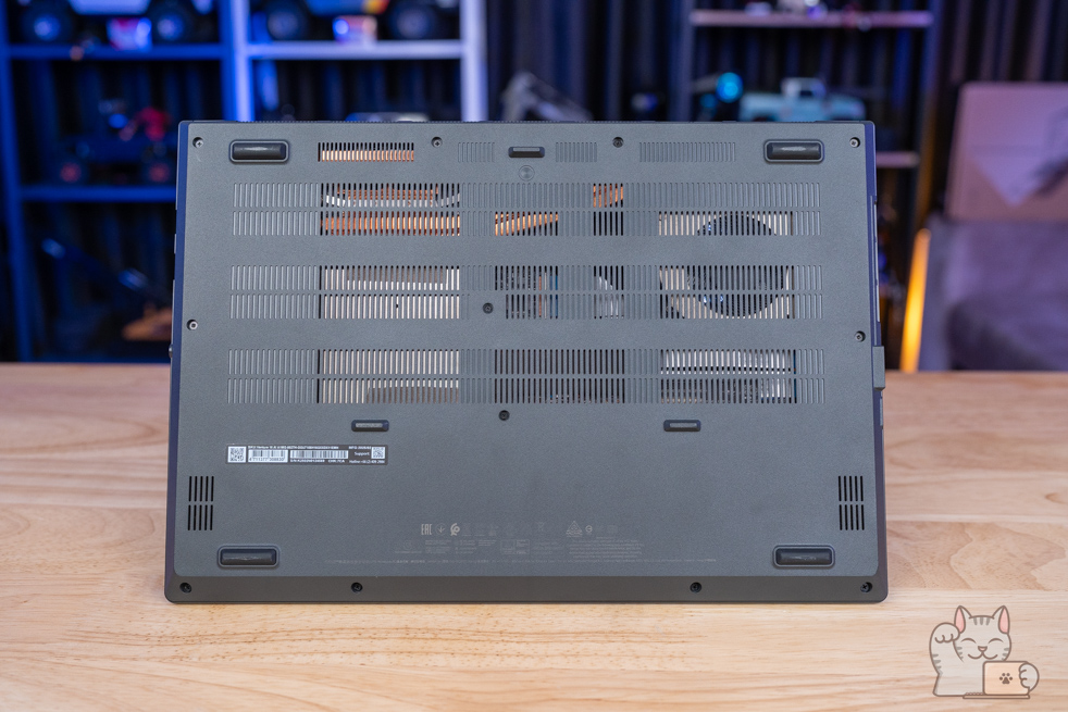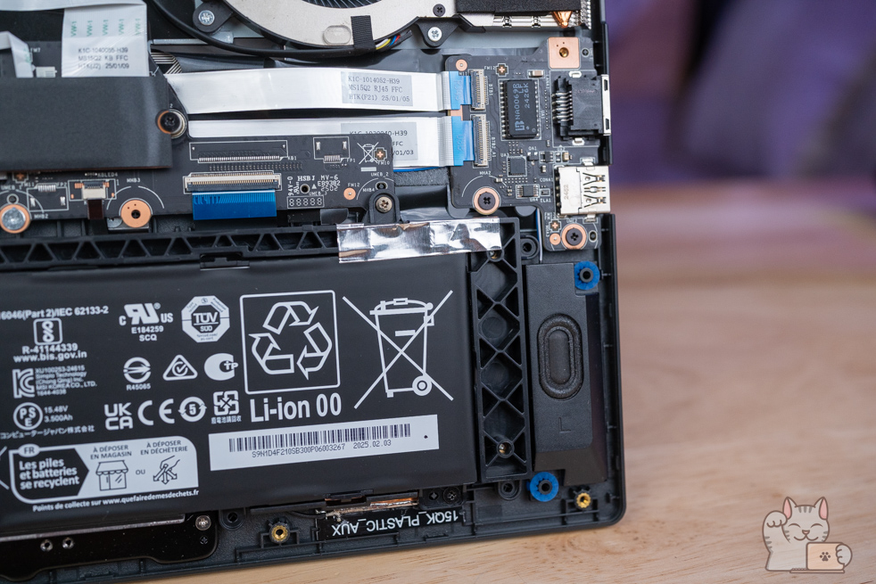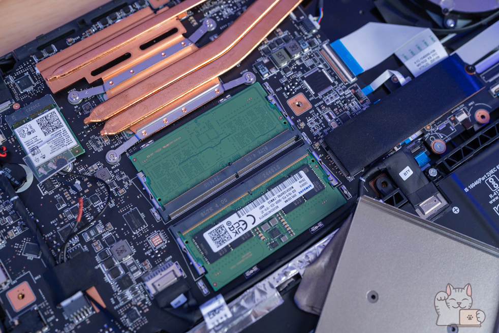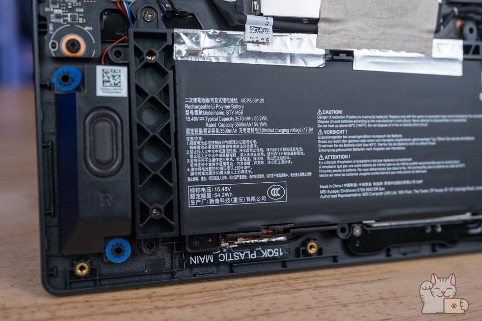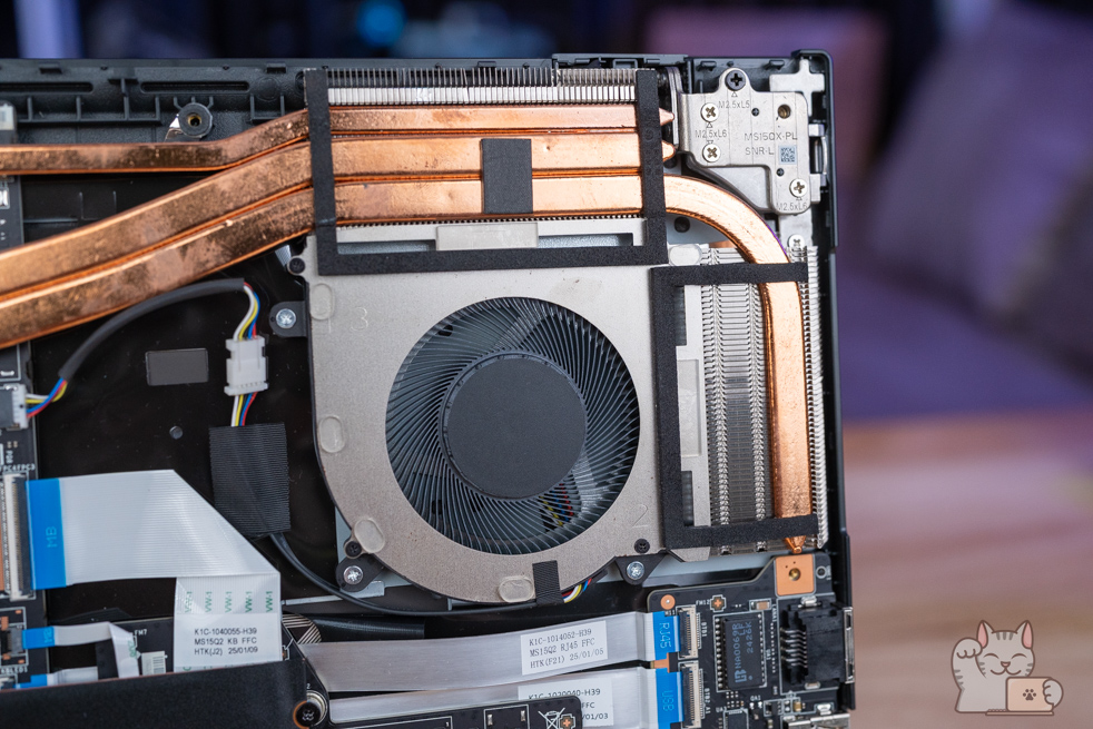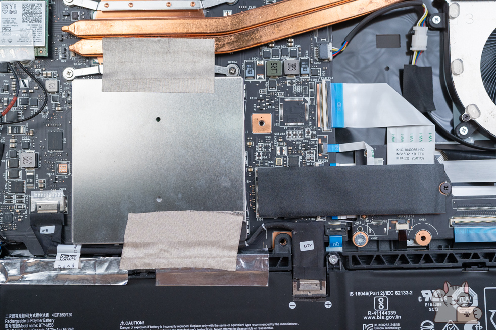 การแกะอัปเกรดต้องแกะฝาล่าง MSI Venture 15 AI ซึ่งการแกะฝาล่างนั้นไม่ยุ่งยาก เพียงไขน๊อตประมาณ 10 ตัว โดยเมื่อแกะออกมาแล้ว ก็จะเป็นอุปกรณ์ฮาร์ดแวร์ภายในทั้งหมด ติดตั้งแรมมาแล้วขนาด 16GB DDR5 Bus 5600 MHz เป็น 8GB จำนวน 2 แถวแบบ SO-DIMM ซึ่งเราอัปสุดได้ที่ 96GB โดยรองรับการใช้งานได้แบบสบายชัวร์ๆ โดยมีกรอบโลหะครอบเอาไว้อยู่ ส่วน SSD M.2 NVMe PCIe Gen 4 ความจุ 512GB จำนวน 1 ตัว 1 Slot เท่านั้น ซึ่งถ้าจะอัปเกรดความจุ ก็ต้องถอดของเดิมออกก่อน และแบตเตอรี่ความจุสูงที่สุดที่ 55.2 Wh เท่าที่จะให้ได้แล้ว