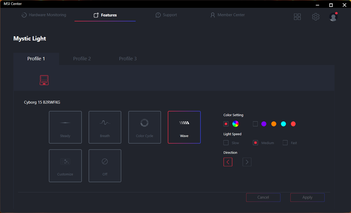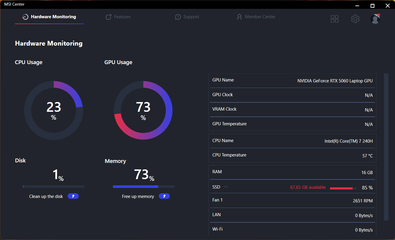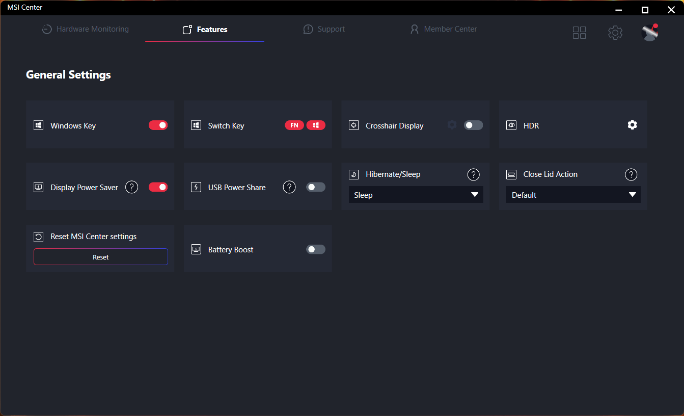 MSI Center เป็นโปรแกรมสำเร็จรูปที่ออกแบบและพัฒนาโดย MSI ซึ่งเป็นโปรแกรมที่ต่อยอดมาจากรุ่นก่อนๆ คือ ใช้งานสะดวกและสามารถช่วยเหลือ และ จัดการการปรับแต่งตั้งค่า MSI Gaming Notebook ได้อย่างลงตัว ถือว่าเป็นอีกหนึ่งไฮไลน์ของทาง MSI ก็ว่าได้ ซึ่งแบ่งเป็นหมวดหมู่ต่างๆ เพื่อให้ง่ายต่อการใช้งาน โดยหน้าเมนูต่างๆ แบ่งตามลักษณะการใช้งานที่ชัดเจน รวมไปถึงการอัปเดทซอฟต์แวร์ต่างๆ และสามารถดูสภานะการทำงานได้ ซึ่งสามารถจัดการได้ง่ายยิ่งกว่าเดิมอีกด้วย