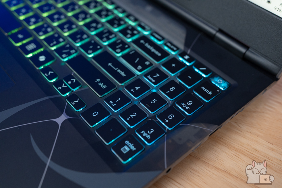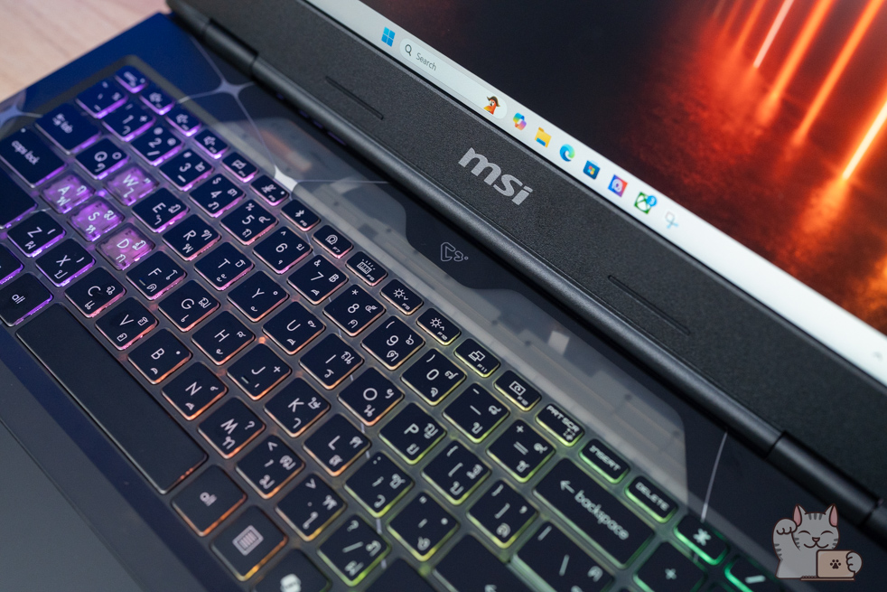 คีย์บอร์ดต้องบอกว่าแตกต่างจาก Notebook ทั่วไป กับการตอบสนองได้ดี โดยพัฒนาและออกแบบมาให้ MSI โดยเฉพาะ ทั้งอารมณ์การตอบสนองของแป้นพิมพ์ แรงกด โดยมีระยะกดที่ 1.7 มิลลิเมตร ที่ไฟแบบ RGB 4 Zone สวยงาม ส่วนปุ่ม Power จะเป็นสถานะการใช้งานการ์ดจอแยก (สีส้ม) หรือออนชิปด้วย (สีขาว) รวมไปถึงมีปุ่ม Hot-key ต่างๆ ที่ปุ่ม Fn แถวบน พร้อมมี Numpad ให้ใช้งาน ที่สำคัญคือมีฟีเจอร์ Flip-n-Share (กดปุ่ม Fn + F12) ทำให้กลับหน้าจอไปฝั่งตรงข้ามได้โดยง่าย