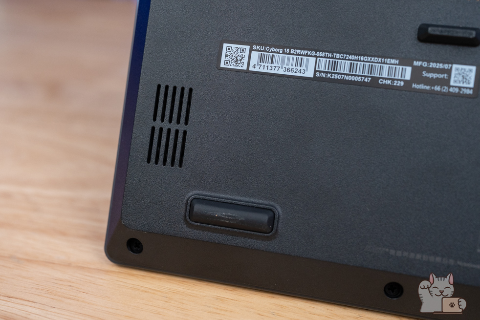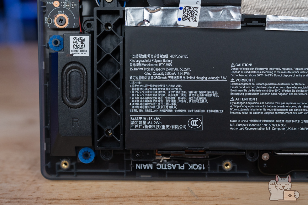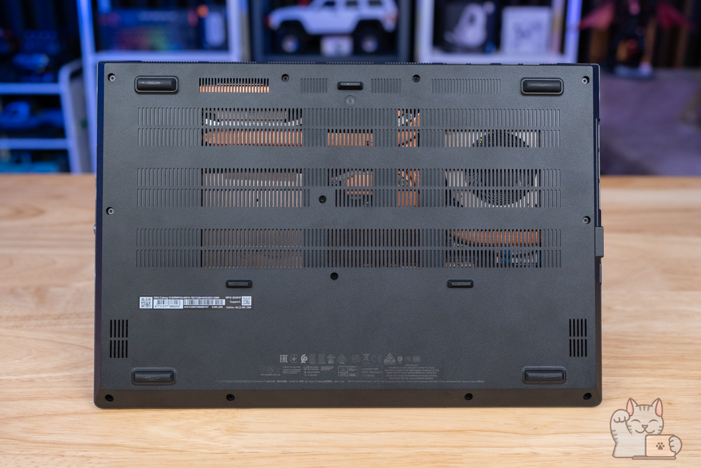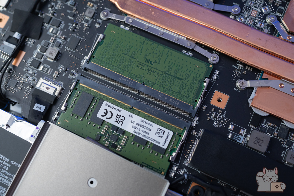 การแกะอัปเกรดต้องแกะฝาล่าง ซึ่งการแกะฝาล่างนั้นไม่ยุ่งยาก เพียงไขน๊อตประมาณ 10 ตัว โดยเมื่อแกะออกมาแล้ว ก็จะเป็นอุปกรณ์ฮาร์ดแวร์ภายในทั้งหมด ติดตั้งแรมมาแล้วขนาด 16GB DDR5 Bus 5600 MHz เป็น 8GB จำนวน 2 แถว ที่รองรับการใช้งานได้แบบสบายชัวร์ๆ โดยมีกรอบโลหะครอบเอาไว้อยู่ ส่วน SSD M.2 NVMe PCIe Gen 4 ความจุ 512GB จำนวน 1 ตัว และแบตเตอรี่ 55.2 Wh และลำโพง 2 ตัว พร้อมพัดลมระบายความร้อน 1 ตัวที่ทำงานฮีตไปป์แบบ 3 เส้นขนาดใหญ่