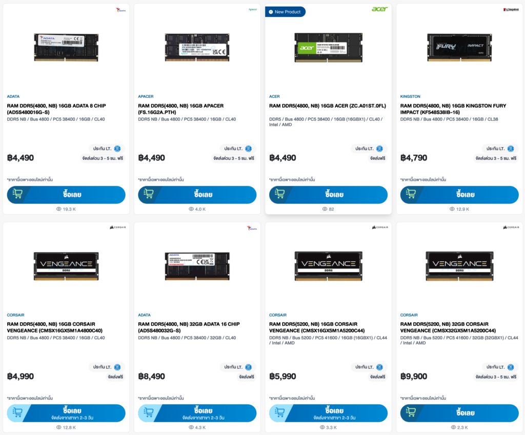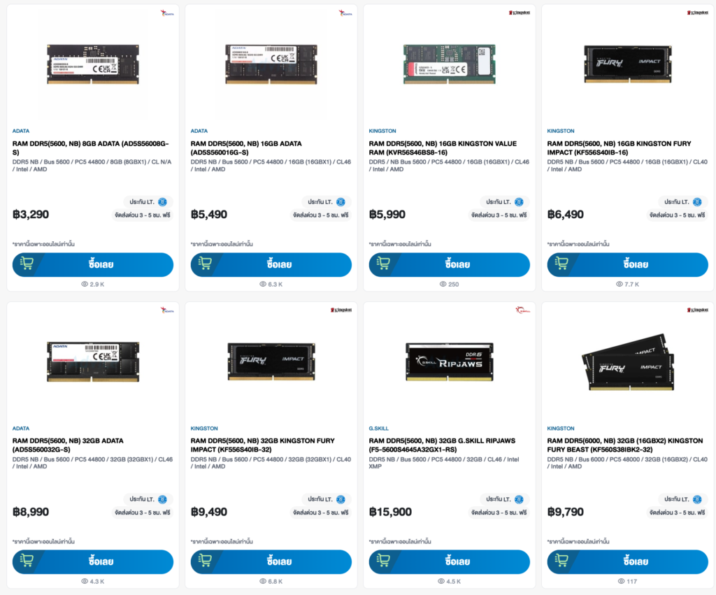 • RAM 32GB จาก 2,800–3,200 บาท → 3,800–4,800 บาท
