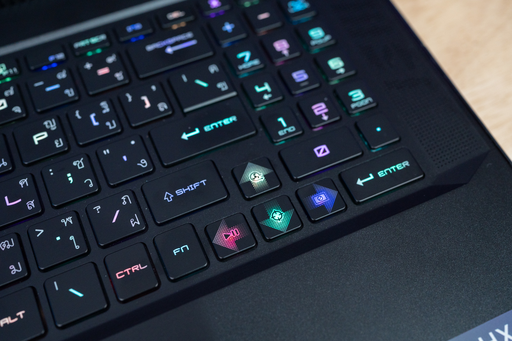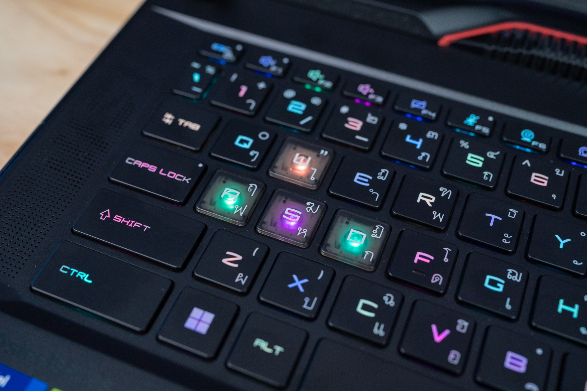 คีย์บอร์ดของ MSI Raider GE78HX โดดเด่นมากๆ จากการที่ใช้ Per-Key RGB Gaming Keyboard รุ่นล่าสุด ที่ร่วมพัฒนากับแบรนด์ SteelSeries โดยพัฒนาและออกแบบมาสำหรับการเล่นเกมบน Gaming Notebook จาก MSI โดยเฉพาะ ทั้งอารมณ์การตอบสนองของแป้นพิมพ์ แรงกด และการใช้ปุ่มหลายๆ ปุ่มพร้อมๆ กันที่สำคัญไฟ LED ที่เป็น RGB สามารถเปลี่ยนสีทีละปุ่ม ตามใจของผู้ใช้หลากหลายรูปแบบ นอกจากนี้ยังมี Hotkey ตรงปุ่ม F9 ของชุดแป้นคีย์บอร์ด เพื่อปรับเปลี่ยนโปรไฟล์สีของ Steelseries GG ที่เราตั้งค่าเอาไว้