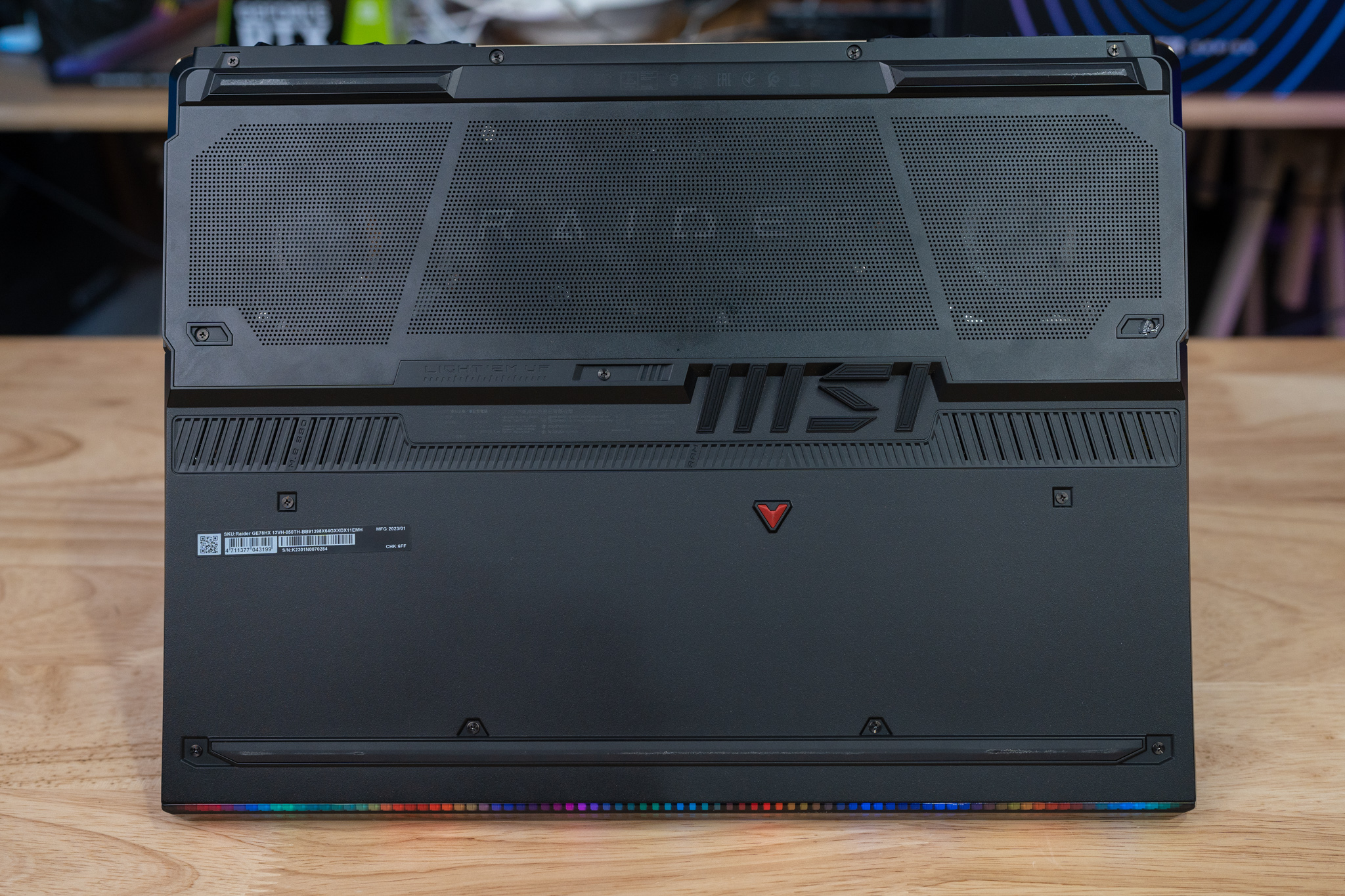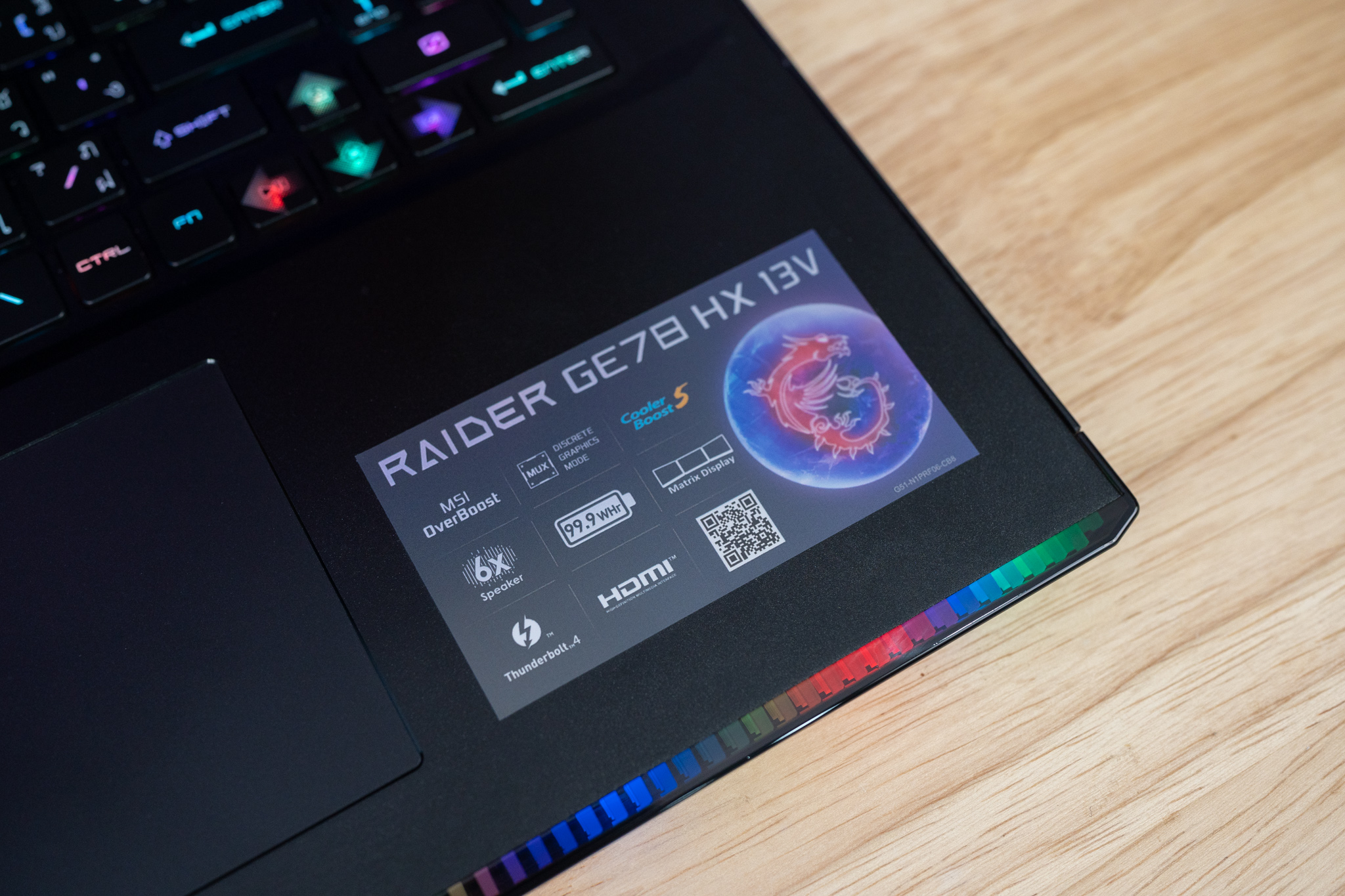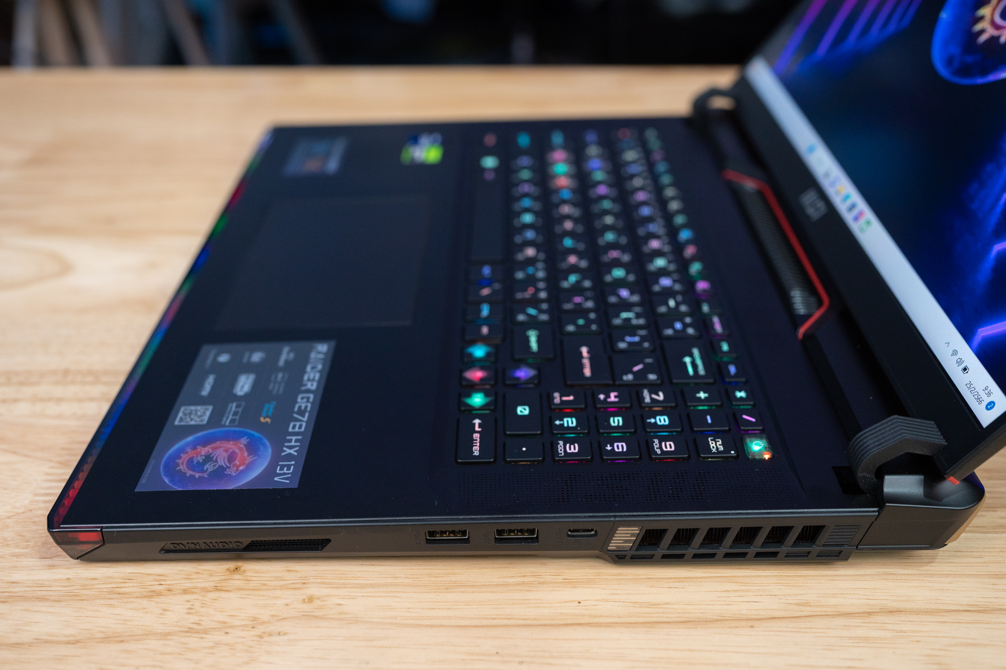 MSI Raider GE78HX เปรียบเทียบกับสเปค ฟีเจอร์ และการออกแบบสไตล์ Gaming Notebook โดนใจเกมเมอร์ หรือคนที่ต้องการโน๊ตบุ๊คแรงที่สุด ได้ไฟ Mystic Light ที่จัดเต็มยิ่งกว่า ซึ่งติดตั้งที่ขอบตัวเครื่องด้านหน้าเป็นแนวยาววัสดุเป็นอะคริลิคที่รมดำเข้ากับตัวเครื่อง ให้การแสดงผล Mystic Light Matrix Lightbar ออกแบบมาเพื่อให้สัมผัสถึงแสงไฟ RGB ที่สวยงาม แน่นอนว่าทำงานร่วมกับไฟคีย์บอร์ด RGB Pre-Key เป็นอย่างดี เอาใจสายคนชอบไฟ RGB รอบๆ ตัวเครื่อง