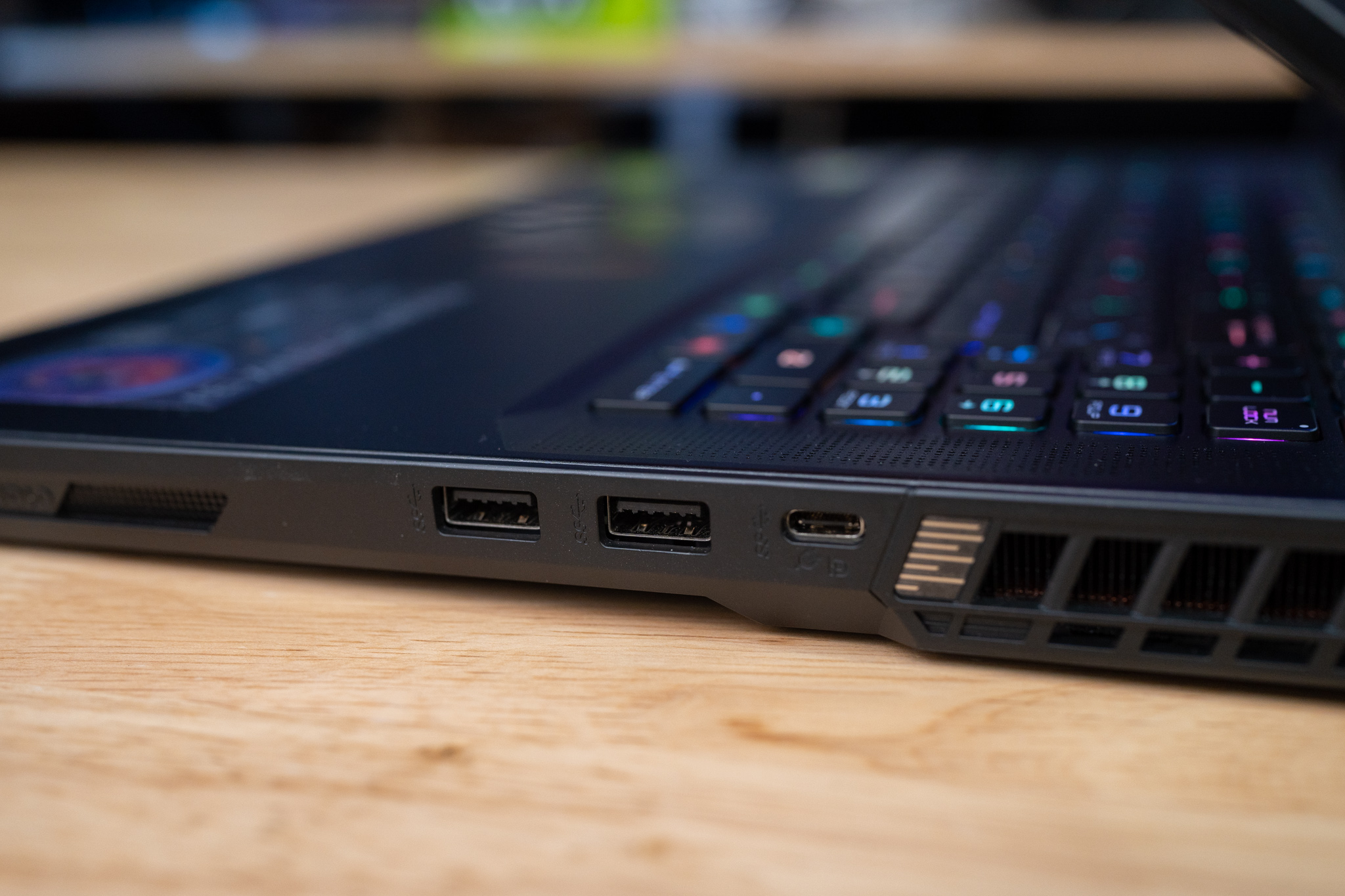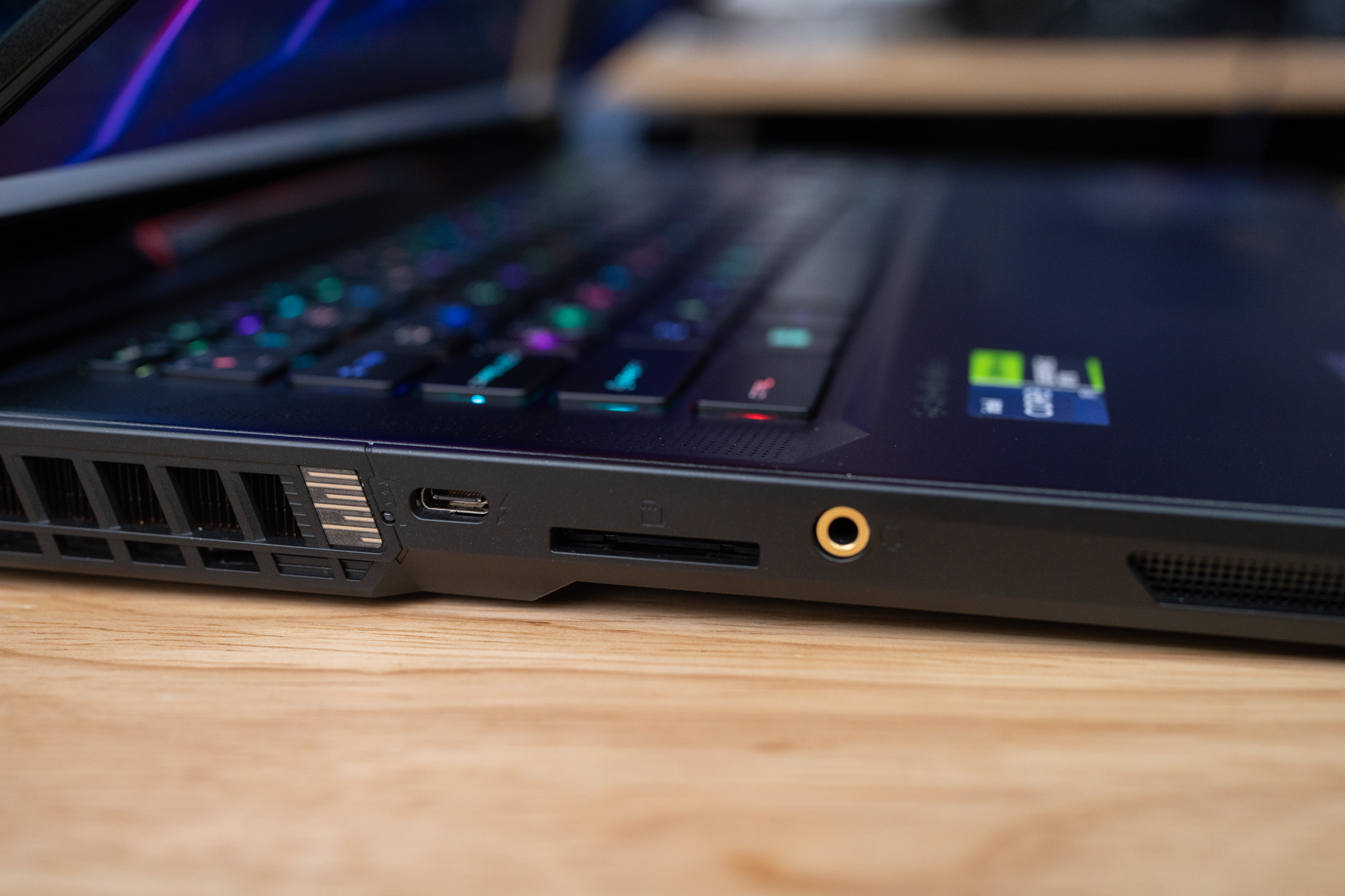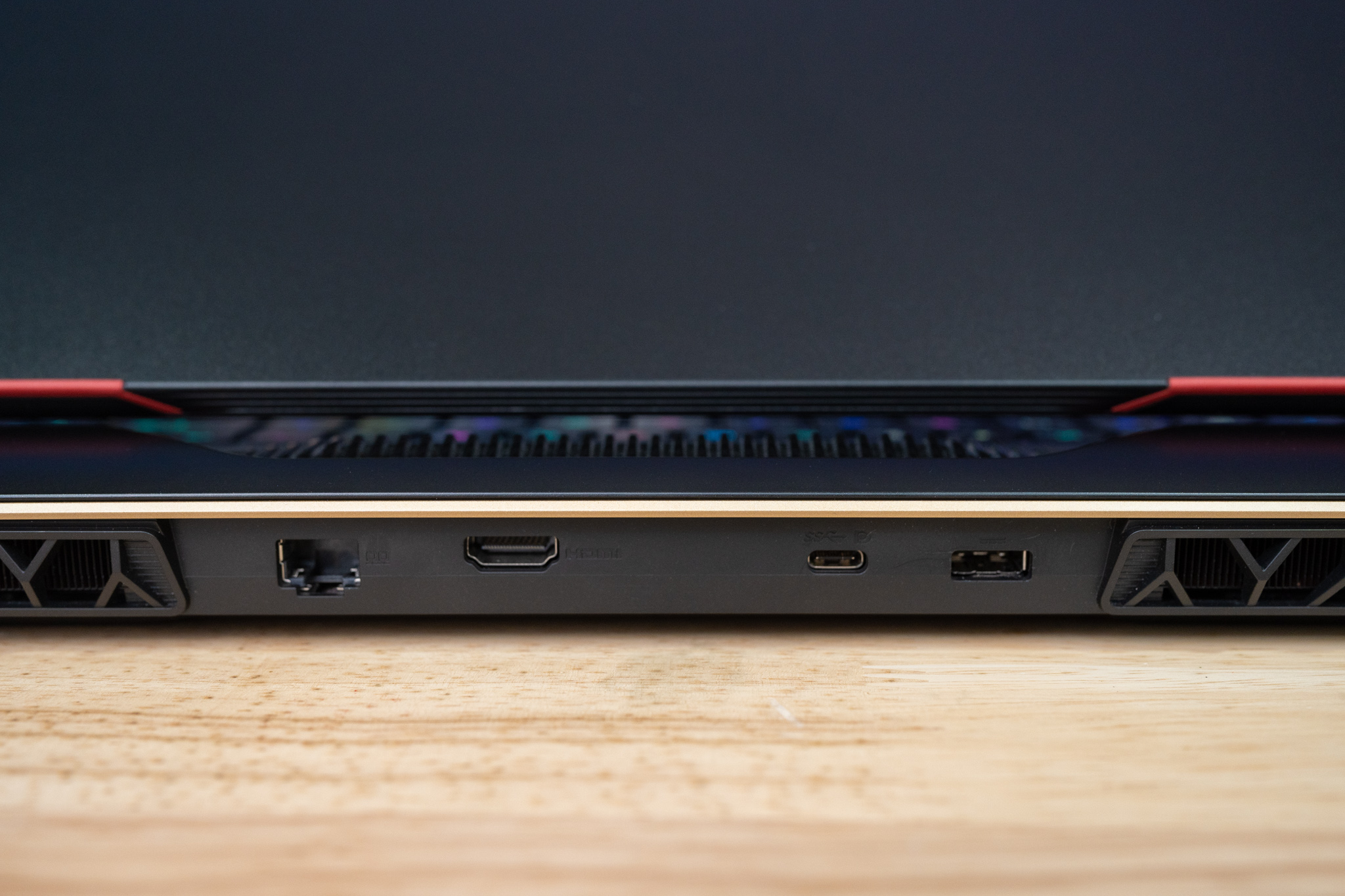 สำหรับ MSI Raider GE78HX จัดว่าเป็น Gaming Notebook หน้าจอ 17″ ที่มีพอร์ตการเชื่อมต่อที่ครบครันที่สุดรุ่นหนึ่งเลยทีเดียว ซึ่งมีทั้ง 2 x USB 3.2 Type-A, 2 x USB 3.2 Type-C, HDMI 2.1 , LAN Killer 2.5Gbps, SD Card Reader, รูหูฟังและไมค์โครโฟน 3.5 mm อีกทั้งมีพอร์ต Thunderbolt 4 อยู่อีก 1 พอร์ต ซึ่งรองรับการโอนถ่ายข้อมูลที่ดีที่สุด พร้อมสนับสนุนการต่อหน้าจอมาตรฐาน DisplayPort ด้วย และช่องเสียบอแดปเตอร์เป็นแบบสี่เหลี่ยม Block B ตามมาตรฐานของ MSI