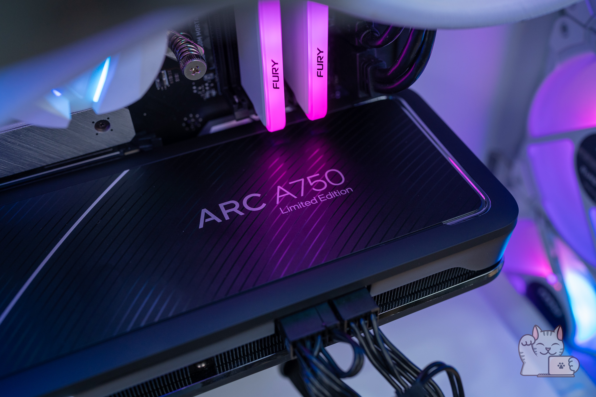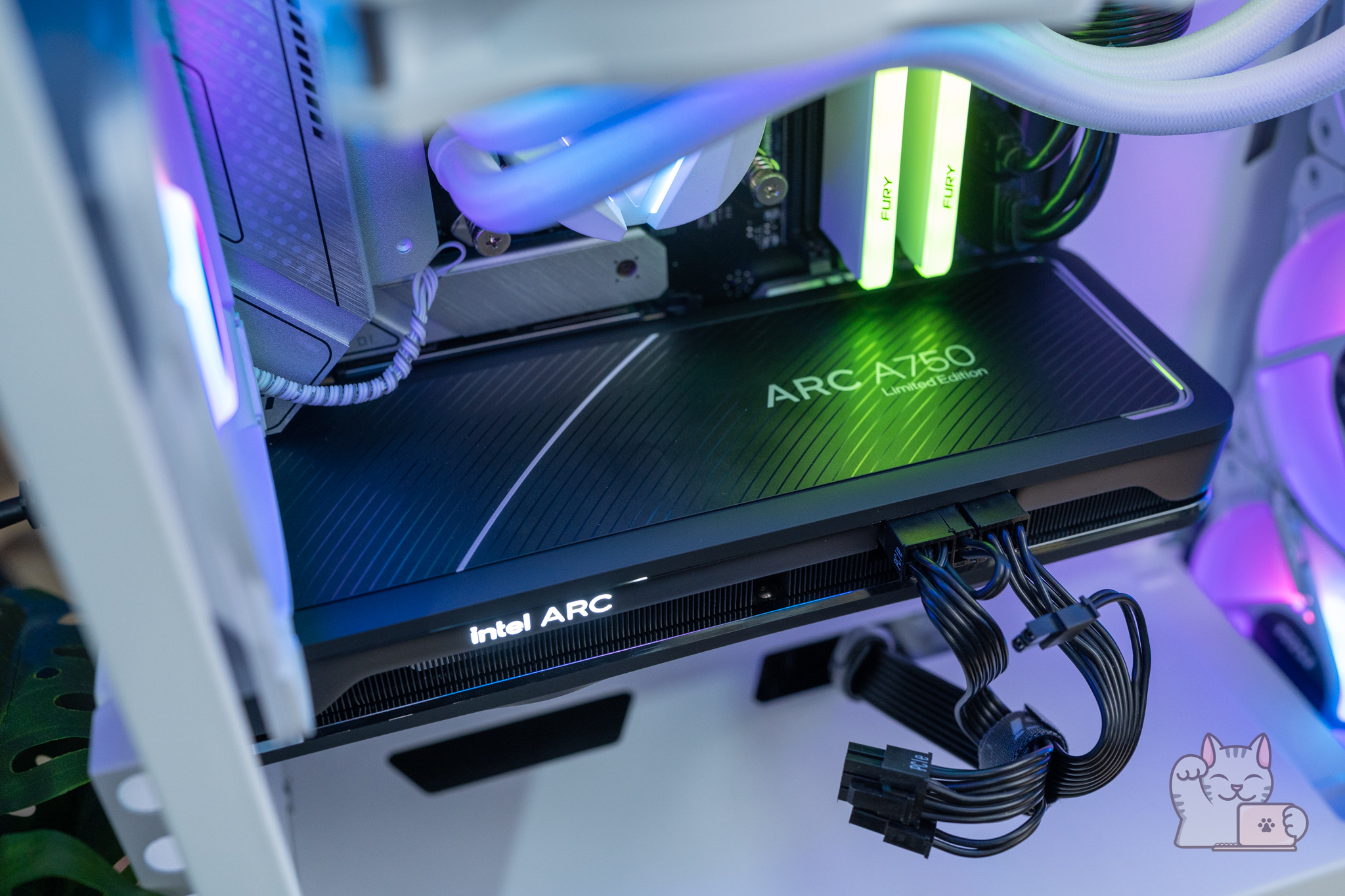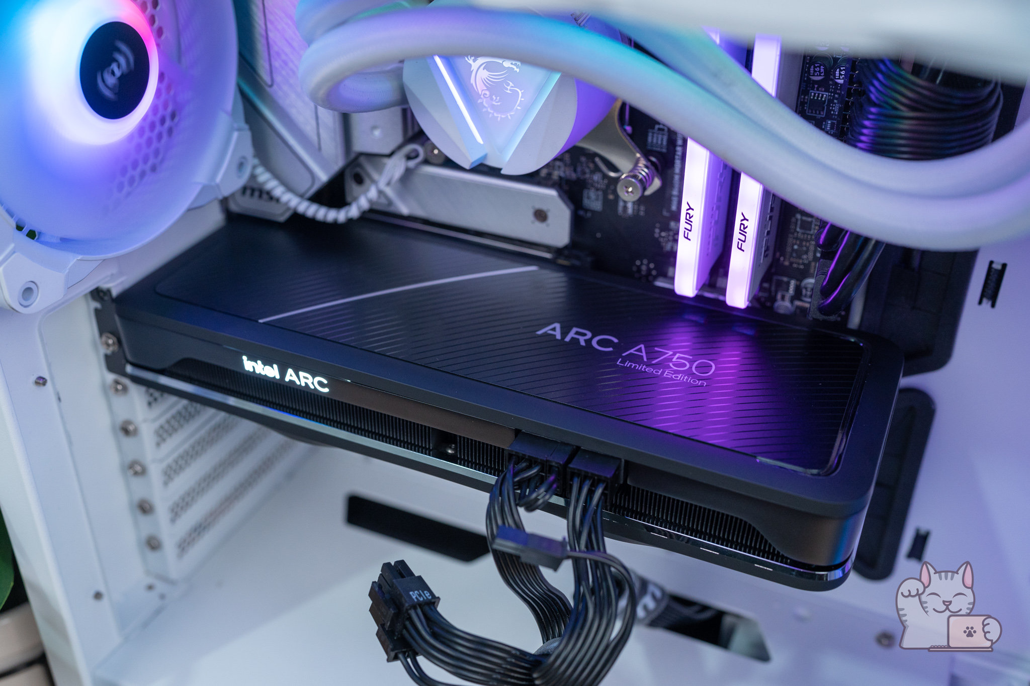 เมื่อติดตั้ง Intel ARC A750 Limited Edition ลงไปในเคสคอมของ MSI MPG GUNGNIR 110R White พร้อมติดตั้งชุดน้ำ MSI MAG CORELIQUID 240R V2 White และไฟ RGB ทั้งพัดลมและแรมแล้ว ก็บอกได้เลยว่าดูสวยงามและลงตัวมากๆ ด้วยตัวเคสและอื่นๆ มีความเป็นสีขาวสะอาดตา ตัดกับสีดำของการ์ดจอ ทำให้มีความโดดเด่น โดย Intel ARC A750 Limited Edition ก็จะมีไฟ LED สีขาวส่องสว่างขึ้นมาด้วย ซึ่งก็อาจจะไม่ได้ดูเยอะแยะอะไร ส่วนตัวก็คิดว่าดูสวยงามแบบพอดี ๆ แล้วล่ะ