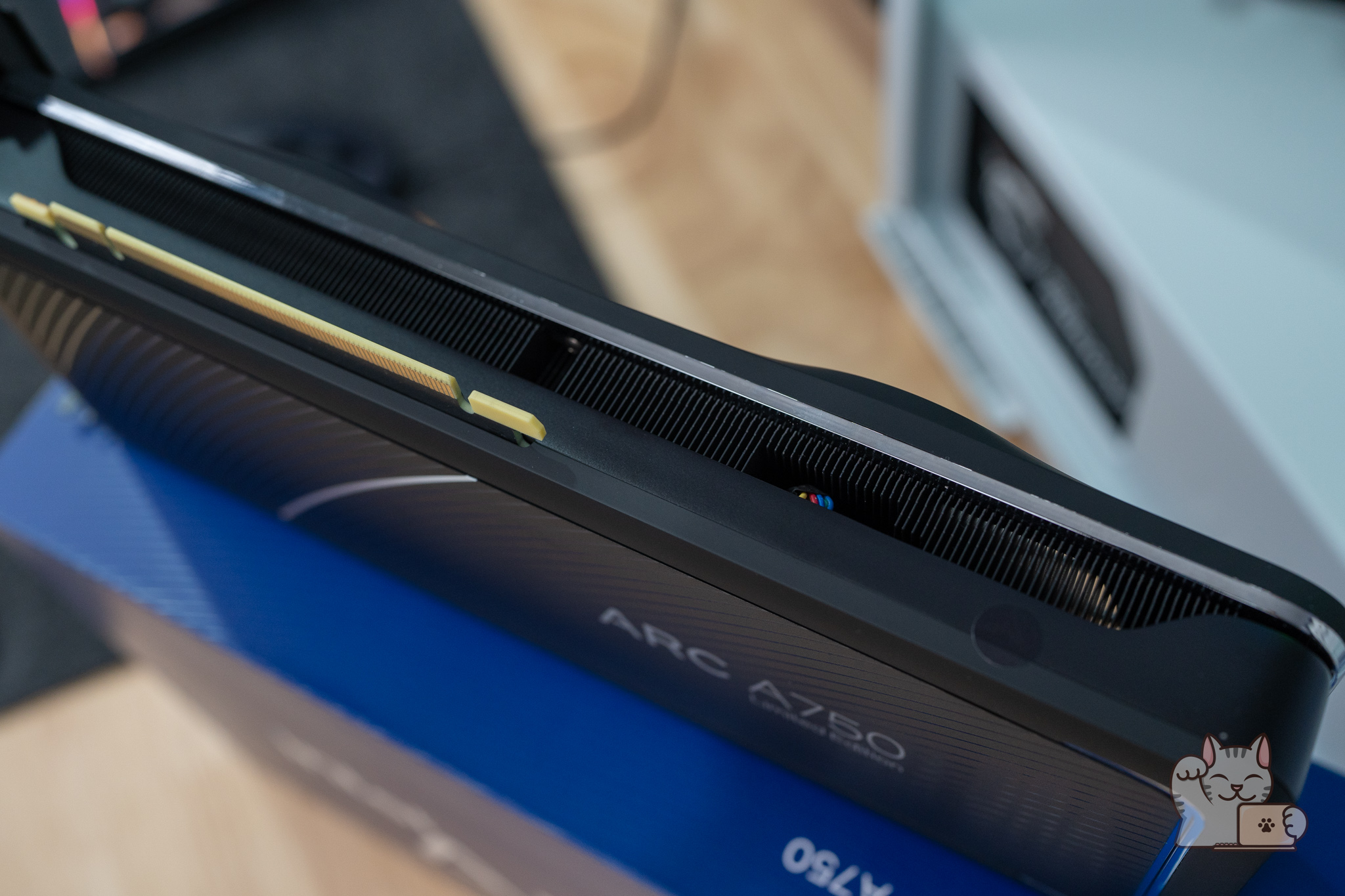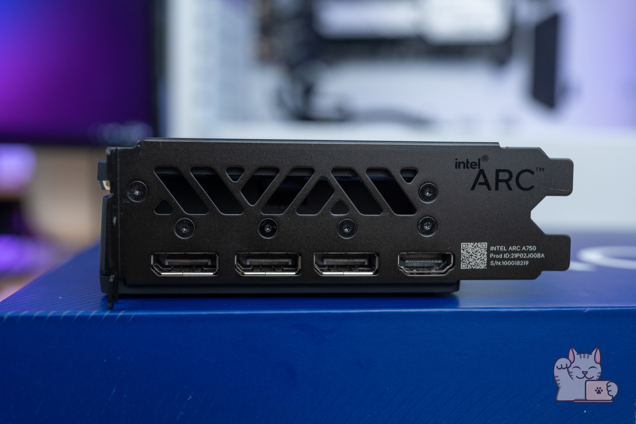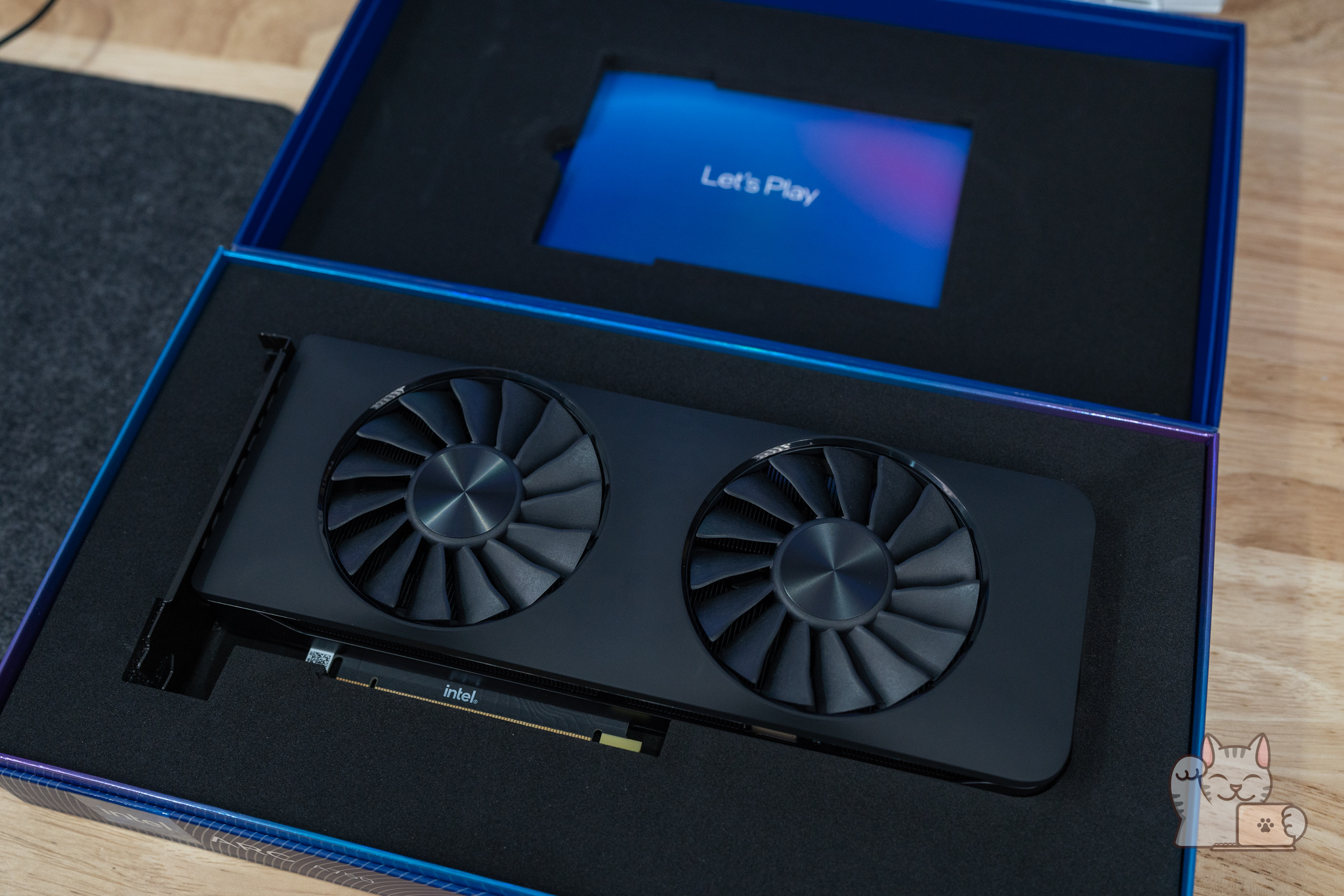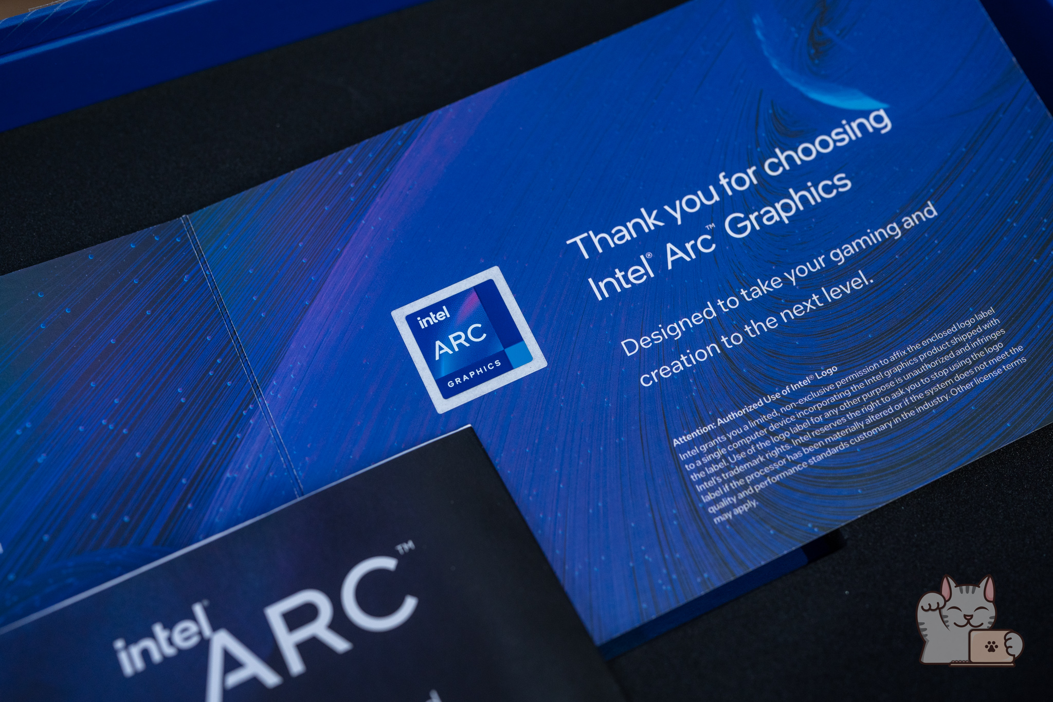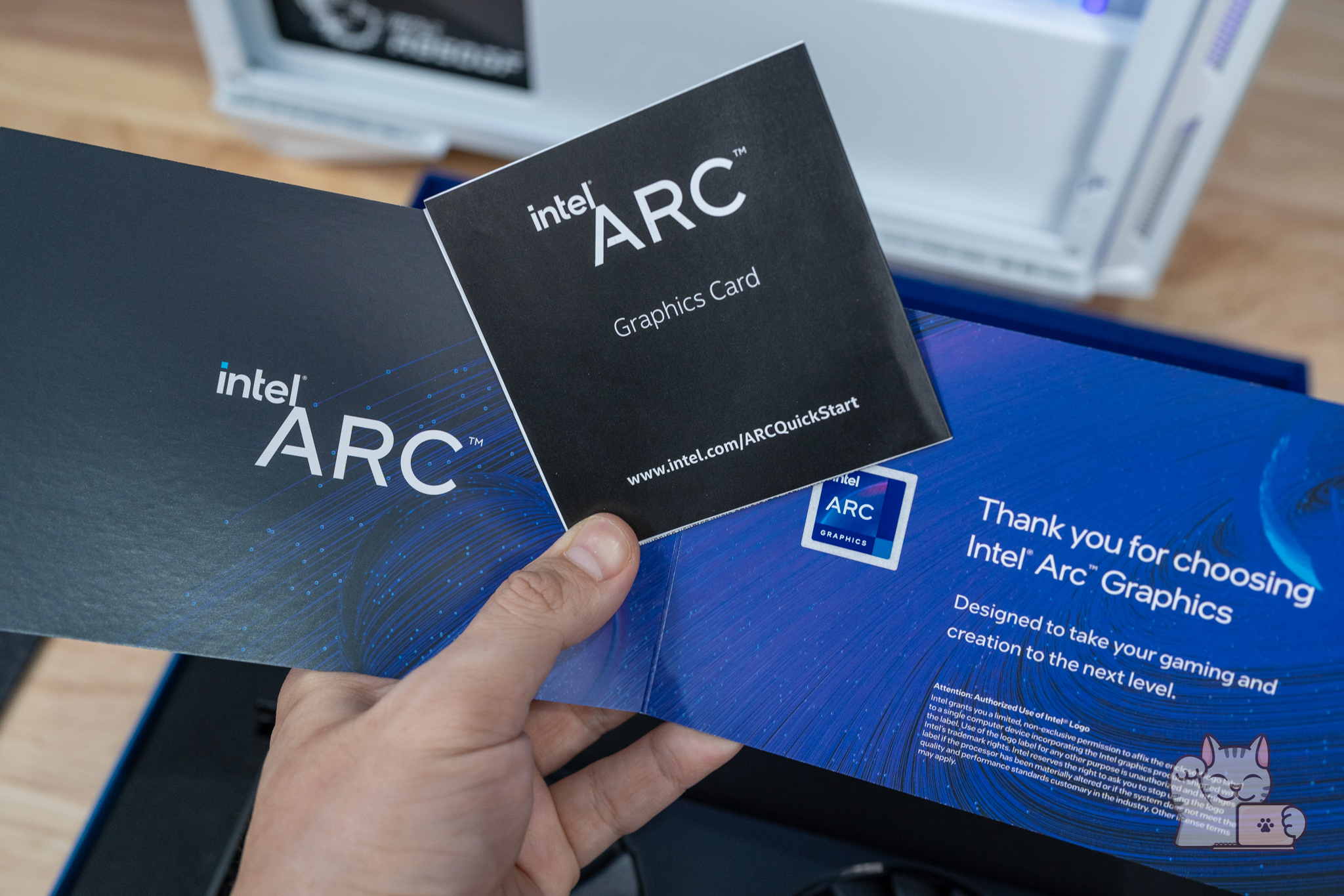 ตัวกล่องของ Intel ARC A750 Limited Edition มีความพิเศษและโดดเด่นกว่ากล่องของการ์ดจอทั่วไป ด้วยความเป็นเอกลักษณ์ของ Intel ที่มีความเรียบง่ายแต่ดูดีดูพรีเมียม เน้นการใช้งานสไตล์ของ Creator โดยกล่องมีลักษณะเปิดฝาขึ้นมา ภายในก็จะพบกับการ์ดจอ Intel ARC A750 Limited Edition ที่มีบุโฟมเป็นอย่างดี ส่วนของตัวฝาก็จะมีเอกสารเล็กน้อย พร้อมใบที่กล่าวขอบคุณที่ใช้การ์ดจอ Intel ARC นอกจากนี้ยังมีสติ๊กเกอร์ Intel ARC ให้เราไปแปะที่เคสคอมของเราอีกด้วย