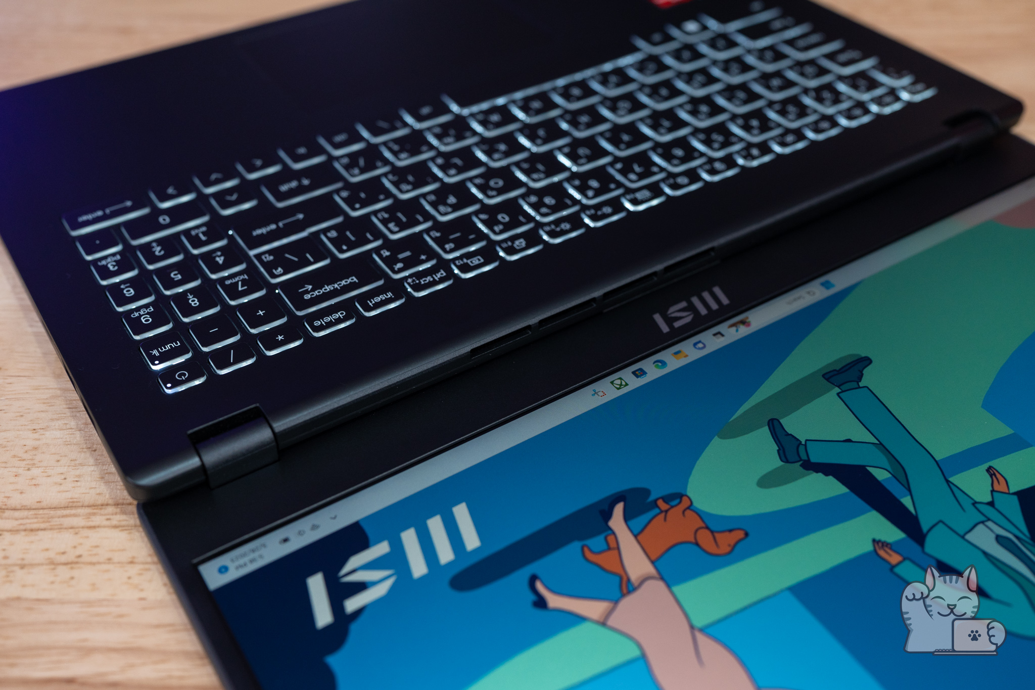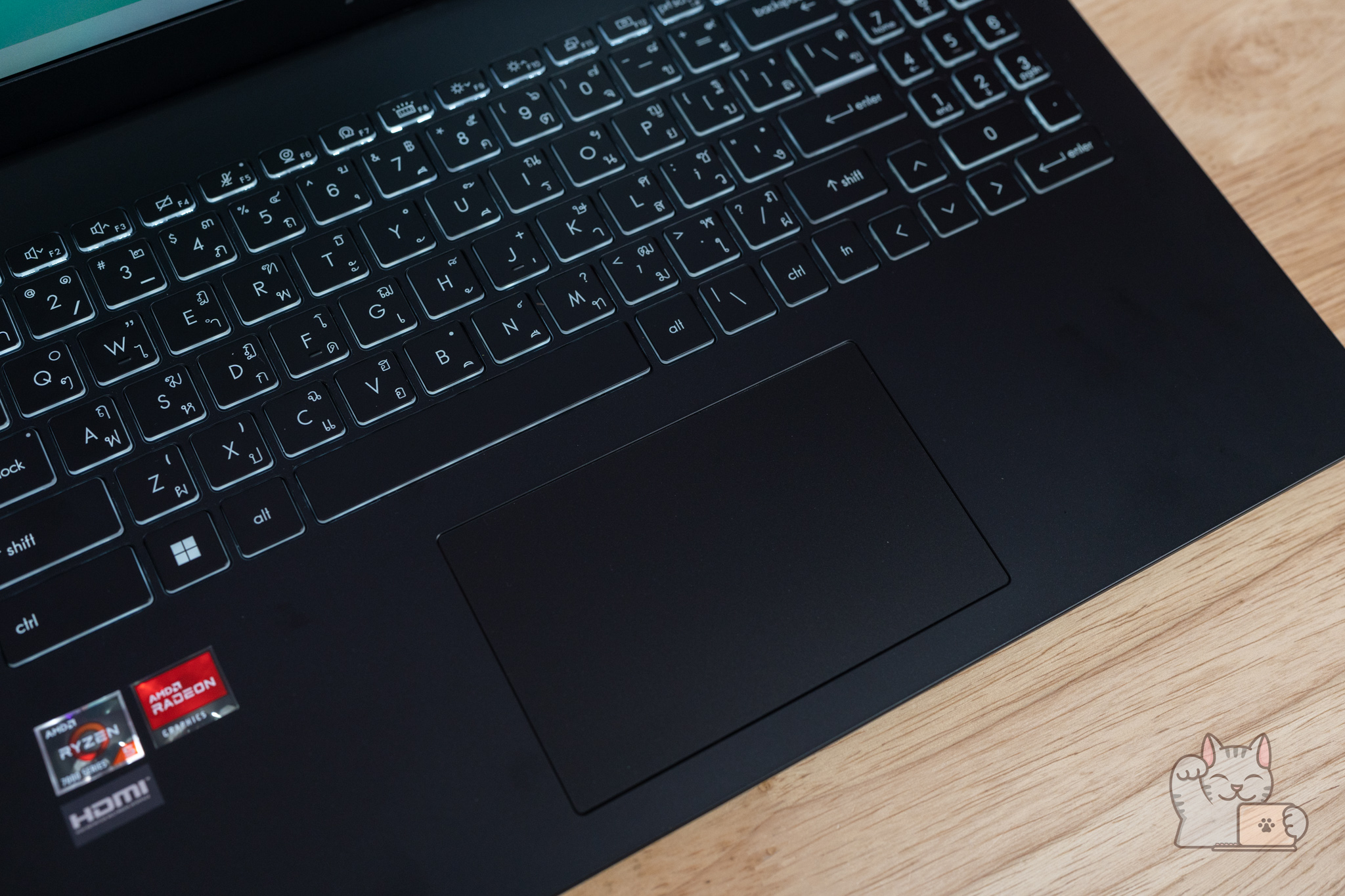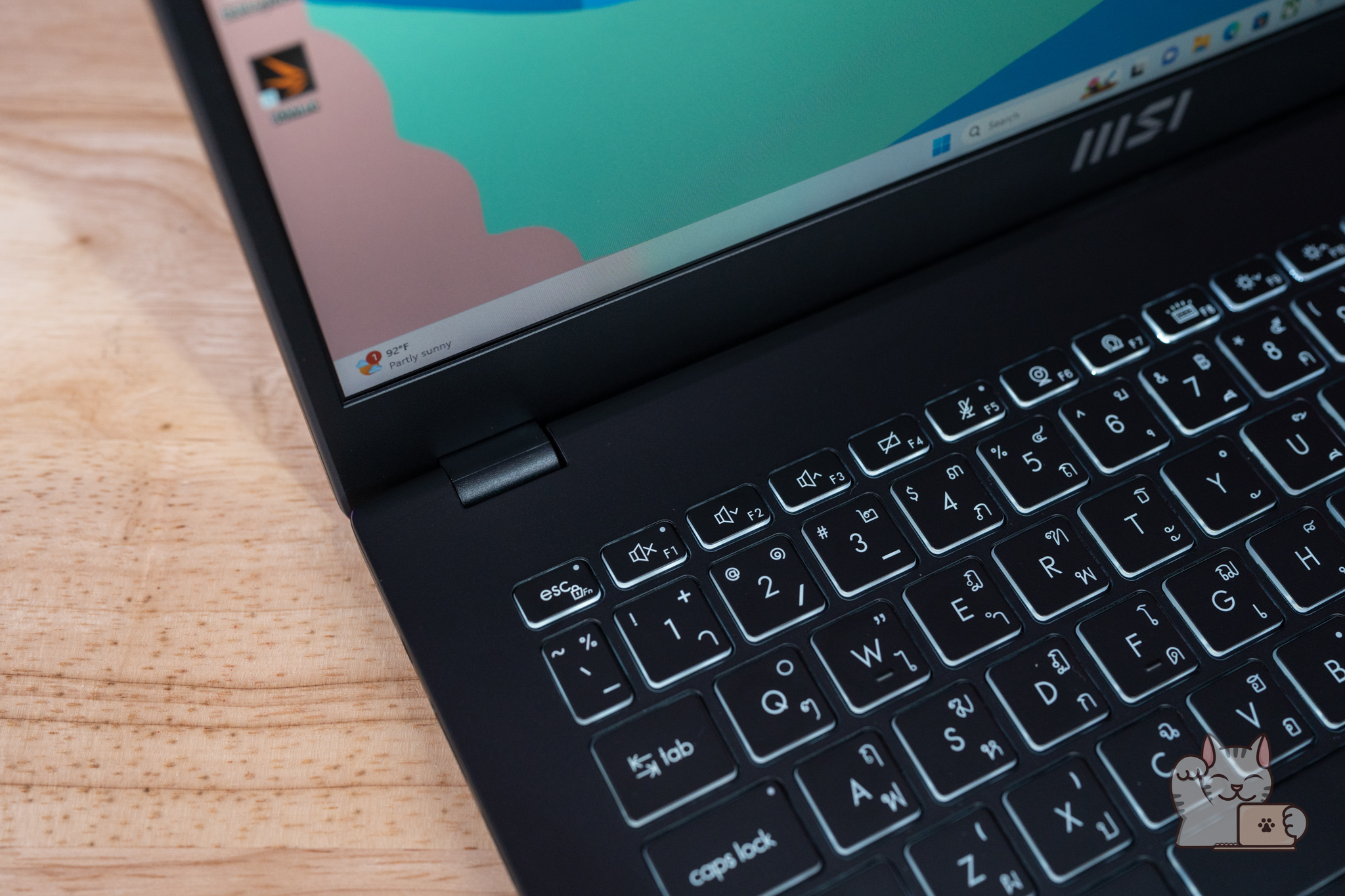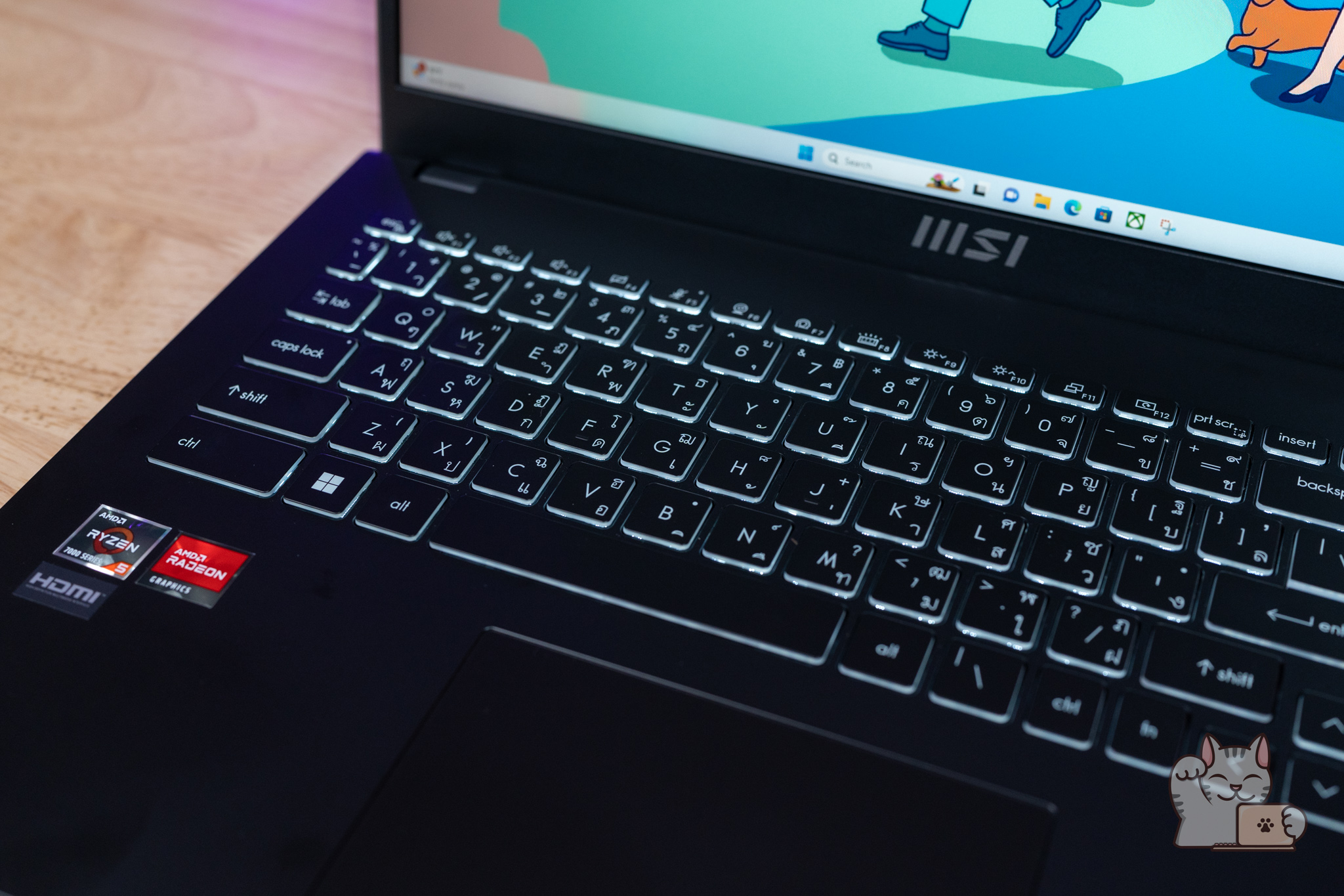 คีย์บอร์ดของ MSI Modern 15 มีระยะยุบของปุ่มอยู่ที่ 1.5 มิลลิเมตร แน่นอนว่าตอบสนองของแป้นพิมพ์ต่อแรงกดได้ดีเยี่ยม เด้งรับกับนิ้วดีมากๆ ด้วยการที่รูปแบบปุ่มมีขนาดที่ใหญ่เหมาะสม ที่สำคัญด้วยไฟ LED สีขาวสวยงาม เข้ากับตัวปุ่มสีดำขอบโปร่งแสงเป็นอย่างดี พรีเมียมสุดๆ และไม่มีชุด Numpad อยู่แล้ว จากการที่ตัวเครื่องมีมิติที่ลงนั่นเอง โดยมี Hotkey แถวบน และสำหรับปุ่ม Power ของตัวเครื่องจะติดตั้งอยู่มุมขวาบนของชุคคีย์บอร์ด ดูแล้วสวยงามลงตัวเป็นอย่างดี