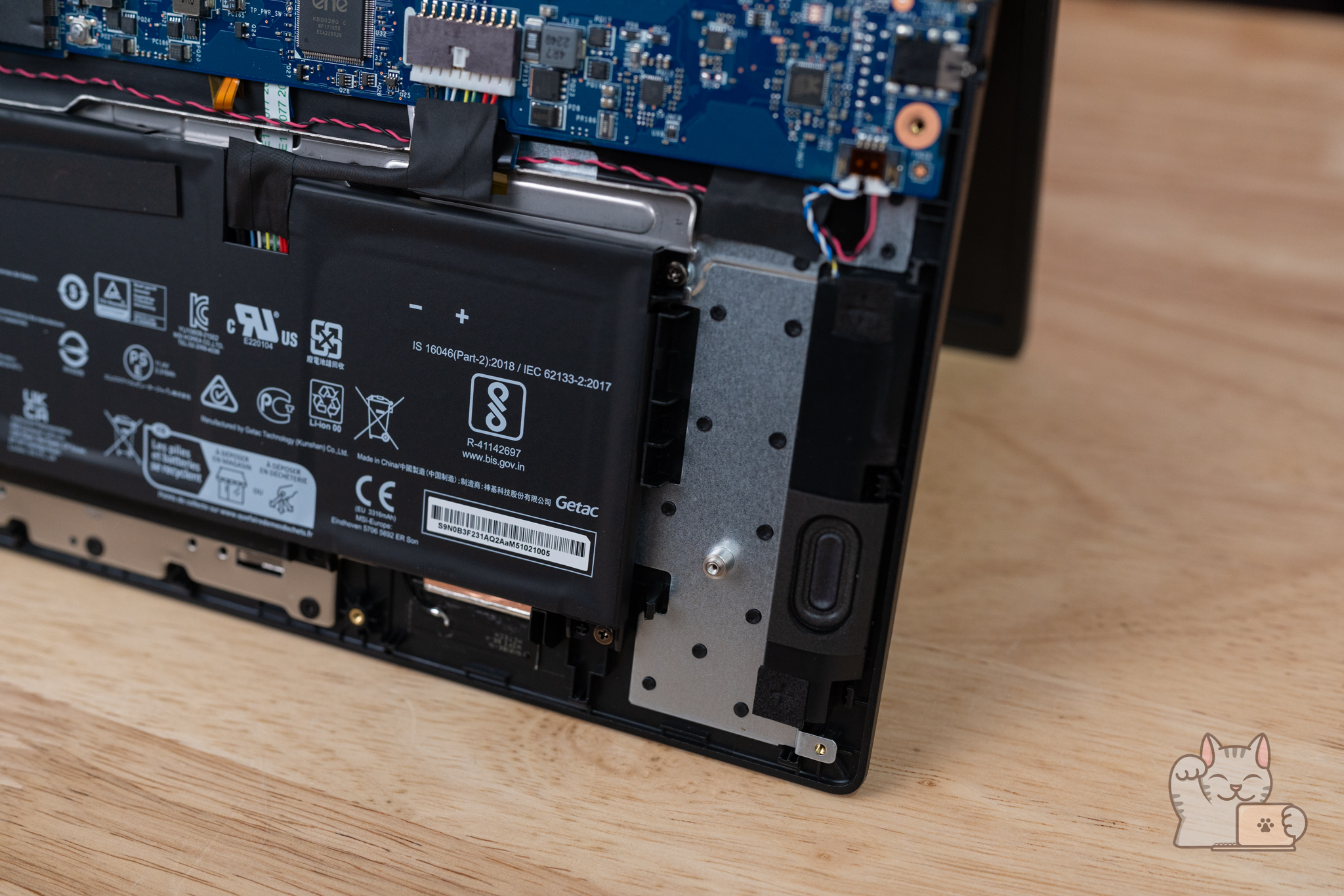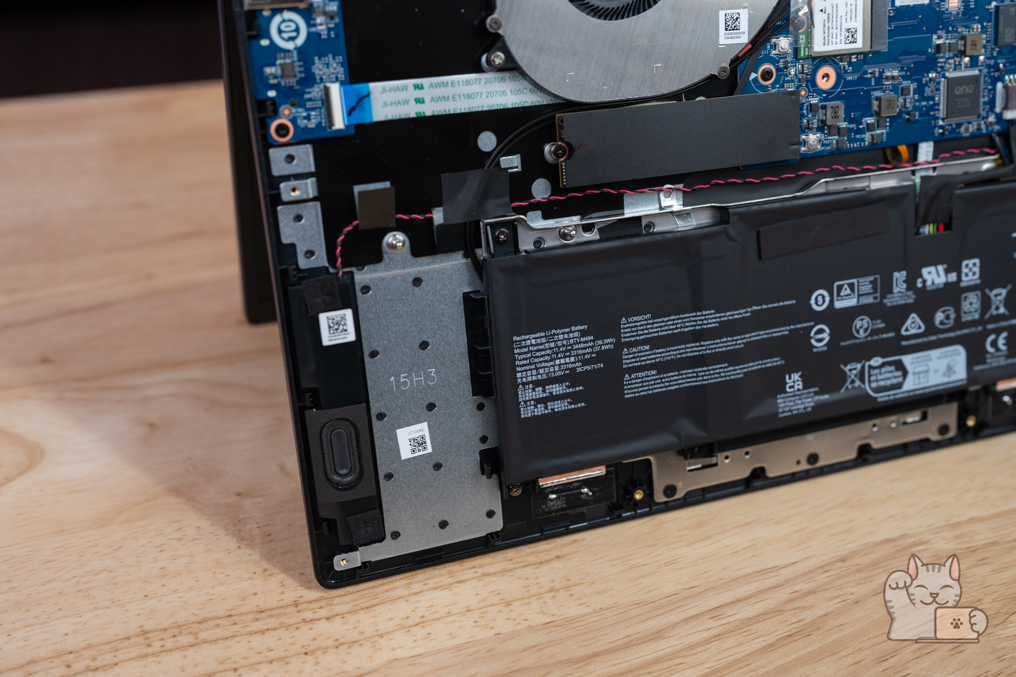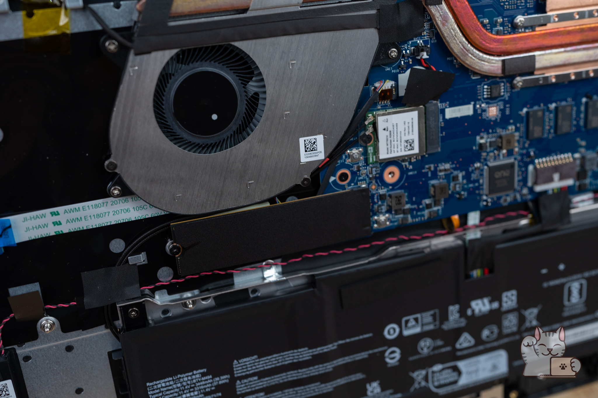 เมื่อแกะออกมาแล้วก็จะเห็นเม็ดแรมโดยเป็นการติดตั้งแรมฝังบอร์ดมาแล้ว 8GB ที่มาตรฐาน DDR4 และจะเห็นถึง SSD แบบ M.2 NVMe PCIe Gen 3 ความจุ 512GB ให้การใช้งานเป็นไปอย่างลื่นไหลไร้คอขวด ที่ต้องบอกว่าสำหรับการใช้งานทั่วไปจนไปถึงทำงานตัดต่อวีดีโอที่ไม่ซับซ้อนมาก สำหรับสเปกฮาร์ดแวร์ภายในถือว่าพอใช้งานได้เลยล่ะ อีกทั้งโครงสร้างภายในมีกสารเสริมโลหะเพื่อเพิ่มความแข็ง อย่างไรก็ตามที่น่าเสียดาย กับการที่เราอัปเกรดแรมหรือ SSD ก็มีเพียง Slot เดียว