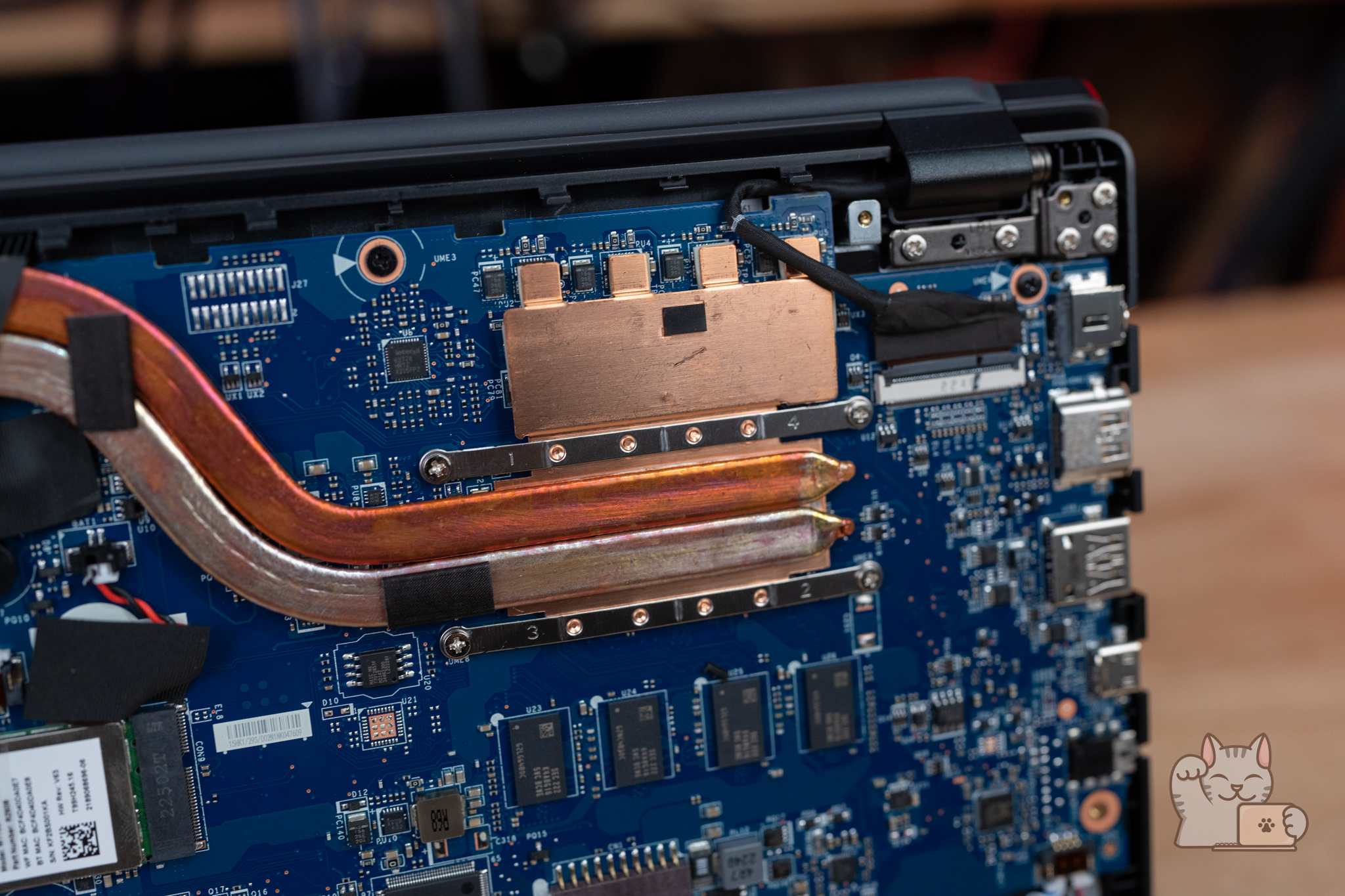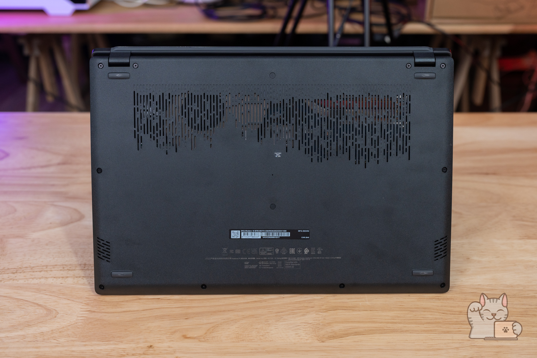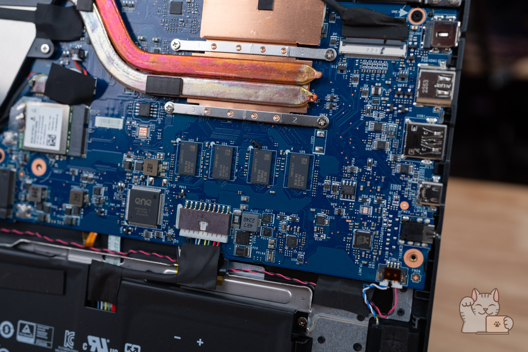 เมื่อแกะออกมาแล้วก็จะเห็นเม็ดแรมโดยเป็นการติดตั้งแรมฝังบอร์ดมาแล้ว 8GB ที่มาตรฐาน DDR4 และจะเห็นถึง SSD แบบ M.2 NVMe PCIe Gen 3 ความจุ 512GB ให้การใช้งานเป็นไปอย่างลื่นไหลไร้คอขวด ที่ต้องบอกว่าสำหรับการใช้งานทั่วไปจนไปถึงทำงานตัดต่อวีดีโอที่ไม่ซับซ้อนมาก สำหรับสเปกฮาร์ดแวร์ภายในถือว่าพอใช้งานได้เลยล่ะ อีกทั้งโครงสร้างภายในมีกสารเสริมโลหะเพื่อเพิ่มความแข็ง อย่างไรก็ตามที่น่าเสียดาย กับการที่เราอัปเกรดแรมหรือ SSD ก็มีเพียง Slot เดียว