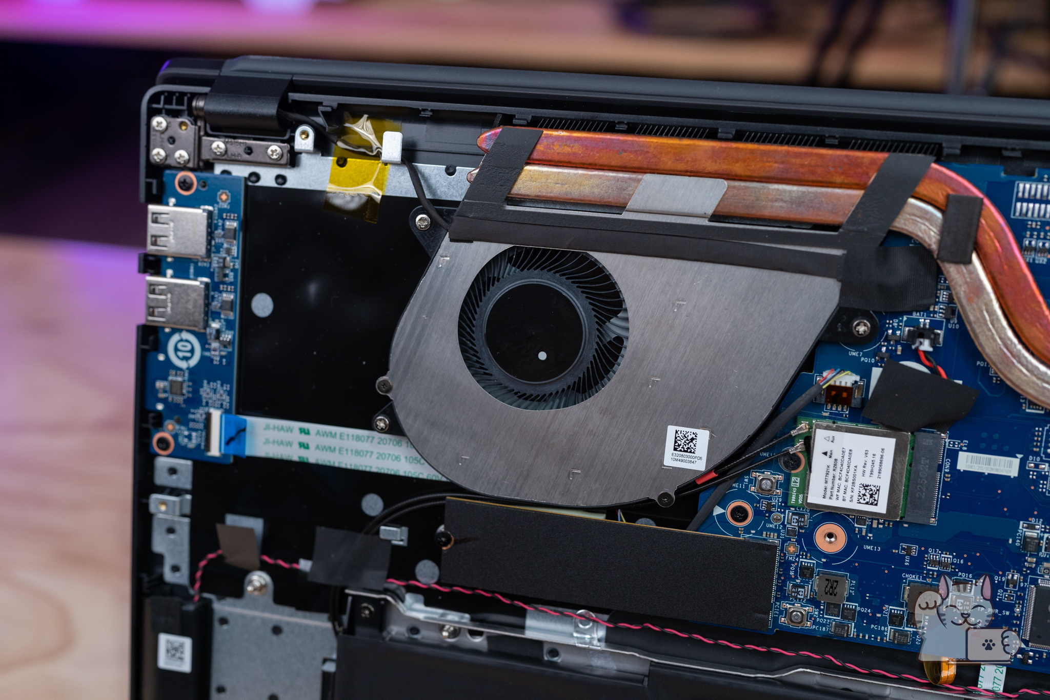ถ้าใครต้องการจะแกะทั้งฝาล่างทั้งหมดของ MSI Modern 15 เพื่ออัพเกรดหรือทำความสะอาดก็สามารถทำได้ง่ายๆ เพียงแค่ไขน็อตทั้งหมด หลังจากนั้นก็ค่อยๆ แงะแกะทีละส่วนขึ้นอย่างช้าๆ เพียงเท่านี้ก็จะแกะฝาล่างได้ไม่ยากเย็น ส่วนประกอบภายในอื่นๆ ที่มีงานประกอบเรียบร้อยดี ได้ระบบระบายความร้อนเป็นพัดลม 1 ตัว ฮีตไปป์23 เส้น พร้อมช่องระบายความร้อน 1 ช่อง ซึ่งการทดสอบบอกได้เลยว่าน่าประทับใจ แม้อาจจะดูไม่จัดเต็มเท่า Gaming แต่อุฯหภูมิก็เย็นพอตัวแล้ว