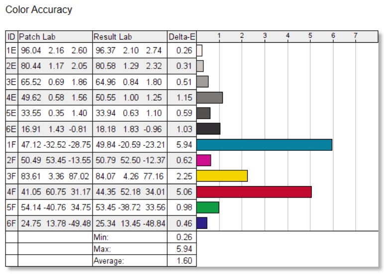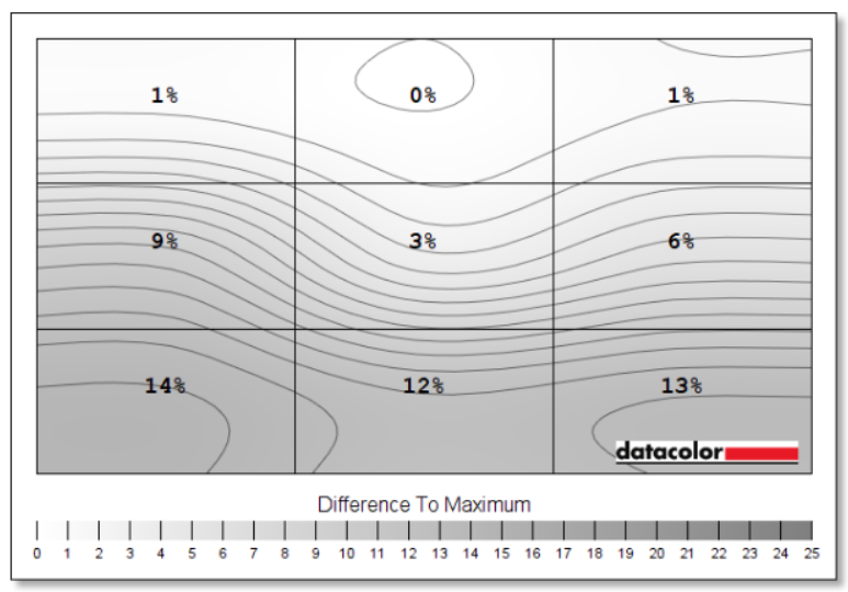 ความสว่างหน้าจอสูงสุดอยู่ที่เกือบๆ 250 cd/m2 ซึ่งจัดได้ว่าอยู่ในเกณฑ์มาตรฐานปกติ ความสว่างของหน้าจอตามตำแหน่งต่างๆ โดยแบ่งเป็น 9 ช่อง เทียบจากช่องกลางที่ปกติแล้วจะให้ความสว่างที่มากที่สุด ที่จะเห็นได้ว่าช่องตรงกลางมีค่า 0% ก็คือแสดงความสว่างได้เต็มที่ แต่สำหรับช่องล่างซ้ายจะมีแสงสว่างลดลงไปที่ 14% และค่าคลาดสีเฉลี่ยแล้วอยู่ที่ 1.60 สำหรับคนที่บังเอิญจำเป็นต้องใช้งานภาพถ่าย หรืองานกราฟิกอื่นๆ อาจจะไม่เหมาะเท่าไรนัก ปิดท้ายด้วยคะแนน 3.5