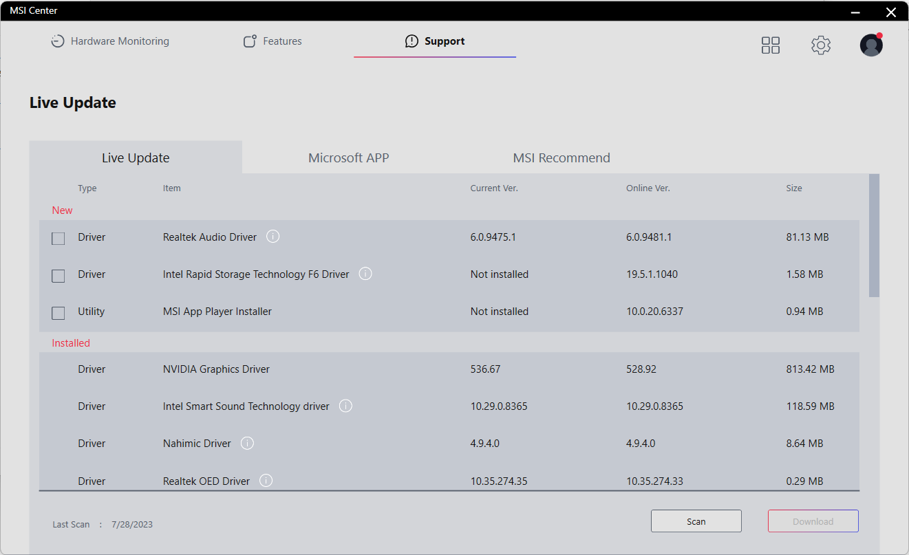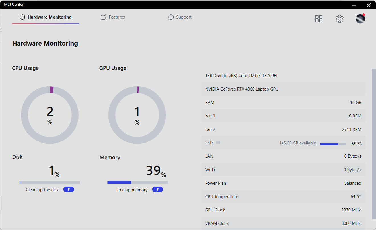 MSI Center เป็นโปรแกรมสำเร็จรูปที่ออกแบบและพัฒนาโดย MSI ซึ่งเป็นโปรแกรมที่ต่อยอดมาจากรุ่นก่อนหน้า คือ ใช้งานสะดวกและสามารถช่วยเหลือ และ จัดการการปรับแต่งตั้งค่า MSI Gaming Notebook ได้อย่างลงตัว ถือว่าเป็นอีกหนึ่งไฮไลน์ของทาง MSI ก็ว่าได้ ซึ่งแบ่งเป็นหมวดหมู่ต่างๆ เพื่อให้ง่ายต่อการใช้งาน โดยหน้าเมนูต่างๆ แบ่งตามลักษณะการใช้งานที่ชัดเจน รวมไปถึงการอัพเดทซอฟต์แวร์ต่างๆ และสามารถดูสภานะการทำงานได้ ซึ่งสามารถจัดการได้ง่ายยิ่งกว่าเดิมอีกด้วย