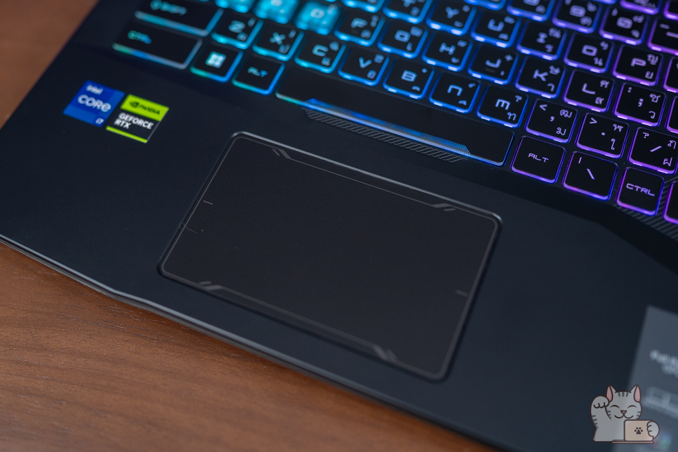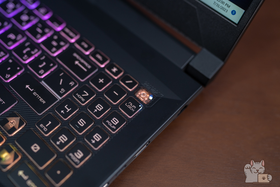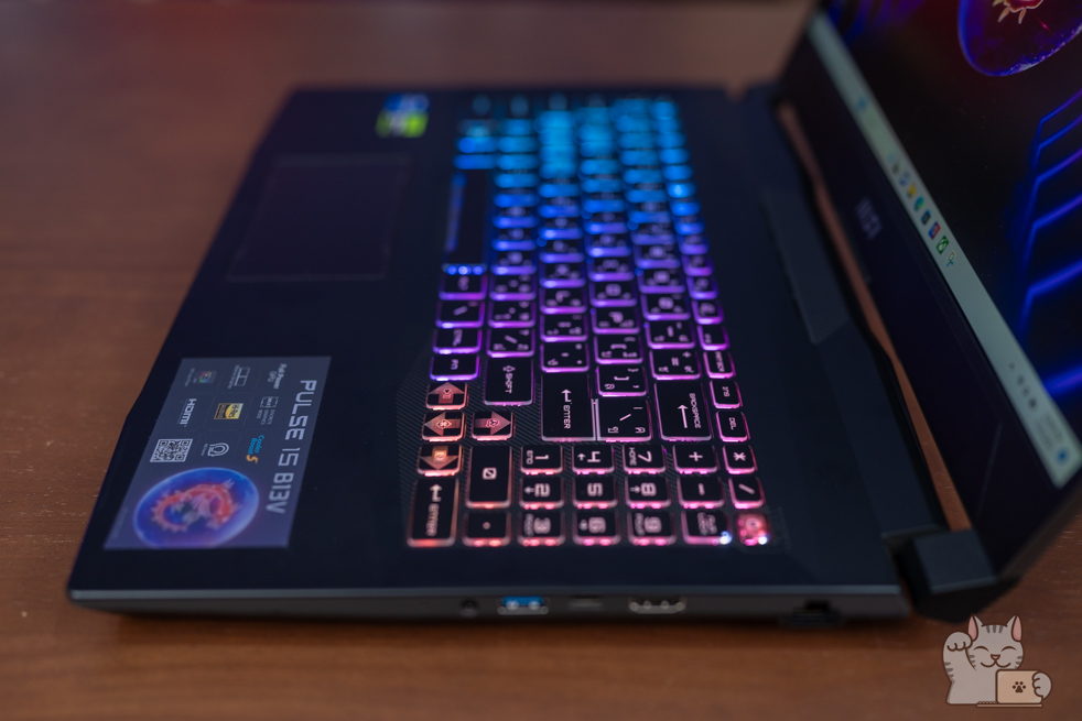 ตัวเครื่อง MSI Pulse 15 มาพร้อมกับหน้าจอใหญ่ถึง 15.6″ ซึ่งมีการติดตั้งคีย์บอร์ด Full Size โดยมีการติดตั้ง Numpad แป้นตัวเลขด้วย ให้ประสบการณ์ใช้งานที่ดี ทั้งฟีลแรงกด การตอบสนองของแป้นพิมพ์ และการใช้ปุ่มหลายๆ ปุ่มพร้อมกัน ซึ่งทำได้แม่นยำ มาพร้อมไฟ RGB แบบ 4 โซน บนเทคโนโลยี Silver Lining Print ที่สวยเสริมความสวยงามให้ไฟสี RGB สว่างน่าใช้มากยิ่งขึ้น ซึ่งจะเห็นถึง WASD / ปุ่มทิศทาง / ปุ่ม Power และขอบปุ่ม Spacebar เป็นแบบโปร่งแสงเข้ากับตัวเครื่อง เรียกได้ว่าดีกว่ารุ่นก่อนหน้า