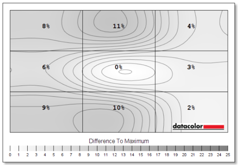 ความสว่างหน้าจอสูงสุดอยู่ที่เกือบๆ 350 cd/m2 ซึ่งจัดได้ว่าอยู่ในเกณฑ์มาตรฐานปกติ พอใช้งานในที่กลางแจ้งได้ ความสว่างของหน้าจอตามตำแหน่งต่างๆ โดยแบ่งเป็น 9 ช่อง เทียบจากช่องกลางที่ปกติแล้วจะให้ความสว่างที่มากที่สุด ที่จะเห็นได้ว่าช่องมุมซ้ายบนมีค่า 0% ก็คือแสดงความสว่างได้เต็มที่ แต่สำหรับช่องบนกลางจะมีแสงสว่างลดลงไปที่ 11%  และค่าคลาดสีเฉลี่ยแล้วอยู่ที่ 0.86 สำหรับคนที่บังเอิญจำเป็นต้องใช้งานภาพถ่าย หรืองานกราฟิกอื่นๆ อาจจะไม่เหมาะเท่าไรนัก ปิดท้ายด้วยคะแนน 4.0 อยู่ในเกณฑ์ที่ดี