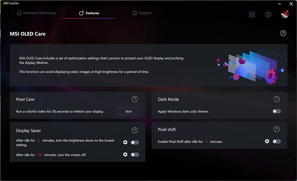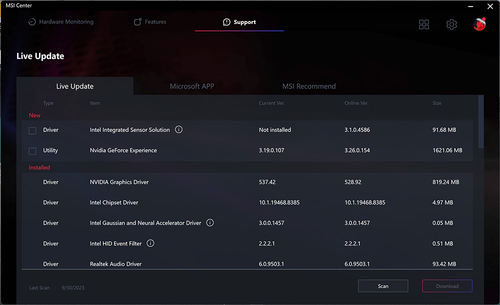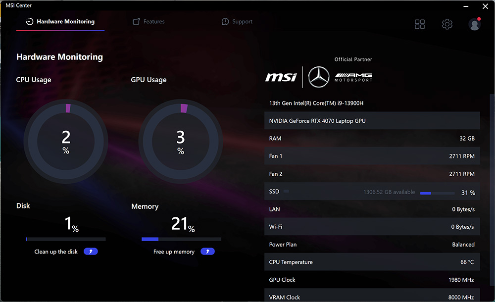 MSI Center เป็นโปรแกรมสำเร็จรูปที่ออกแบบมาเป็นอย่างดี ซึ่งเป็นโปรแกรมที่ต่อยอดมาจากรุ่นก่อนๆ คือ ใช้งานสะดวก สามารถช่วยเหลือ จัดการการปรับแต่งตั้งค่า MSI Notebook ได้อย่างลงตัว พร้อมได้ธีมที่เข้ากับตัวเครื่อง ถือว่าเป็นอีกหนึ่งไฮไลน์ของทาง MSI ซึ่งแบ่งเป็นหมวดหมู่ต่างๆ เพื่อให้ง่ายต่อการใช้งาน โดยหน้าเมนูต่างๆ แบ่งตามลักษณะการใช้งานที่ชัดเจน รวมไปถึงการอัปเดทซอฟต์แวร์ต่างๆ และสามารถดูสภานะการทำงานได้ ซึ่งสามารถจัดการได้ง่ายยิ่งกว่าเดิมอีกด้วย