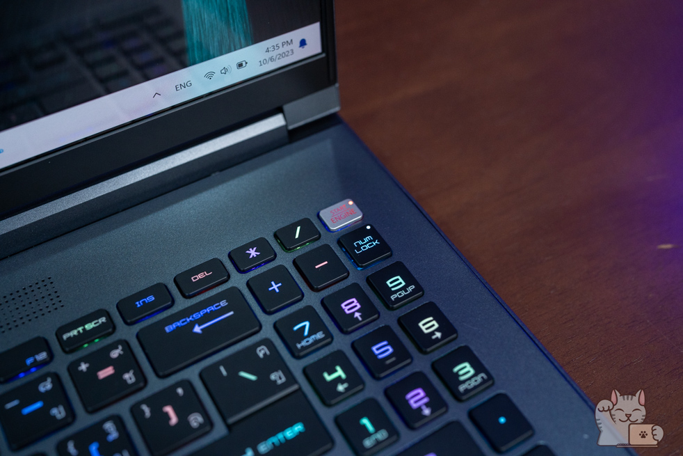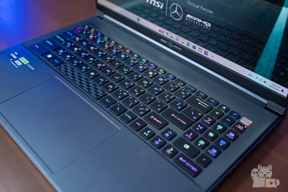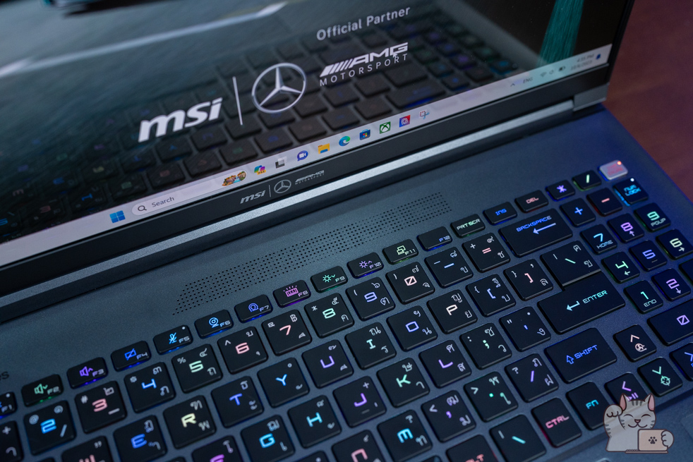 คีย์บอร์ด MSI Stealth 16 Mercedes-AMG Motorsport ต้องบอกว่าแตกต่างจาก Gaming Notebook ทั่วไป จากการที่ใช้ไฟ RGB แบบ Per-key จาก SteelSeries โดยพัฒนาและออกแบบมาให้ MSI โดยเฉพาะ ทั้งอารมณ์การตอบสนองของแป้นพิมพ์ แรงกด และการใช้ปุ่มหลายๆ ปุ่มพร้อมๆ กัน ที่ไฟ RGB สามารถตามใจของผู้ใช้หลากหลายรูปแบบ และยังปรับแต่ง Macro Keys บนคีย์บอร์ดเพื่อใช้ในเกมหรือซอฟแวร์ต่างๆ ผ่าน MSI Centerได้ด้วยเช่นกัน แน่นอนมีแป้น Numpad ด้วย แต่ก็อาจจะแคบหน่อย จากการที่ตัวเครื่องมีมิติที่เล็ก