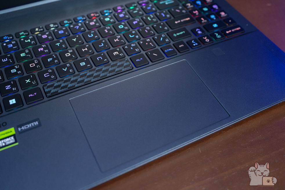 ทัชแพดมีขนาดใหญ่ ถ้าเทียบกับรุ่นปีก่อนๆ โดยดูเป็นเนื้อเดียวกับตัวเครื่อง แต่สัมผัสจะให้ความลื่นไหลมากกว่า ตัวปุ่มคลิกเป็นแบบชิ้นเดียวกับทัชแพด เข้ากับตัวเครื่องโดยรวม โดยการควบคุมสามารถทำได้เป็นอย่างดี ส่วนปุ่มคลิกทั้งซ้ายขวาก็อาจจะมีความแข็งพอดีๆ การใช้งานโดยจัดได้ว่าอยู่ในระดับลงตัว ใช้งานได้สะดวกสำหรับการวางบนตัก หรือเล่นในร้านกาแฟ โดยการควบคุมมีการตอบสนองได้ดี พร้อมรองรับ Multi Gesture ลื่นไหล ทำงานร่วมกับ Windows 11 Home ได้เป็นอย่างดี และ Fingerprint ก็มีการติดตั้งไว้ข้างๆ กันด้วย