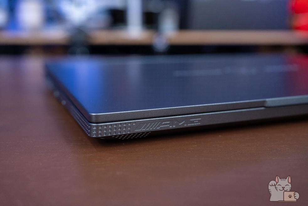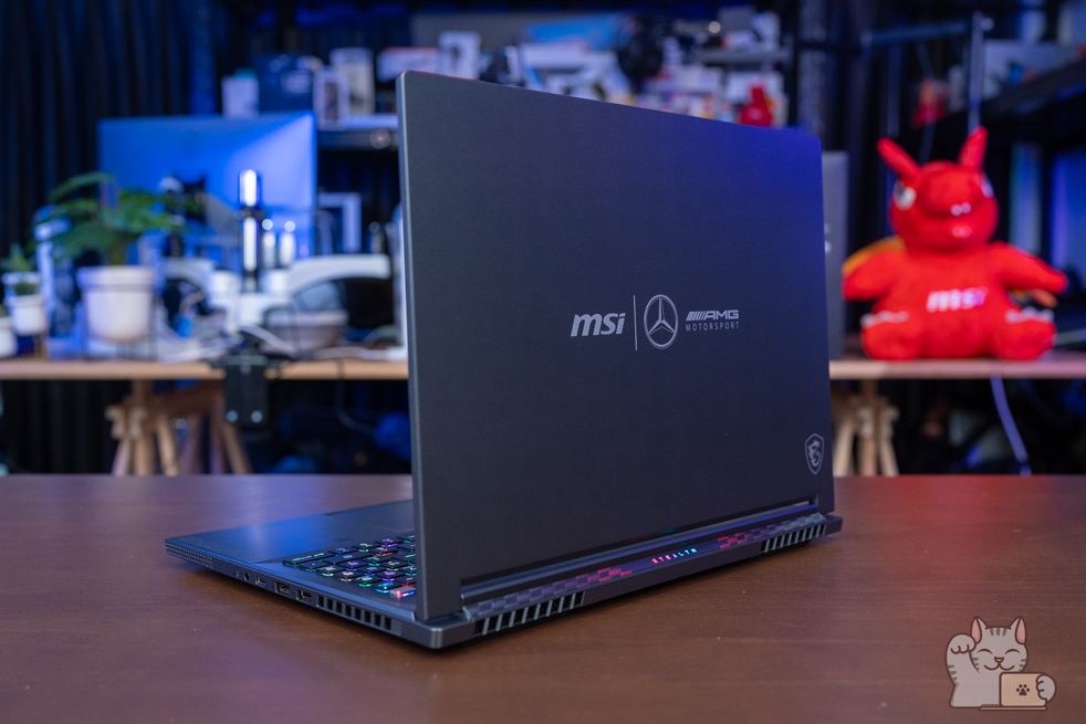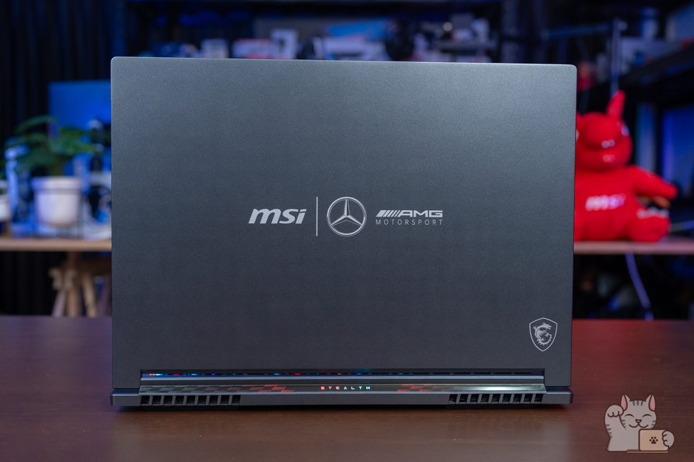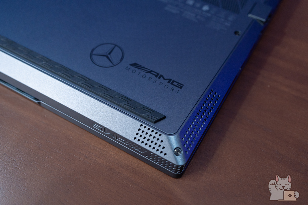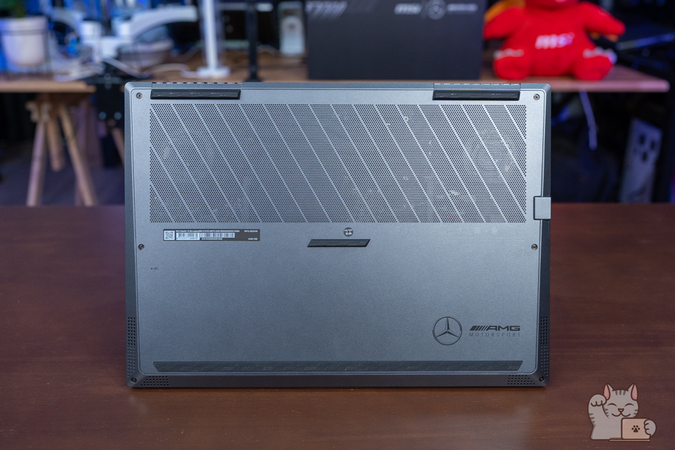 ที่สำคัญยังมีรายละเอียดอื่นๆ ทั้งไฟด้านหลังตัวเครื่อง และโลโก้ MSI x Mercedes-AMG อยู่หลายตำแหน่งของเครื่องถ้าฝาหลังด้านใน ส่วนขอบหน้าจอมุมซ้ายขวาก็มี AMG ที่ด้านซ้าย และ MSI ที่มุมขวา ให้ความแตกต่างจาก MSI Notebook รุ่นอื่นๆ อีกด้านฐานล่างตัวเครื่องดูแล้วเป็นหนึ่งด้วยกับตัวเครื่องกับงานประกอบที่เรียบร้อย พร้อมมียางรองช่วยยกตัวเครื่องให้สูงขึ้น ช่วยส่งมวลลมเย็นถูกดูดเข้าช่องลมขนาดใหญ่ได้มากขึ้นส่งผลให้มีประสิทธิภาพในการระบายความร้อนที่ดี สมกับเป็น Notebook รุ่นระดับบนรุ่นพิเศษของแบรนด์