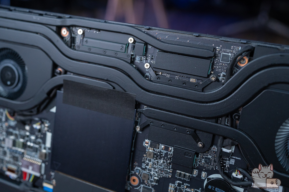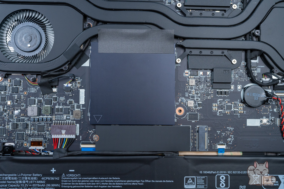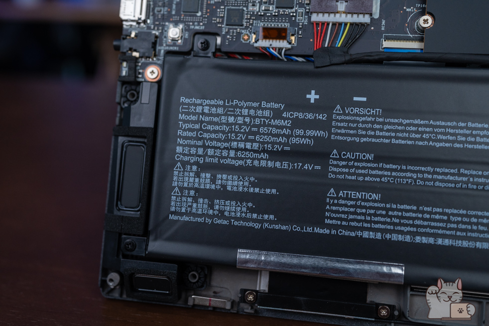 การแกะอัปเกรดต้องแกะฝาล่าง MSI Stealth 16 Mercedes-AMG Motorsport ซึ่งการแกะฝาล่างนั้นไม่ยุ่งยาก เพียงไขน๊อตประมาณ 10 ตัว โดยเมื่อแกะออกมาแล้ว ก็จะเป็นอุปกรณ์ฮาร์ดแวร์ภายในทั้งหมด ติดตั้งแรมมาแล้วขนาด 32GB DDR5 Bus 5200 MHz เป็น 16GB จำนวน 2 แถว (Max 64GB) ที่รองรับการใช้งานได้แบบสบายชัวร์ๆ โดยมีกรอบโลหะครอบเอาไว้อยู่ ส่วน SSD M.2 NVMe PCIe Gen 4 ความจุ /TB จำนวน 1 ตัว พร้อมมี Slot อัปได้อีก 1 ตัวทันที และ แบตเตอรี่ก้อนใหญ่ และลำโพง 6 ตัวคุณภาพสูง ที่ติดตั้งไว้ฝั่งละ 3 ตัว