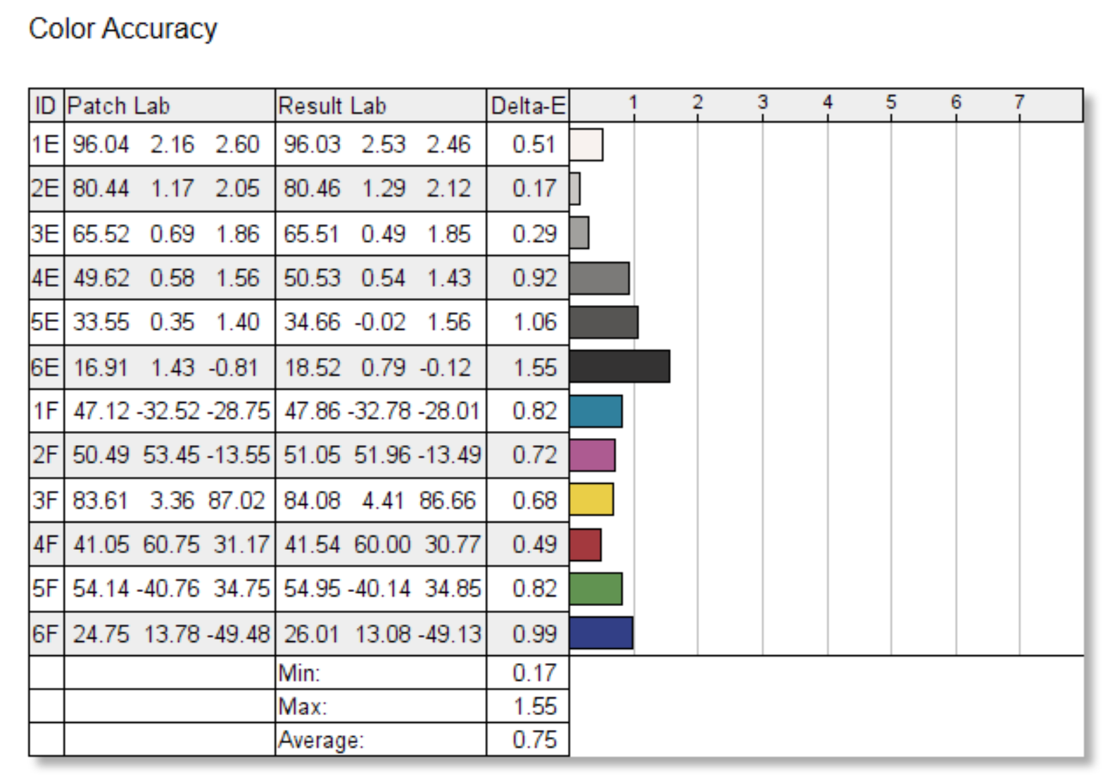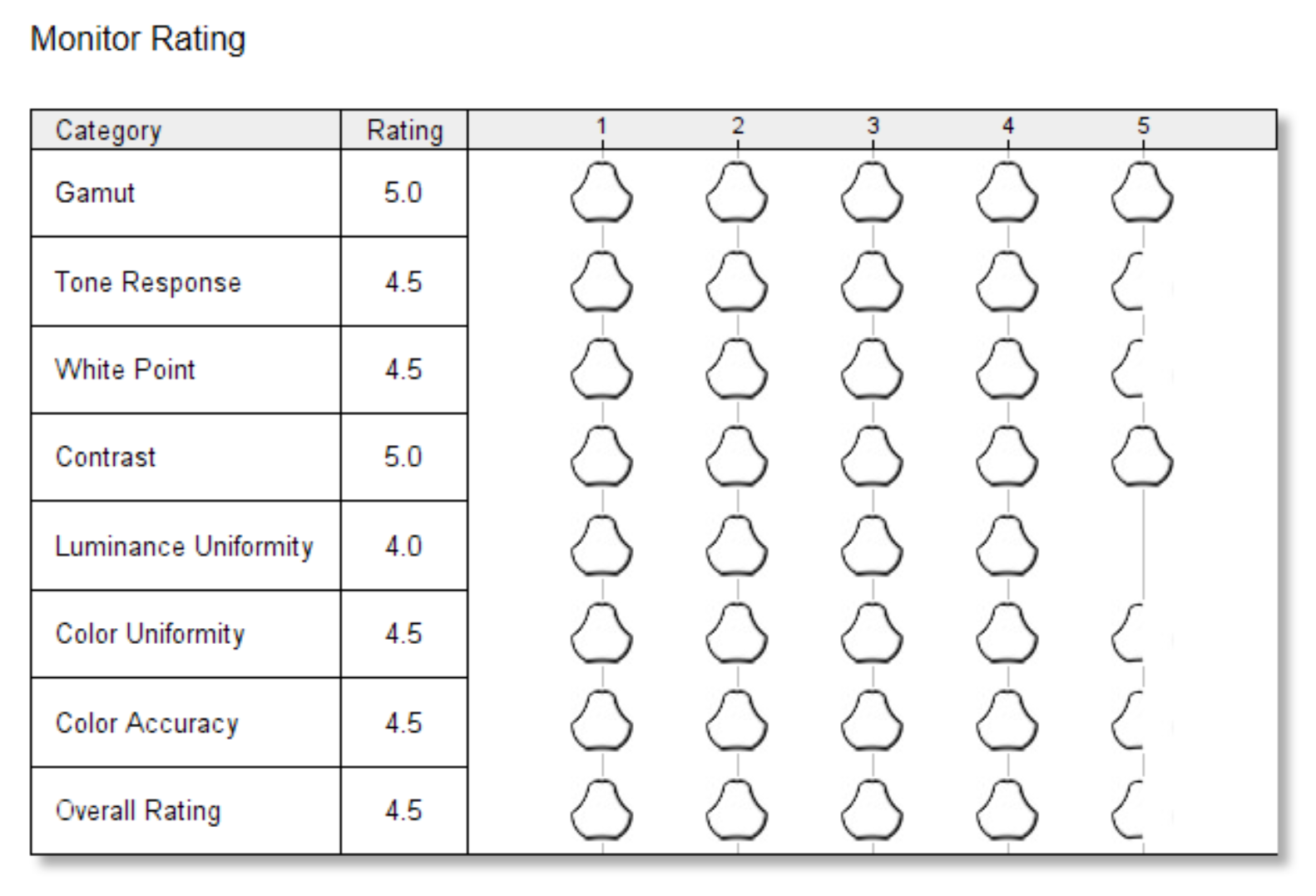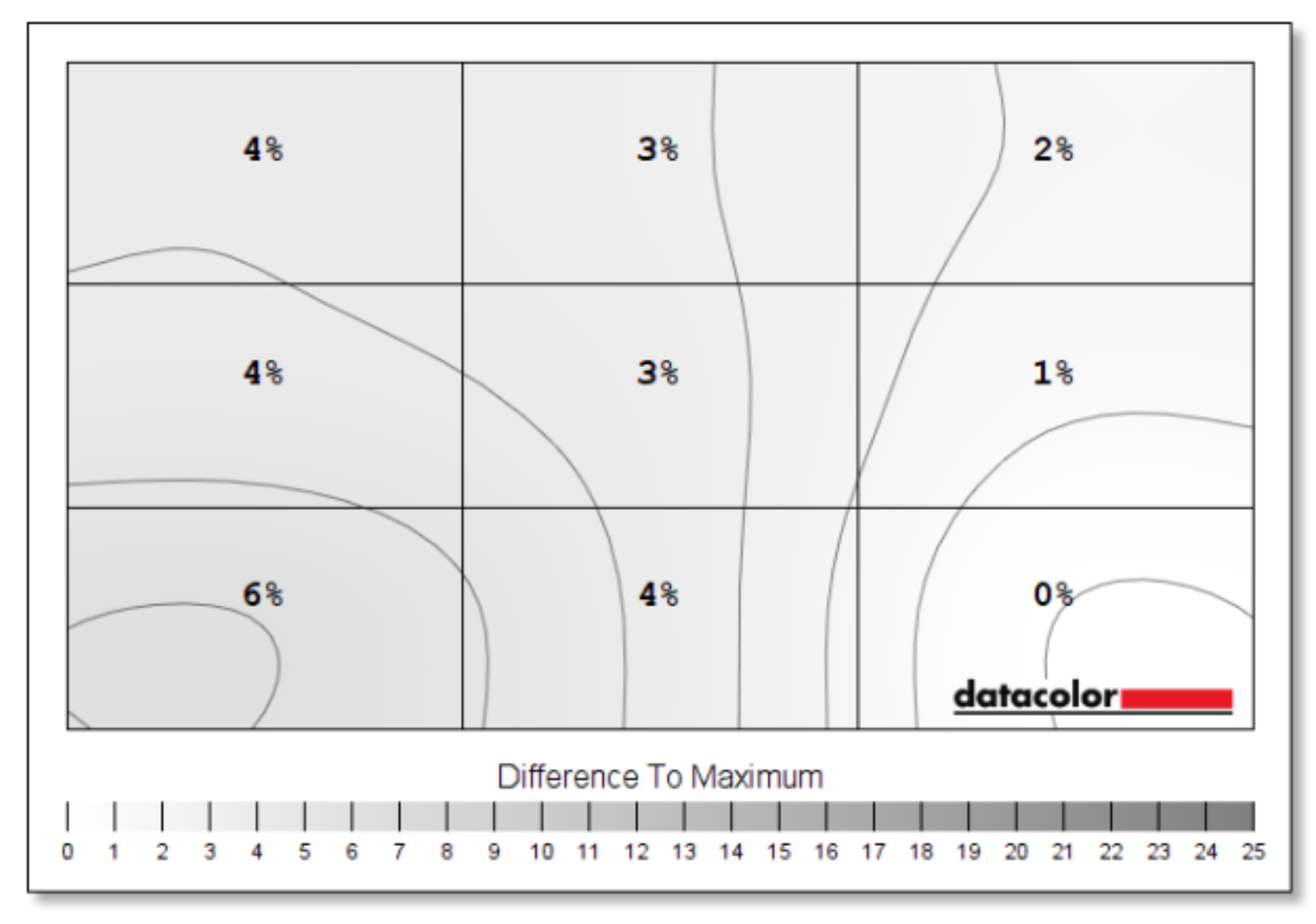 ความสว่างหน้าจอสูงสุดอยู่ที่เกือบๆ 500 cd/m2 ซึ่งจัดได้ว่าอยู่ในเกณฑ์ดีกว่ามาตรฐาน ความสว่างของหน้าจอตามตำแหน่งต่างๆ โดยแบ่งเป็น 9 ช่อง ก็จะเห็นได้ว่าช่องมุมขวาล่างมีค่า 0% ก็คือแสดงความสว่างได้เต็มที่ แต่สำหรับช่องมุมซ้ายล่างจะมีแสงสว่างลดลงไปที่ 6% และค่าคลาดสีเฉลี่ยแล้วอยู่ที่ 0.75 สำหรับคนที่บังเอิญจำเป็นต้องใช้งานภาพถ่าย หรืองานกราฟิกอื่นๆ อาจจะไม่เหมาะเท่าไรนัก ปิดท้ายด้วยคะแนน 4.5 อยู่ในเกณฑ์ที่ดี เอาไปใช้งานสาย Creator แบบมืออาชีพมั่นใจได้ หรือจะใช้งานทั่วไปก็นับว่าเป็นหน้าจอที่ดีมากๆ