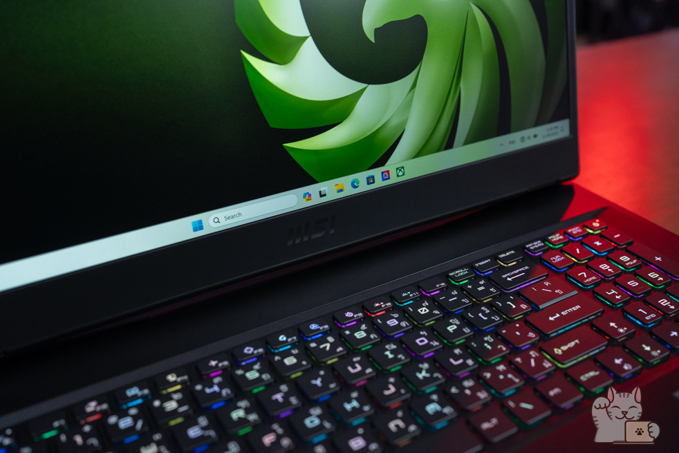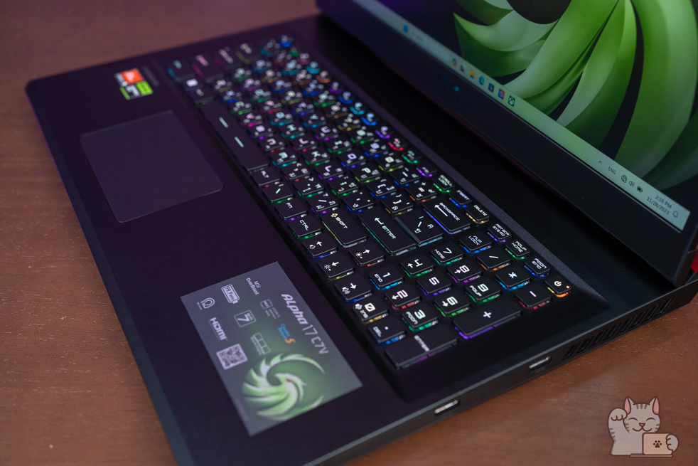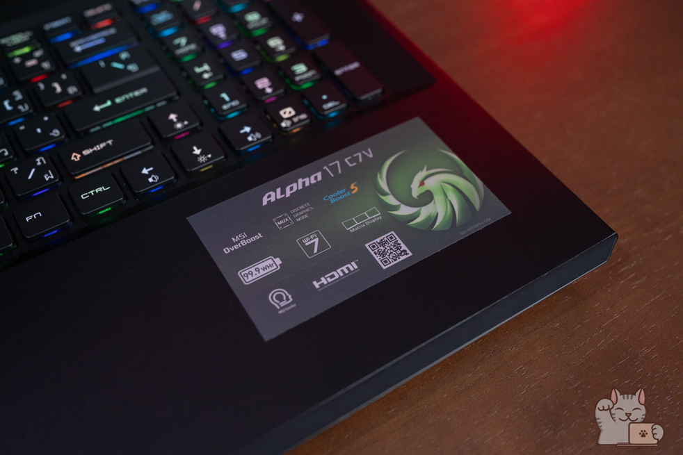 ฝาหลังก็สื่อความเป็นโน๊ตบุ๊คเล่นเกมได้เต็มเปี่ยมถูกใจคอเกมอย่างสุดๆ ด้วยโลโก้นก Thunderbird ที่เป็นแบบนู้นต่ำลงไป พร้อมกันนั้นในส่วนของขอบตัวเครื่องทั้งด้านซ้ายขวาและด้านหน้ามีเหลี่ยมสันที่ลงตัว ส่วนที่พักมือและเนื้องานรอบแป้นพิมม์ใช้วัสดุอะลูมเนียมแบบเดียวกับฝาหลัง ทำงานร่วมกับไฟคีย์บอร์ด RGB Pre-Key เป็นอย่างดี สำหรับ MSI Alpha 17 C7V เป็น Gaming Notebook ระดับสูง หน้าจอขนาด 17″ ดีไซน์ขอบบางพิเศษ ทำให้มีความกระชับกว่ารุ่นจอ 17.3 ในรุ่นก่อนๆ