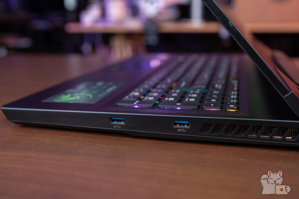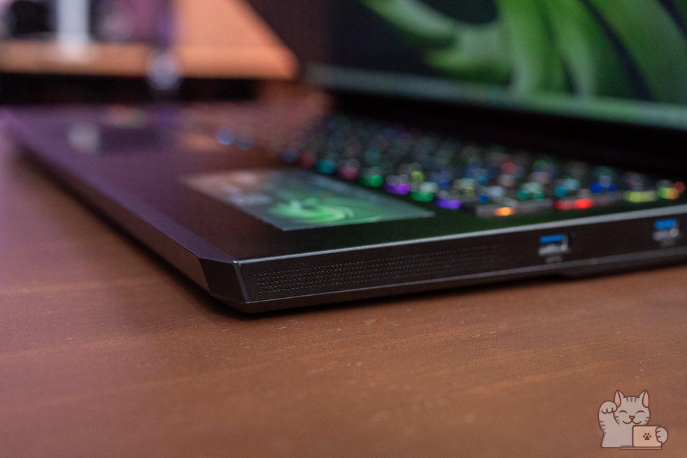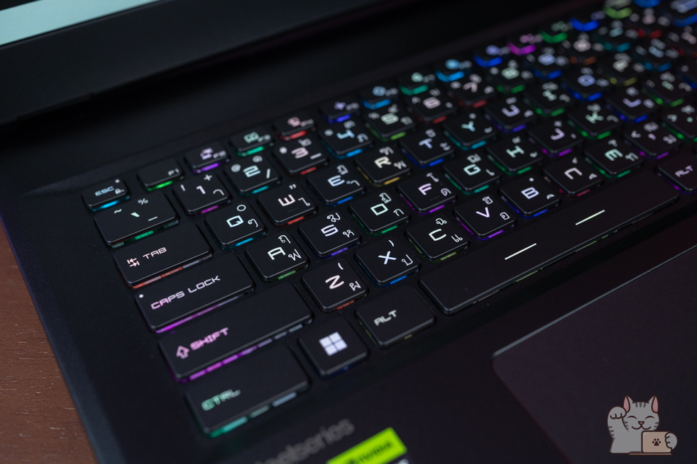 รวมไปถึงในการกดปุ่ม Fn แต่ละครั้ง ไฟทั้งหมดจะดับลง พร้อมไฮไลน์เป็นไฟสีแดงให้เด่นขึ้นมาชัดเจนว่าเราใช้าน Hot Key อะไรได้บ้าง ได้ปุ่มโปร่งแสงตามตัวอักษรเพิ่มความสวยงาม อีกทั้งปุ่ม Power บอกสถานะการใช้การ์ดจอ (ขาว = ออนชิป / ส้ม = แยก) ทัชแพดมีขนาดที่ค่อนสมส่วนกับตัวเครื่อง ส่วนดีไซน์นั้นก็ใช้เป็นแบบซ่อนปุ่ม โดยการควบคุมสามารถทำได้เป็นอย่างดีรวมไปถึงปุ่มคลิกทั้งซ้ายขวาก็มีความนุ่มและเด้งรับได้น่าประทับใจ สัมผัสไม่เป็นรอยนิ้วมือได้ง่ายและควบคุมได้แม่นยำ