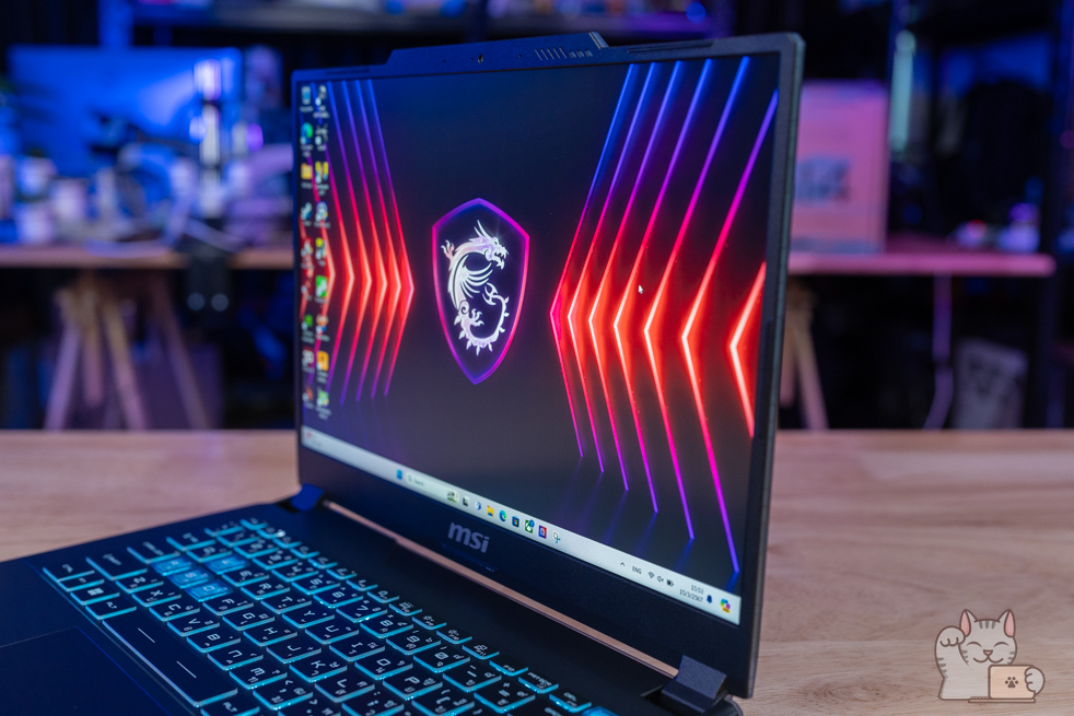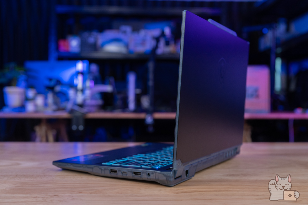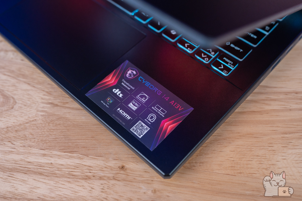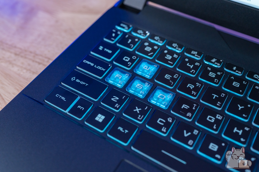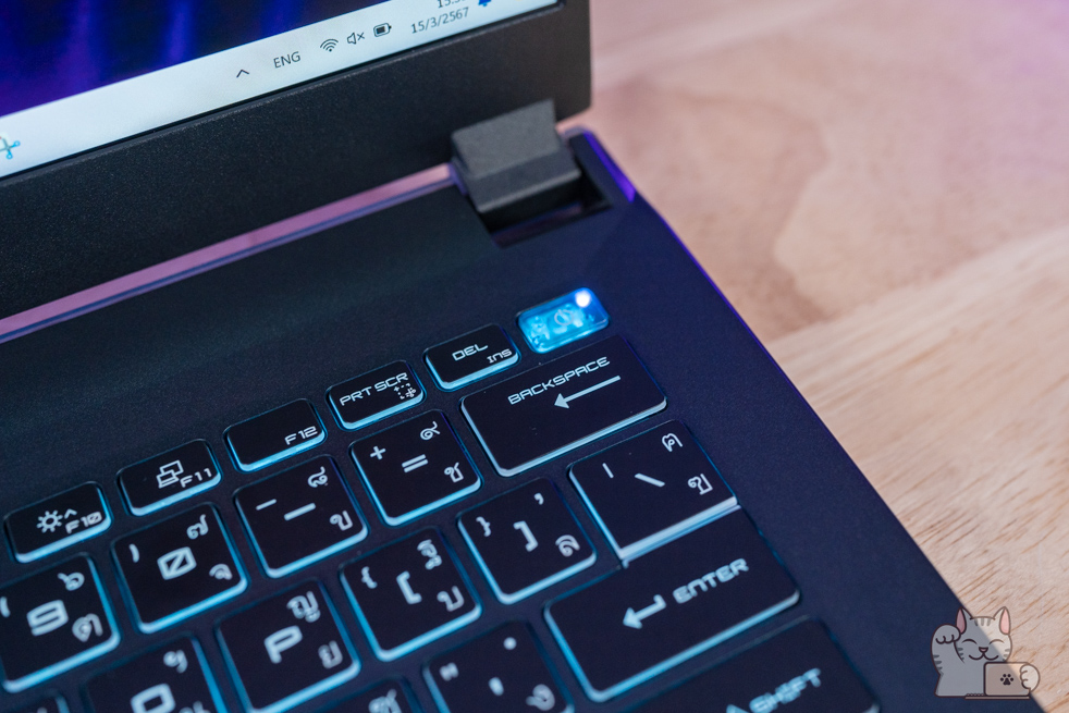 การมาของ MSI Cyborg 14 โดดเด่นด้วยหน้าจอขนาด 14″ พาเนล IPS ความละเอียด Full HD+ ที่รองรับ Refresh Rate 144Hz ให้ความลื่นไหล ค่าสี sRGB 100% แรมขนาด 16GB DDR5 Bus 5200 MHz (8GB x 2 ตัว) และ SSD M.2 NVMe PCIe Gen 4 ที่ 512GB – 1TB พร้อมรองรับการทำงานหรือเล่นเกมอย่างไม่มีสะดุด ในส่วนของไฟคีย์บอร์ดได้เป็นสีฟ้า ตอกย้ำความเป็น MSI Gaming ที่ ได้รับการตอบรับดีที่มาก ๆ ตอบสนองทุกการใช้งานได้อย่างราบรื่น รวดเร็ว โดยมีการติดตั้งไฟคีย์บอร์ดแบบสีฟ้าโดดเด่น กับความโปร่งแสงในหลายๆ จุด ทั่วตัวเครื่อง ฝาหลังเป็นโลหะ ต่อยอดมาจาก Cyborg 15 นั่นเอง