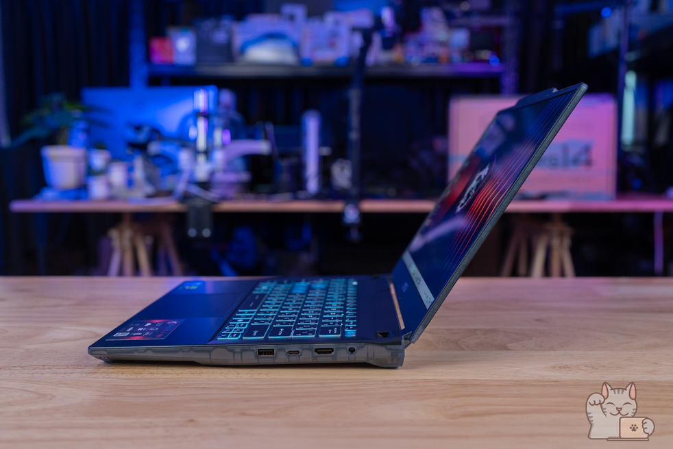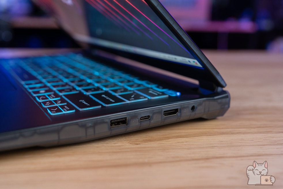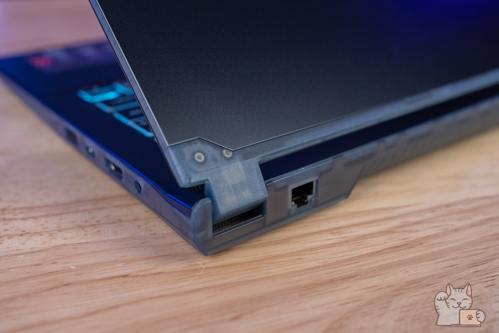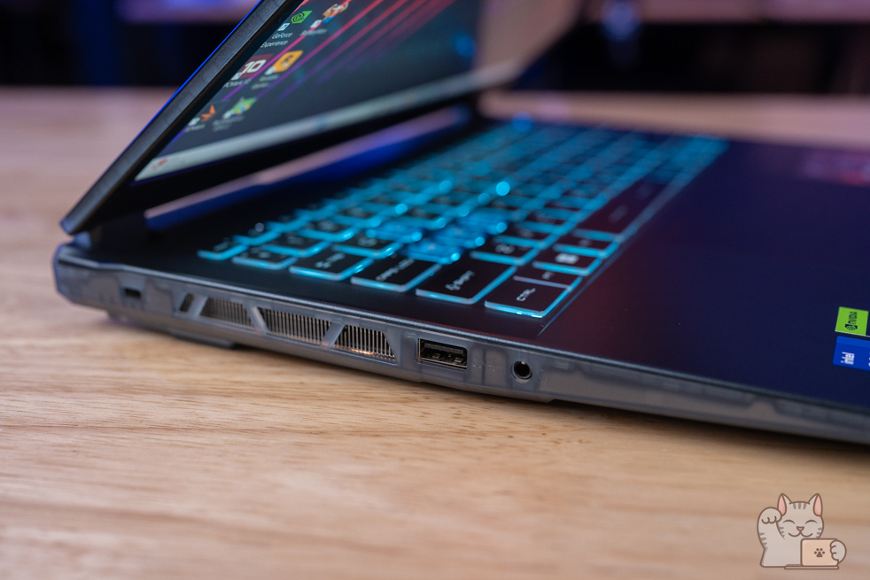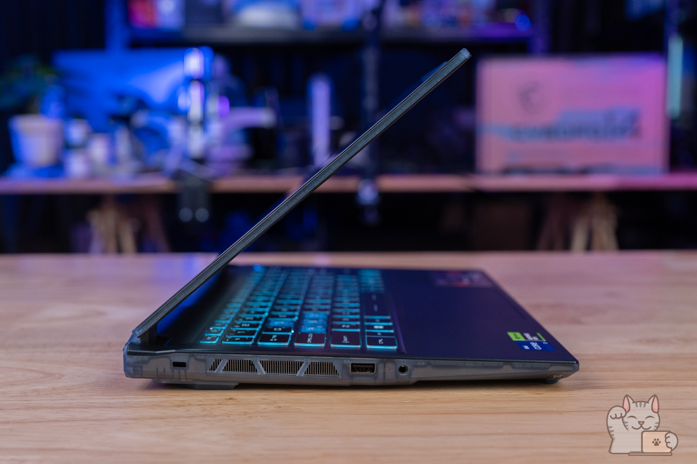 เป็น Gaming Notebook หน้าจอ 14″ ที่มีพอร์ตเชื่อมต่อที่ครบครัน ไม่ว่าจะเป็น 2 x USB 3.2 Type-A Gen 1, USB 3.2 Type-C Gen 2 แบบรองรับการต่อจอแยกได้ด้วยมาตรฐาน DisplayPort ทำให้สะดวกในการใช้งาน นอกจากนี้ยังมี HDMI, ช่องหูฟังกับไมค์แบบ Combo ที่สำคัญคือได้ LAN RJ-45 เพื่อการเชื่อมต่อ Network หรืออินเตอร์เน็ตแบบมีสาย อย่างไรก็ตามพอร์ตการเชื่อมต่ออาจจะดูไม่เยอะเท่าไร อีกทั้งไม่มี Card Reader เลย ส่วนเชื่อมต่อไร้สายด้วย Wi-Fi 6E + Bluetooth 5.3