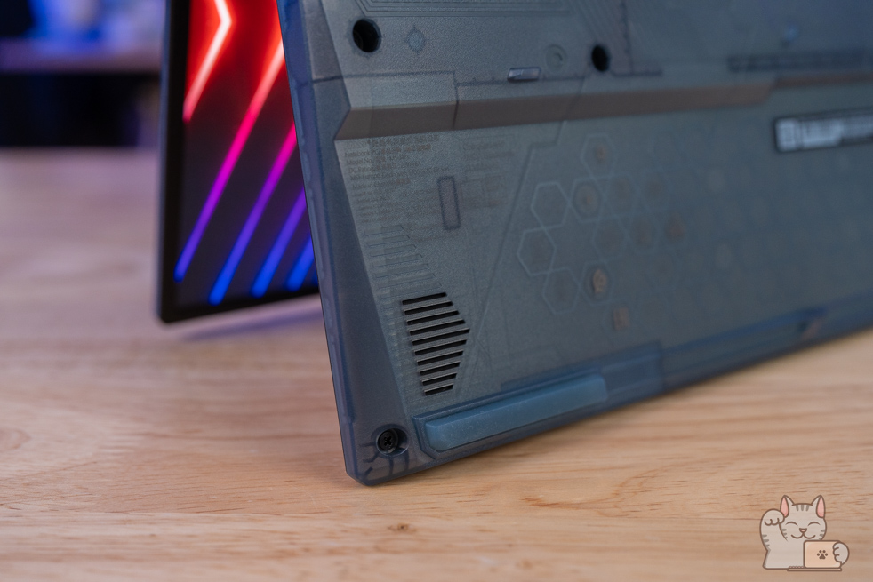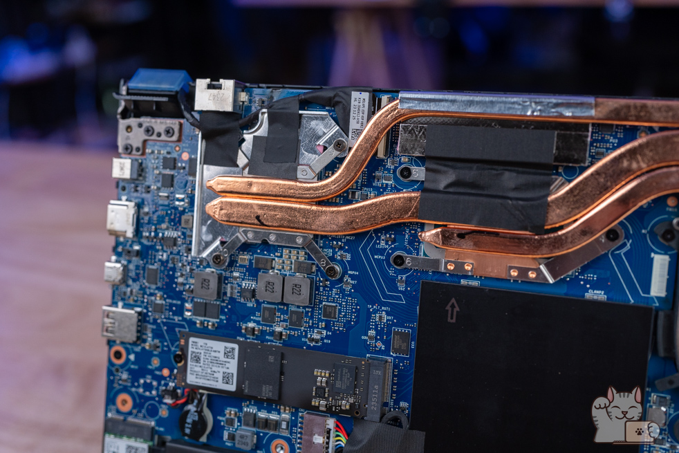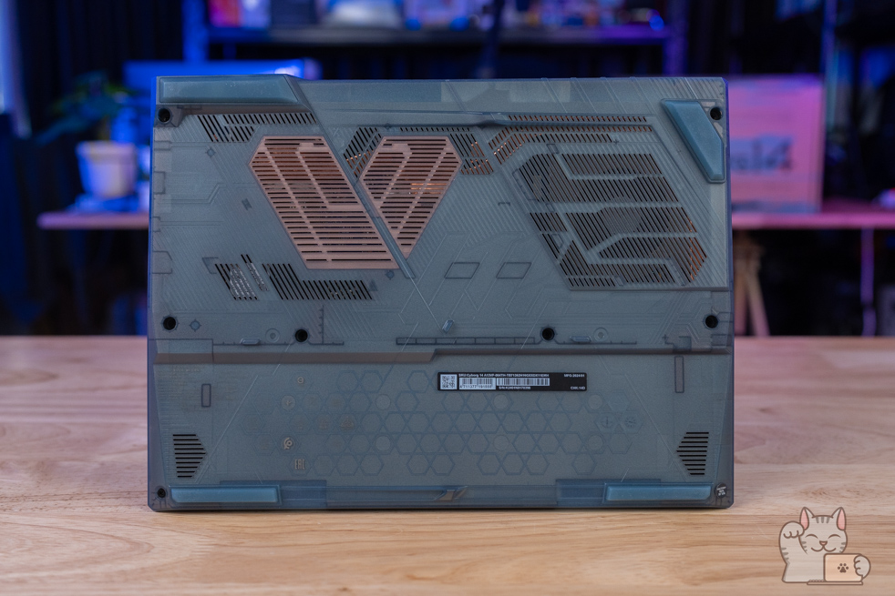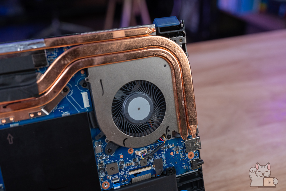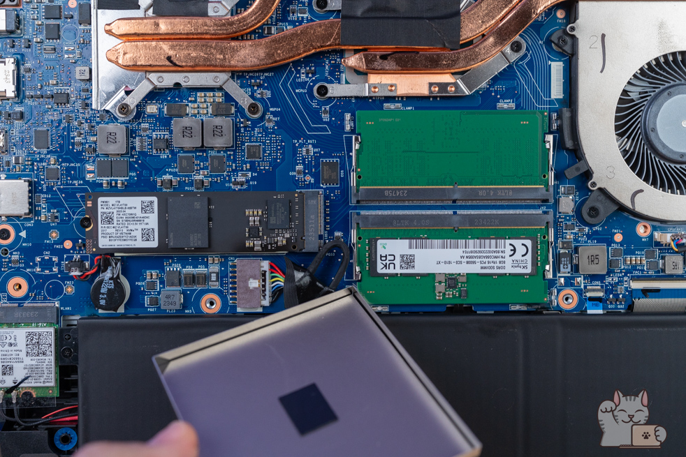 การแกะอัปเกรดต้องแกะฝาล่าง ซึ่งการแกะฝาล่างนั้นไม่ยุ่งยาก เพียงไขน๊อตประมาณ 10 ตัว โดยเมื่อแกะออกมาแล้ว ก็จะเป็นอุปกรณ์ฮาร์ดแวร์ภายในทั้งหมด ติดตั้งแรมมาแล้วขนาด 16GB DDR5 Bus 5200 MHz เป็น 8GB จำนวน 2 แถว ที่รองรับการใช้งานได้แบบสบายชัวร์ๆ โดยมีกรอบโลหะครอบเอาไว้อยู่ ส่วน SSD M.2 NVMe PCIe Gen 4 ความจุ 1TB จำนวน 1 ตัว และแบตเตอรี่ 53.3 Wh และลำโพง 2 ตัว พร้อมพัดลมระบายความร้อน 2 ตัวที่ทำงานฮีตไปป์แบบ 3 เส้นขนาดใหญ่